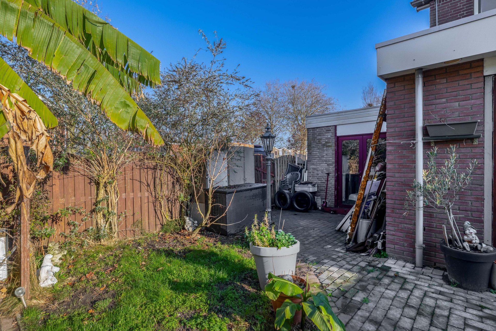 De achtertuin ligt op het westen, wat betekent dat je hier vooral in de middag en avond van de zon geniet. Een heerlijke plek om buiten te eten of lekker te ontspannen. De tuin is grotendeels bestraat en dus onderhoudsvriendelijk. Achterin de tuin staat een berging en via de zijkant heb je directe toegang tot de ruime garage. Aan de voorzijde biedt de oprit plek voor meerdere auto’s op eigen terrein, geen gedoe met parkeren dus. De ligging op de hoek zorgt bovendien voor extra privacy en een vrijer gevoel.