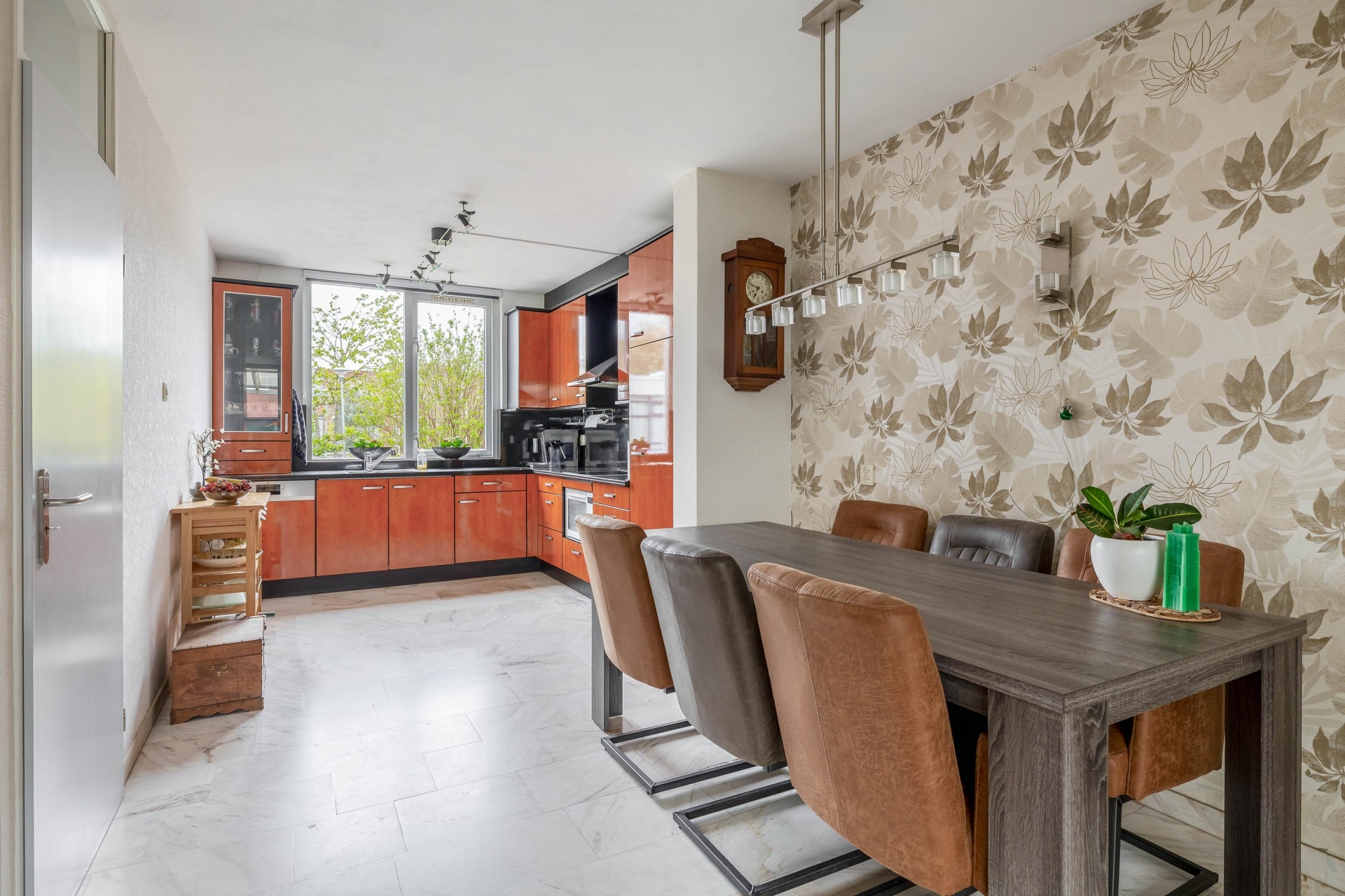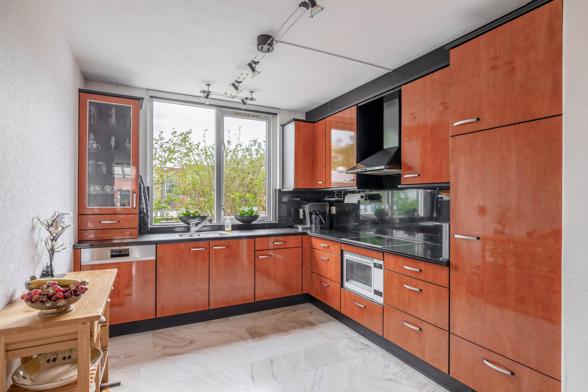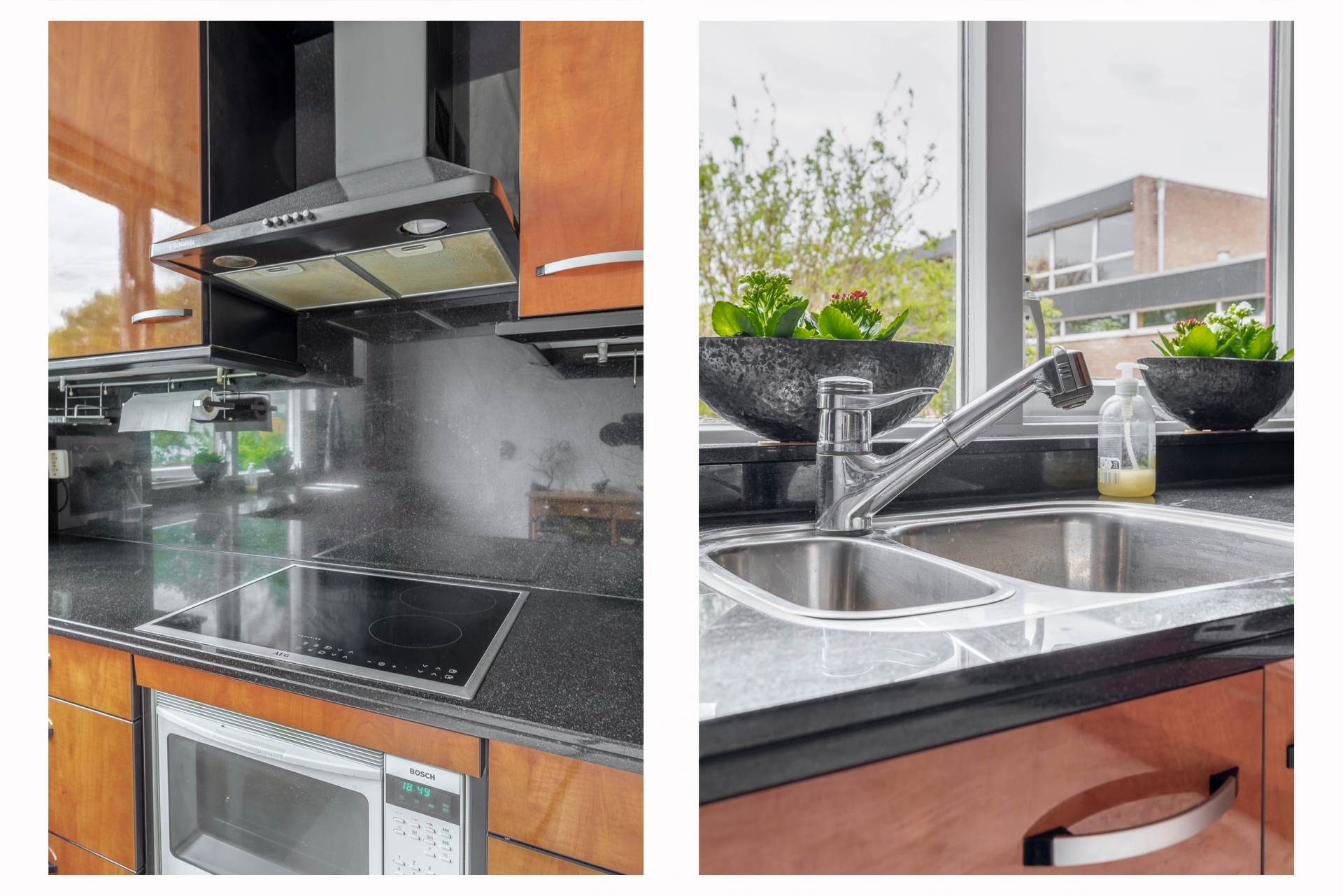 De open keuken is voorzien van een ruime hoekopstelling met diverse inbouwapparatuur, waaronder een combimagnetron, koel-/vriescombinatie en vaatwasser. Dankzij de slimme indeling en voldoende kastruimte kook je hier met plezier.