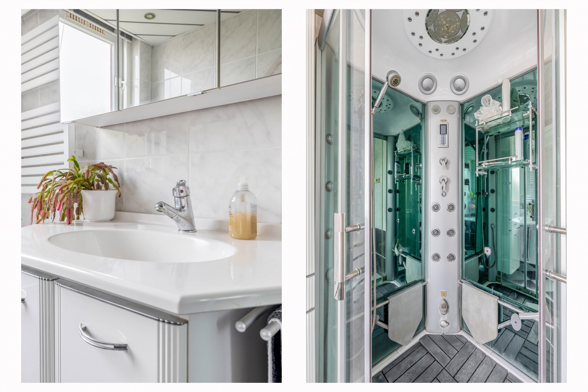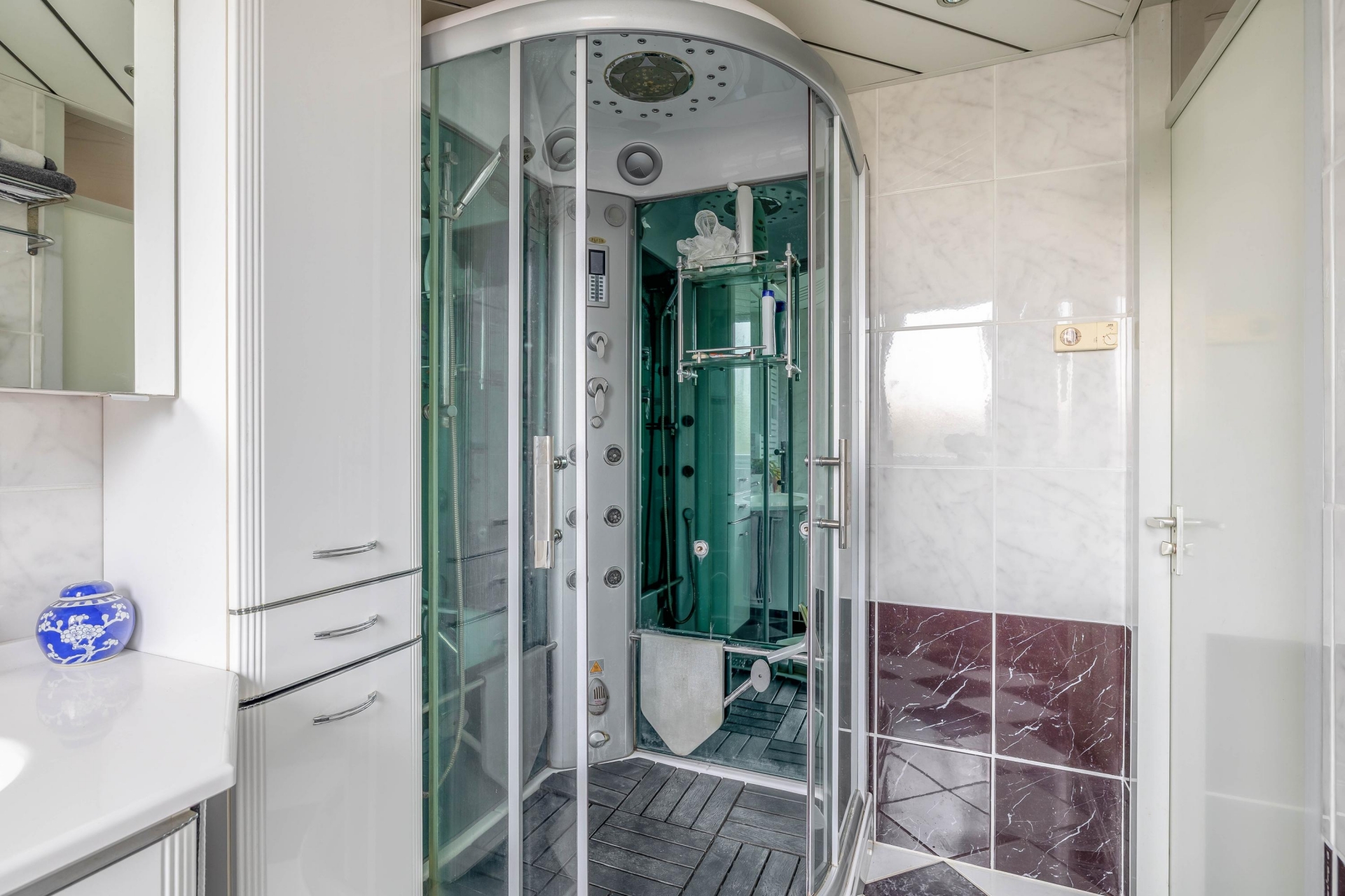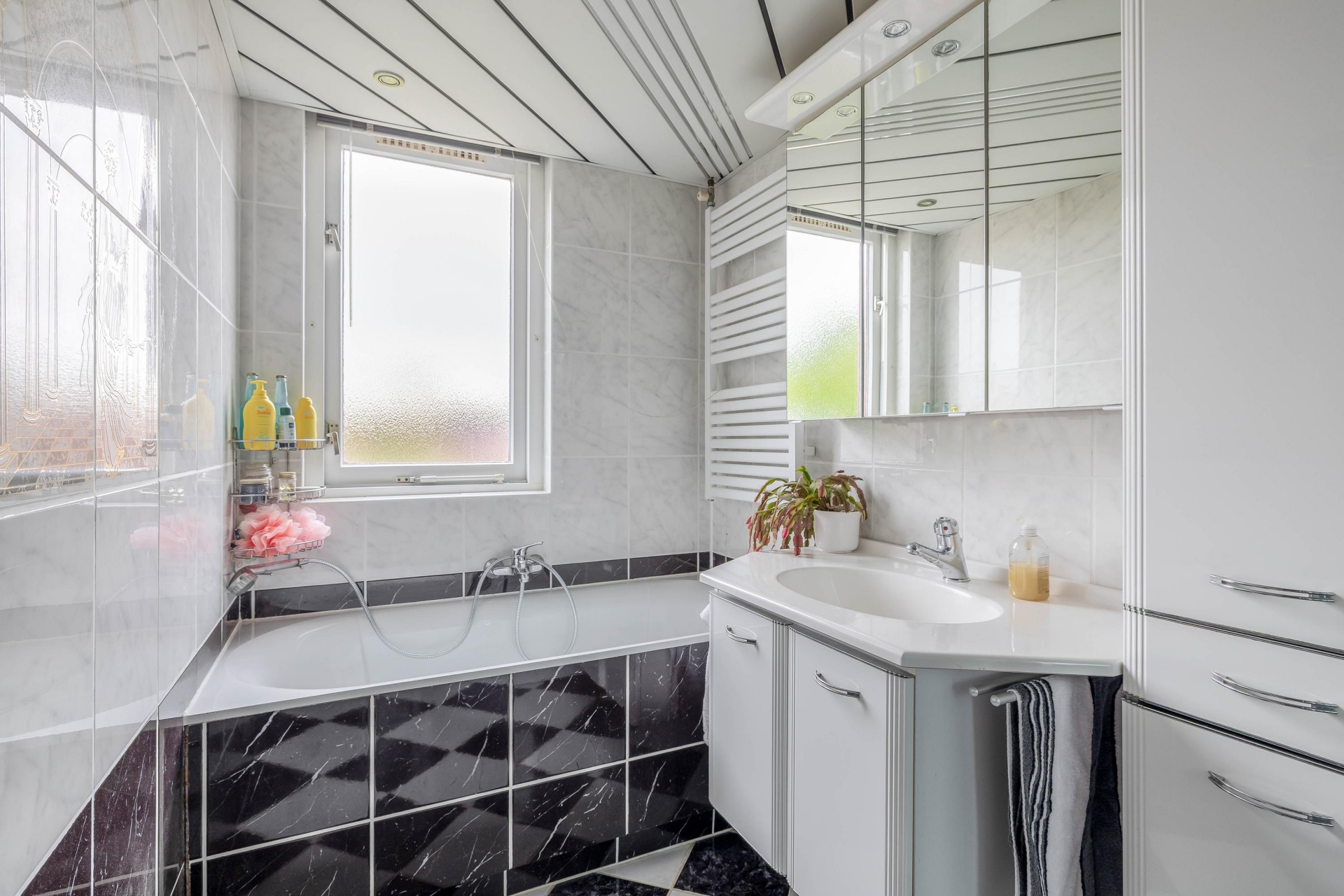 De geheel betegelde badkamer is compleet uitgevoerd met een ligbad, douche, wastafelmeubel en elektrische vloerverwarming – een heerlijke plek om te ontspannen.
