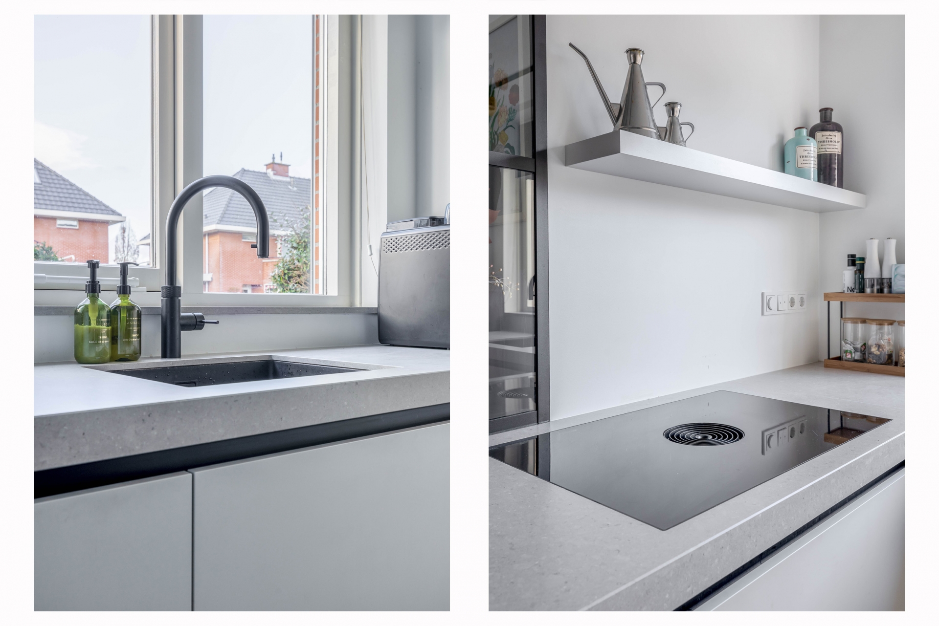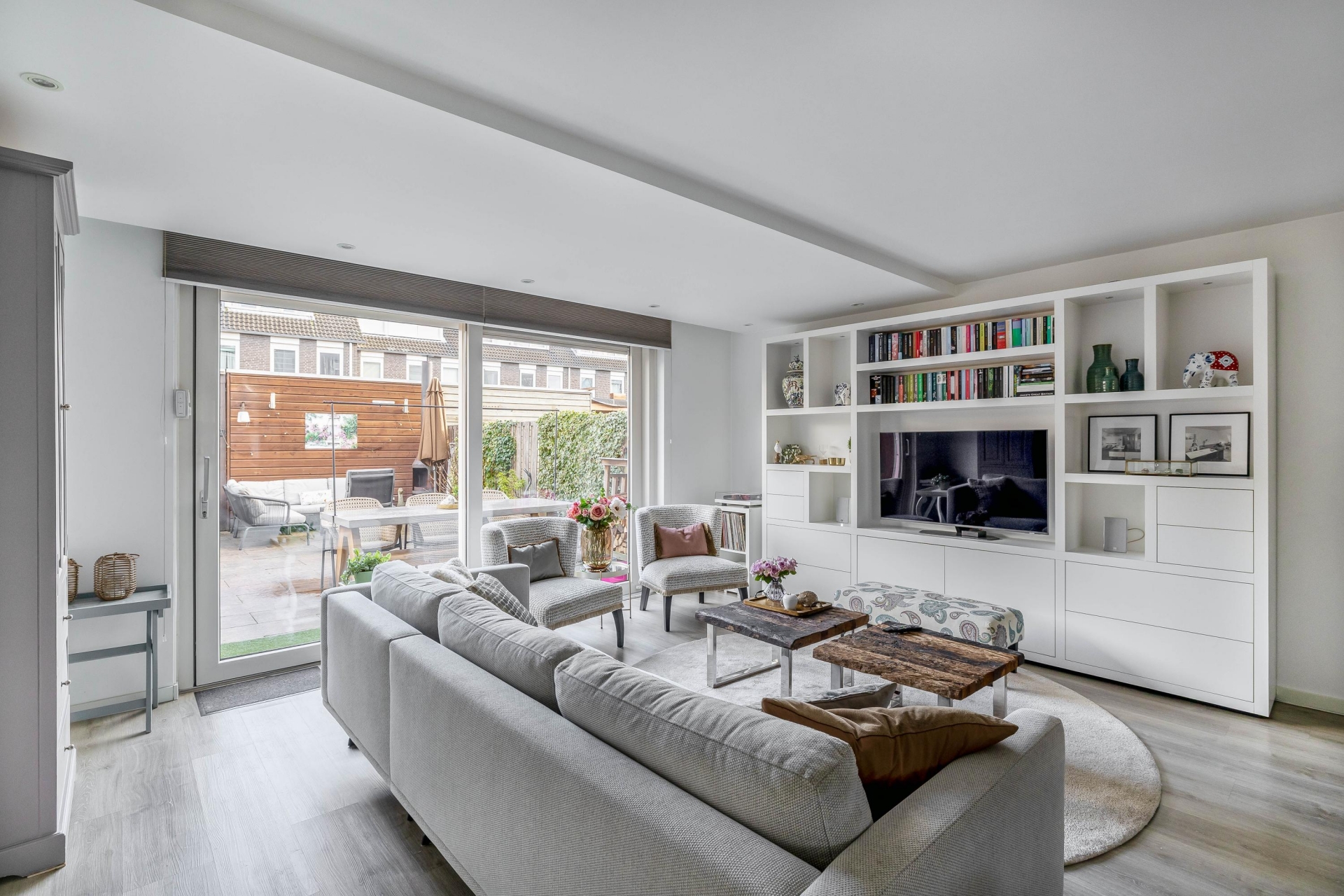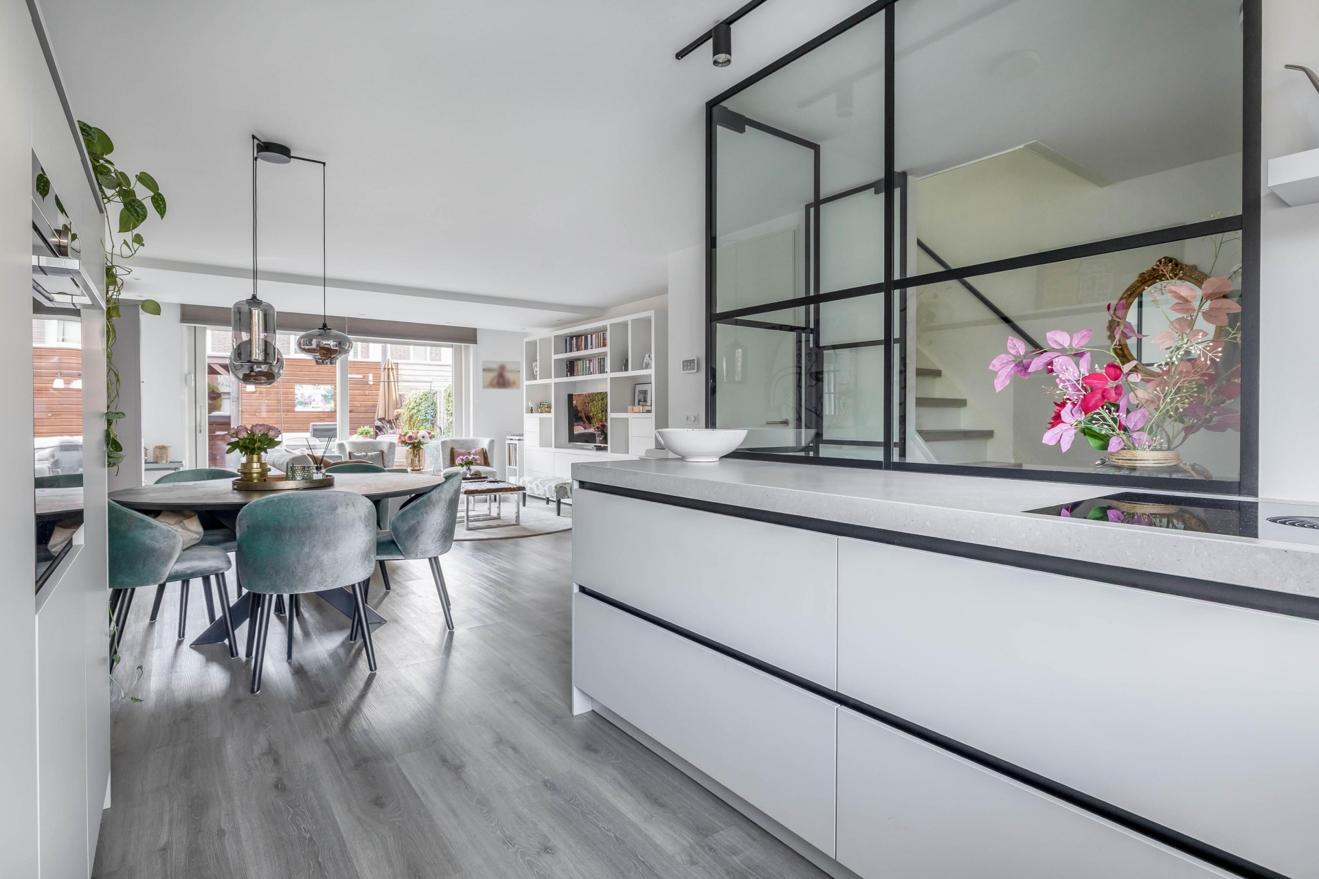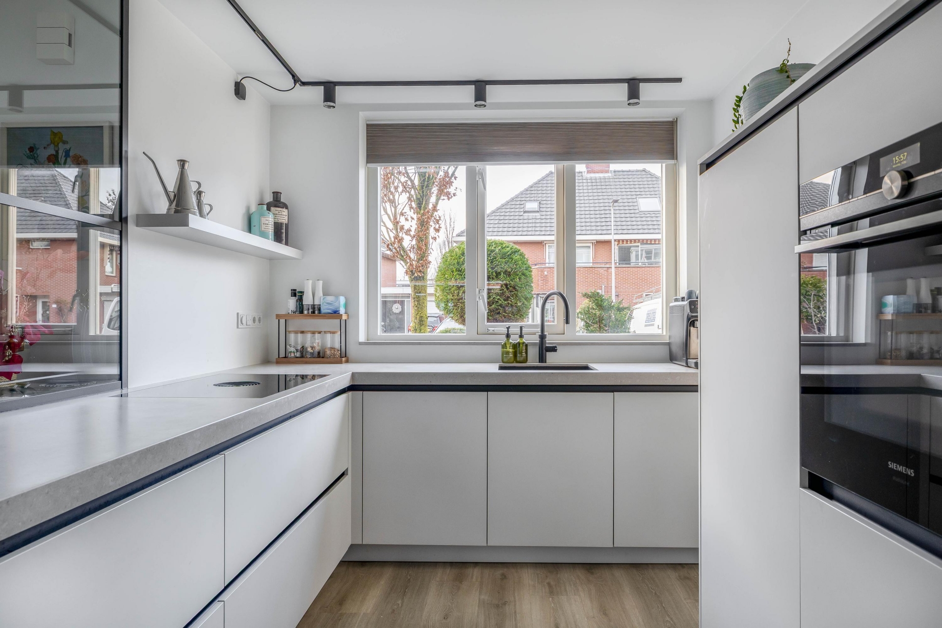 Bij binnenkomst valt meteen de ruime en open indeling op. De woonkamer is stijlvol afgewerkt met vloerverwarming, strakke wanden en veel lichtinval door de grote raampartijen aan de voor- en achterzijde. De zithoek biedt volop plek voor het hele gezin en loopt vloeiend over in het eetgedeelte en de moderne open keuken. Deze keuken is van alle gemakken voorzien, met hoogwaardige inbouwapparatuur zoals een Bora kookplaat, Quooker en Siemens apparatuur, én voldoende opbergruimte. Hier is het een genot om te koken én samen te komen.