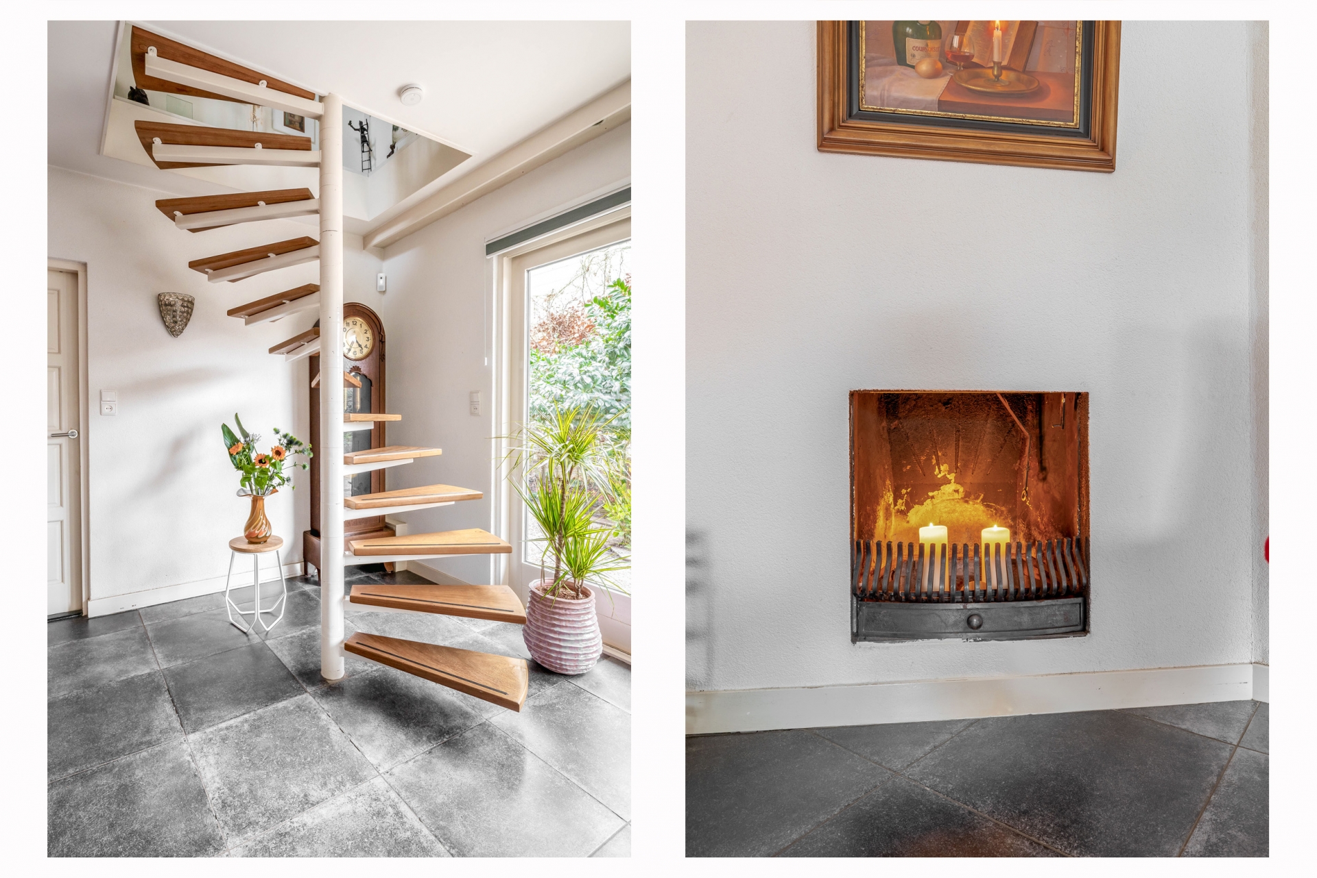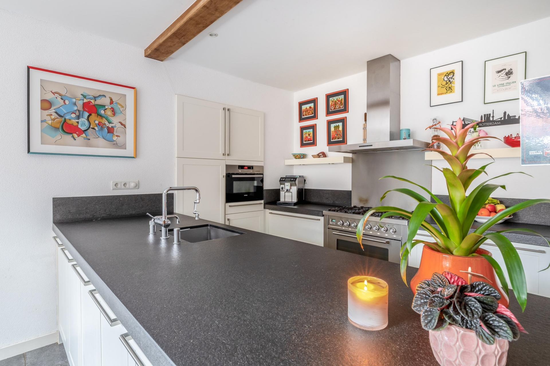 De begane grond vormt het hart van het huis. Woonkamer en leefkeuken lopen naadloos in elkaar over en creëren samen een royale leefruimte. De zichtbare houten balken zorgen voor karakter en warmte, terwijl de afwerking strak en verzorgd is. De zithoek is comfortabel ingericht met een haard als sfeervol middelpunt. Dankzij de airconditioning uit 2024 is het hier ook tijdens warme dagen aangenaam verblijven.