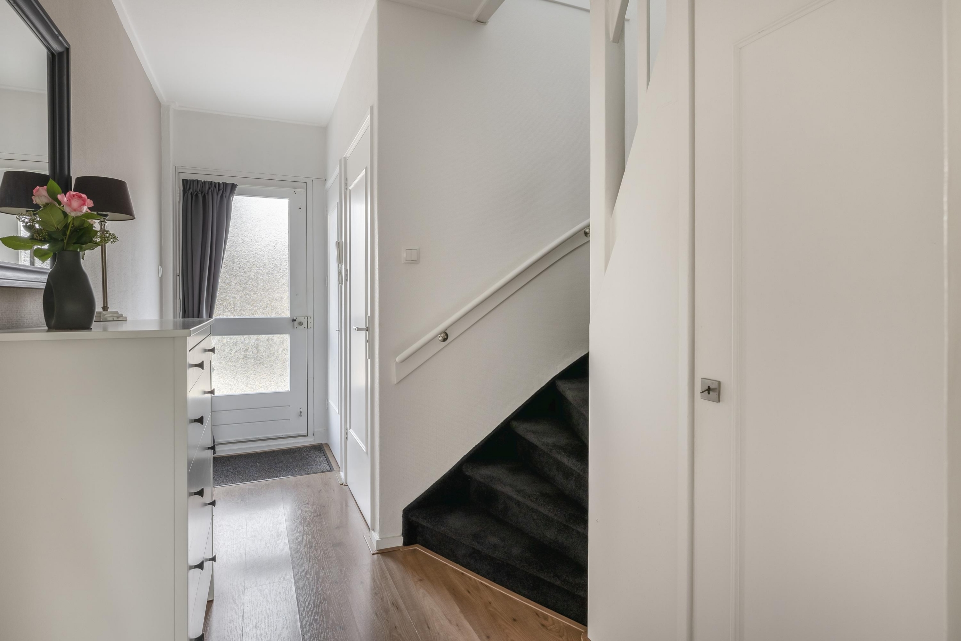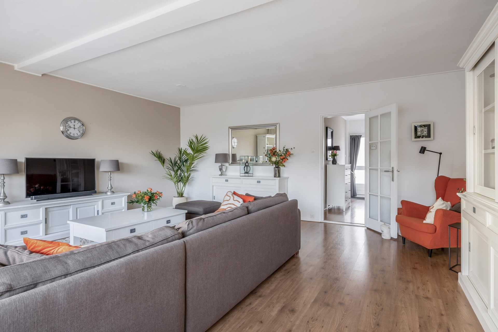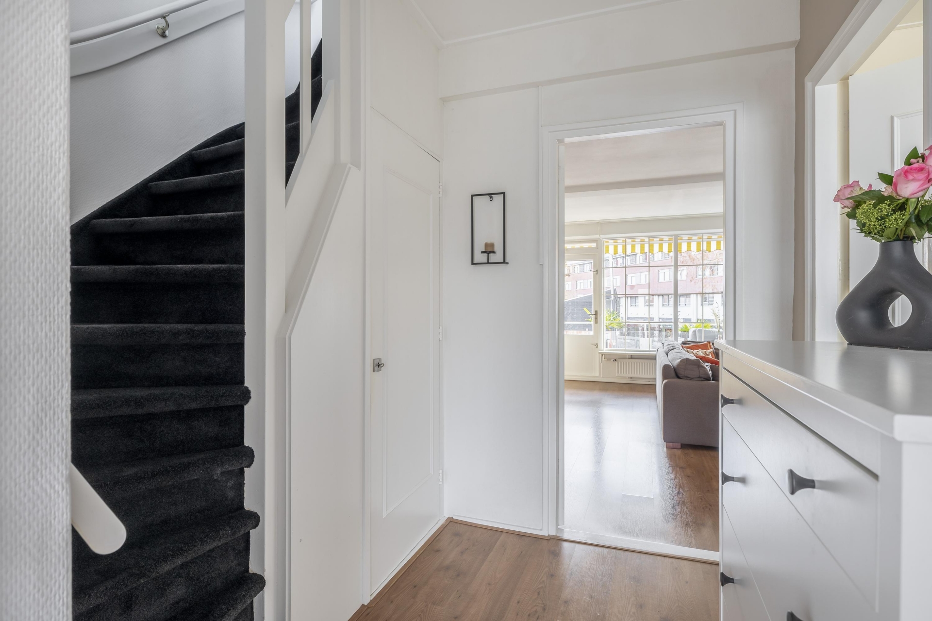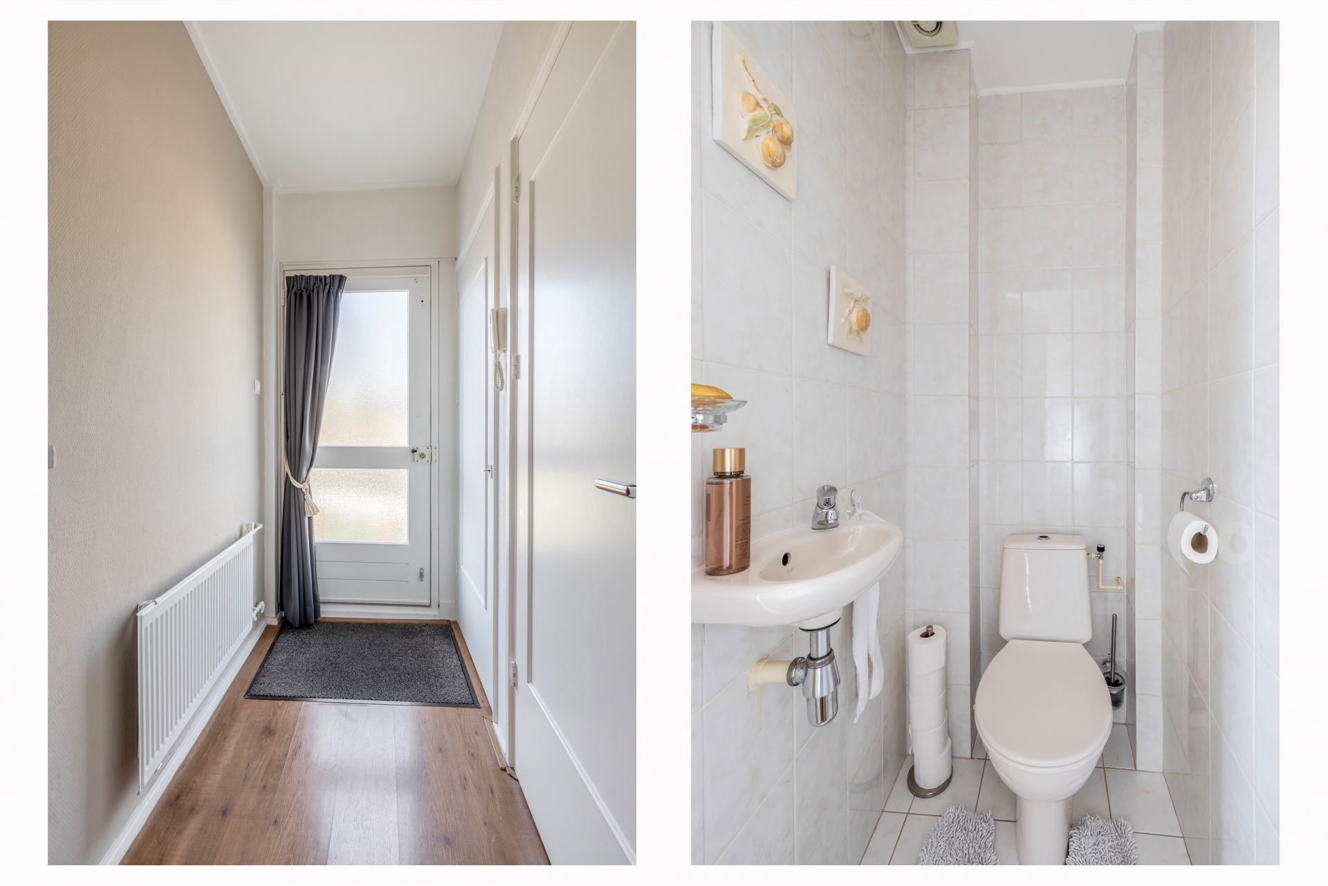 Via de entree op de eerste verdieping kom je in een centrale hal met garderobehoek, trapopgang, meterkast, handige bergkast en een toilet. Vervolgens betreed je de ruime woonkamer van bijna 6 meter breed en meer dan 5,5 meter diep – een heerlijke leefruimte die door de raampartijen aan de voorzijde baadt in het daglicht. De afwerking is verzorgd en neutraal, met een fraaie laminaatvloer en strakke wanden.