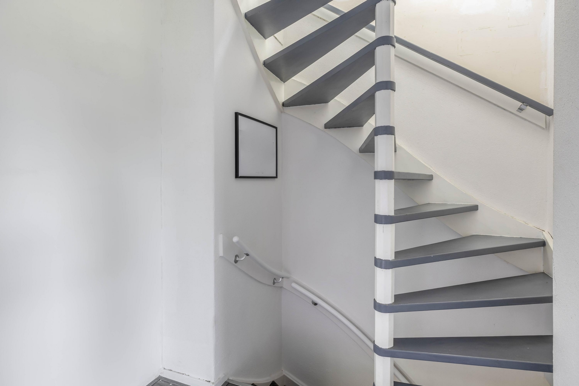 De keuken is praktisch geplaatst en biedt voldoende opbergruimte en werkblad. Ook op de begane grond bevindt zich een hal met trapopgang en een toiletruimte.