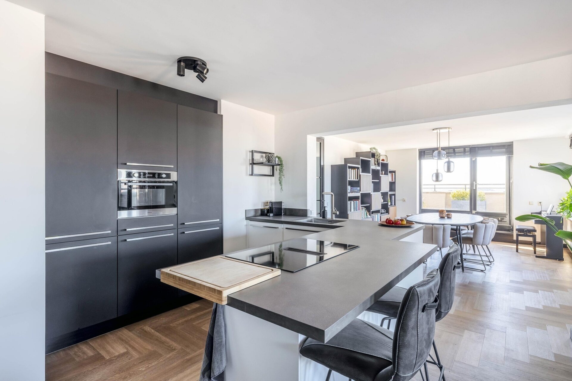De woonkamer is een oase van licht dankzij de grote raampartijen en biedt toegang tot het fantastische loungeterras van ca. 60 m². Hier geniet je het hele jaar door van de dynamiek van de stad en de rust van het water. De open keuken – volledig vernieuwd in 2023 – is voorzien van luxe inbouwapparatuur en biedt alles voor de kookliefhebber.
