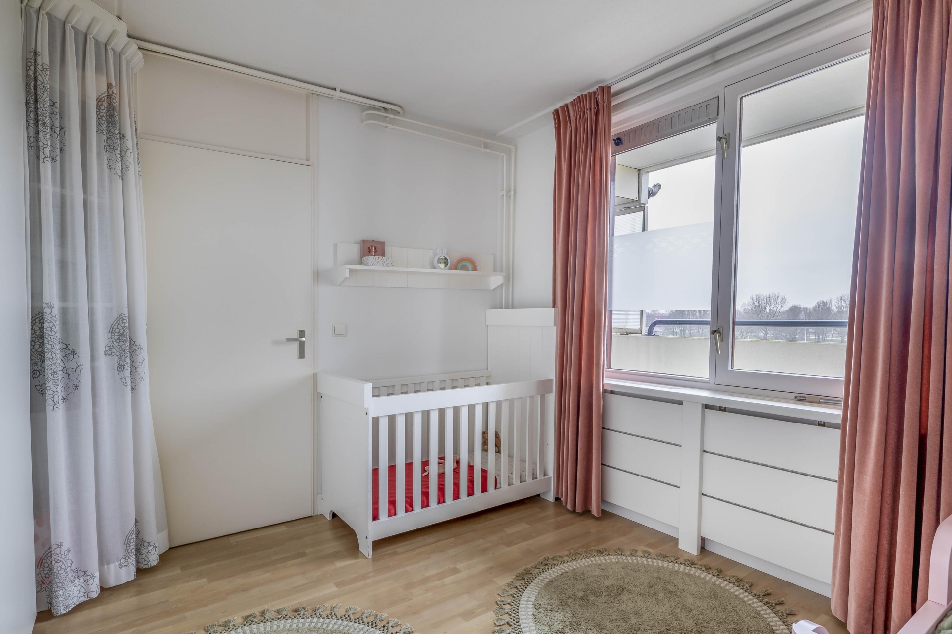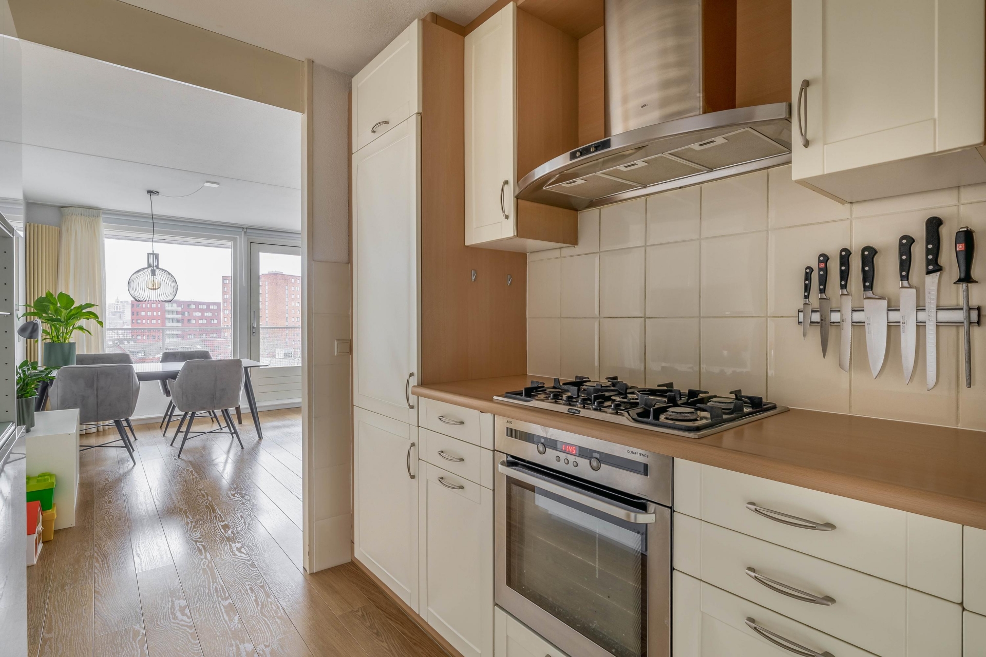De woonkamer is ruim van opzet en wordt door de grote raampartijen heerlijk verlicht. Dankzij de ligging op hoogte kijk je hier mooi weg over de wijk, terwijl je binnen geniet van een comfortabele zithoek en plek voor een eettafel. De toegang tot het zonnige balkon loopt direct vanuit de woonkamer.