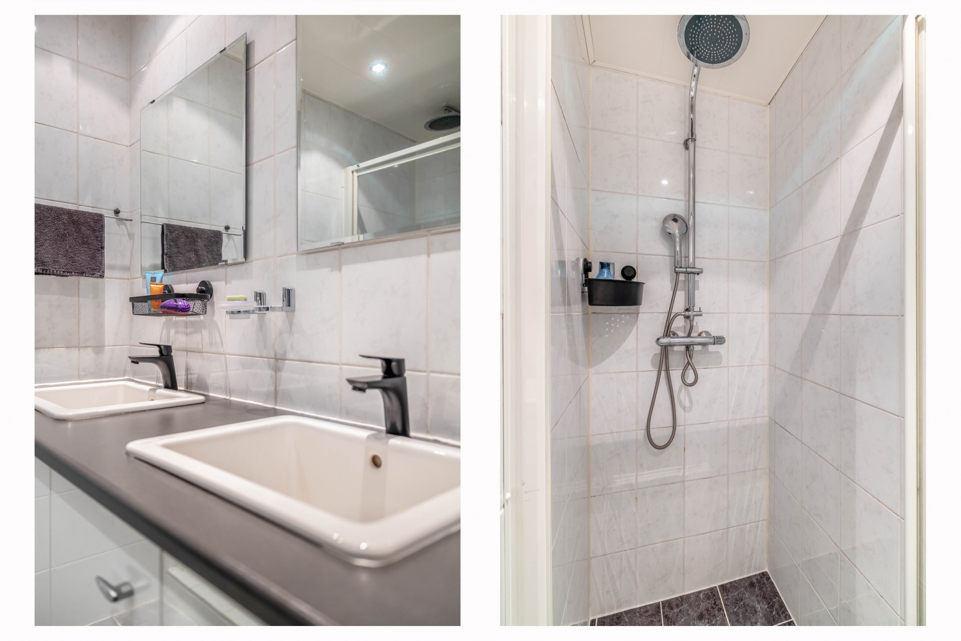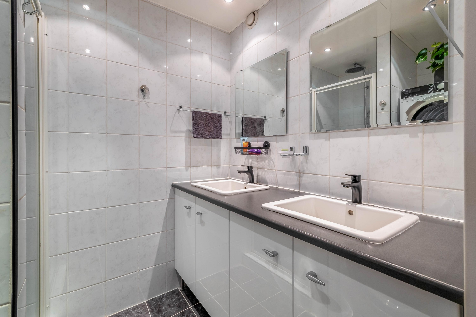 De badkamer is netjes afgewerkt en voorzien van een douche, dubbele wastafel en de wasmachineaansluiting. Het toilet bevindt zich separaat van de badkamer, wel zo prettig.