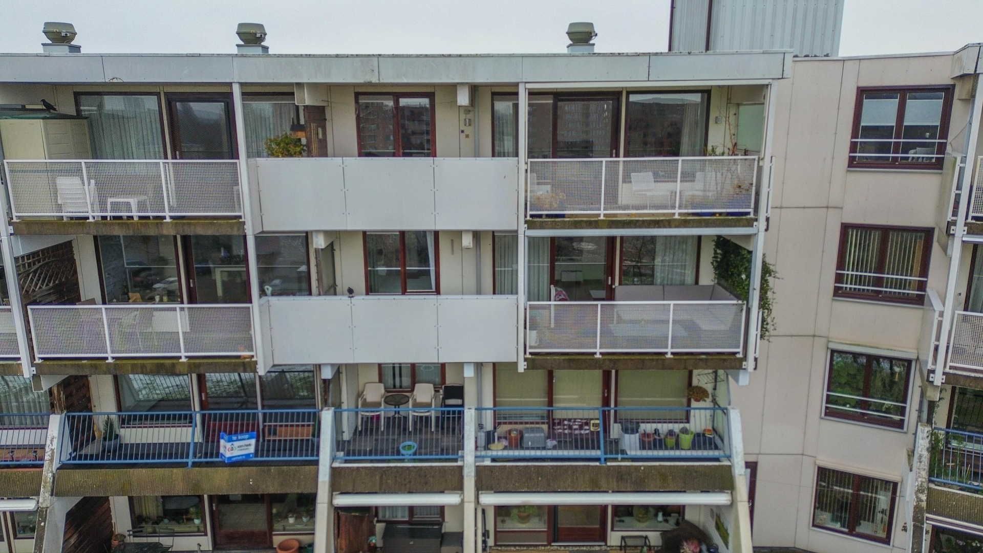 Een groot pluspunt is het terras op het zuidwesten. Het balkon is uitzonderlijk ruim, 12,5 vierkante meter, over de volledige breedte van het appartement. De bank buiten zoals nu blijft staan, inclusief kussens. Die zithoek is ideaal, je kan vrijwel het hele jaar comfortabel buiten op het balkon zitten. Ook is het brede deel volledig af te schermen met een zonnescherm. Door de ligging op de zesde verdieping geniet je hier van de middag- en avondzon, rust en privacy. Het terras is sfeervol ingericht met houten vlonders, groen en ruimte voor een zitje. Ideaal voor een kop koffie in de zon of een ontspannen borrel aan het eind van de dag.