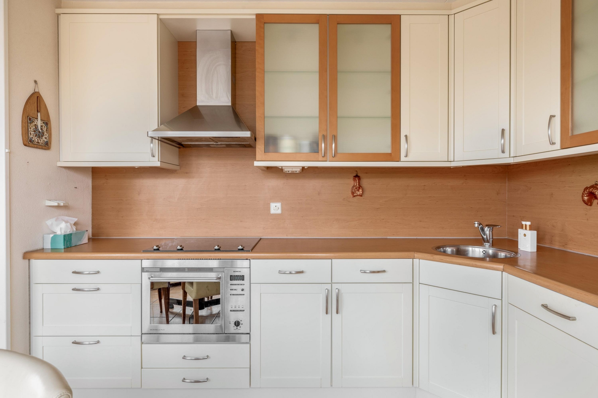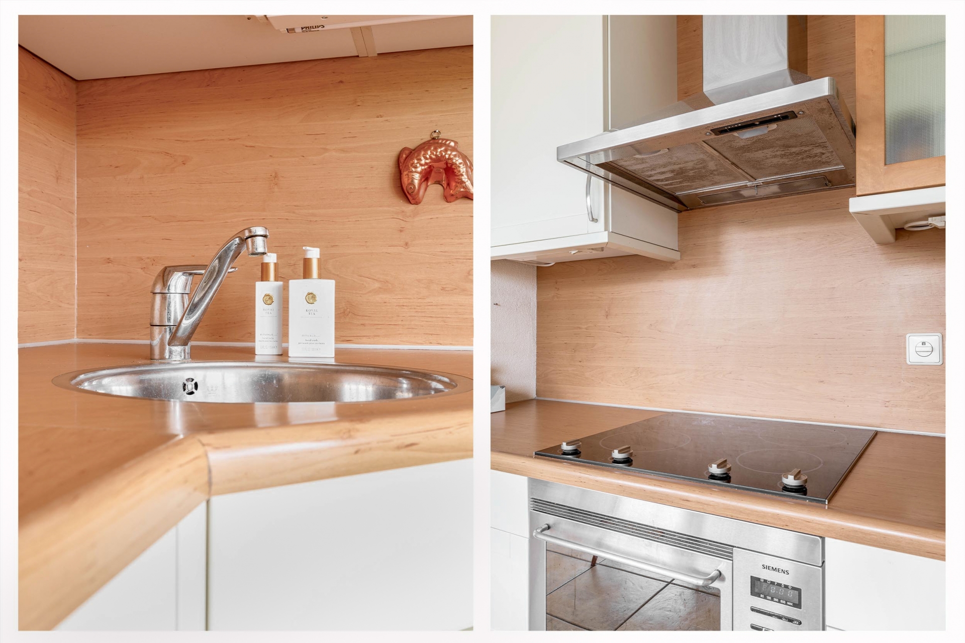 De keuken is compleet uitgerust in L-opstelling met diverse inbouwapparatuur, waaronder een combimagnetron, vaatwasser, koel-vriescombinatie, afzuigkap en 4-pits inductie.