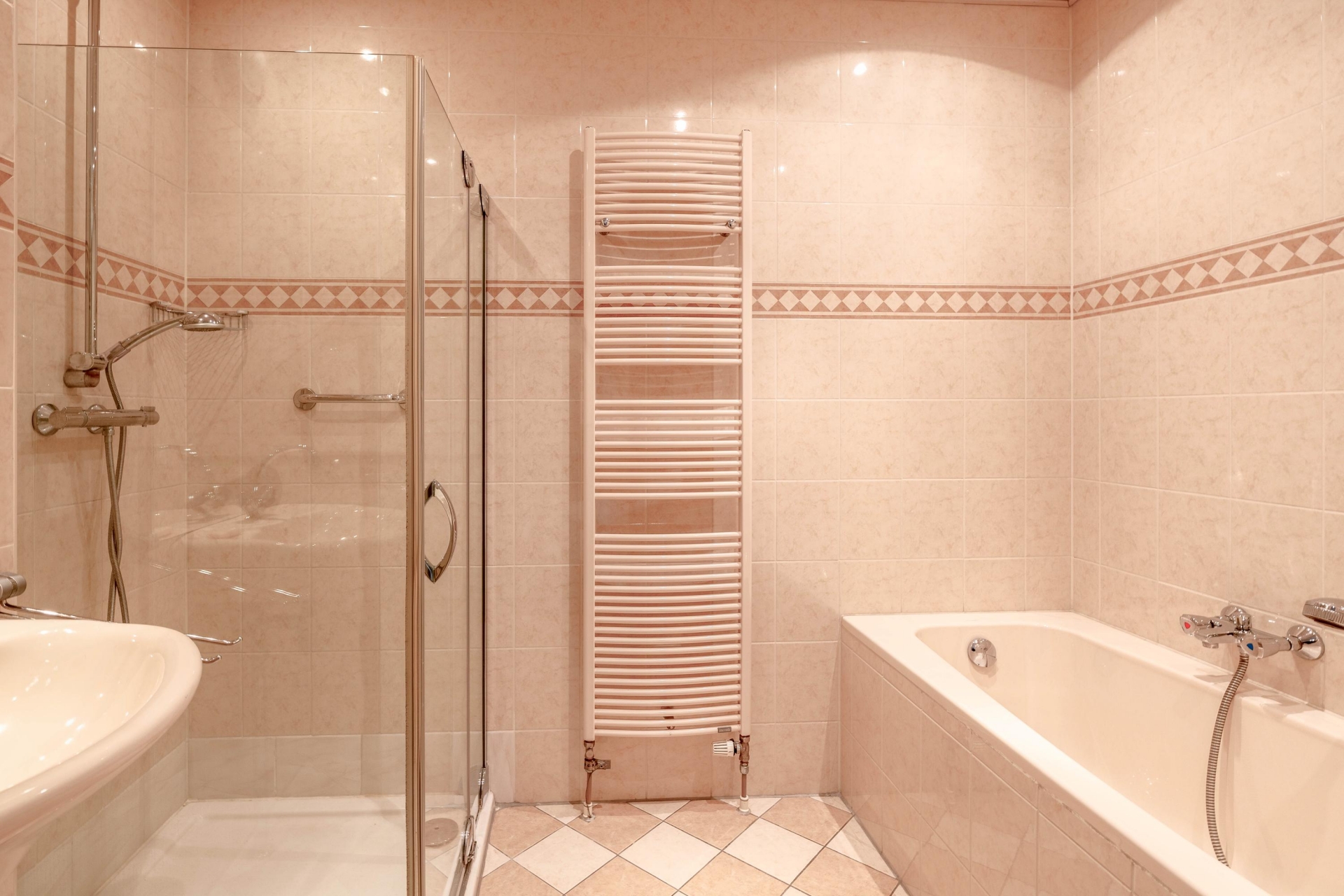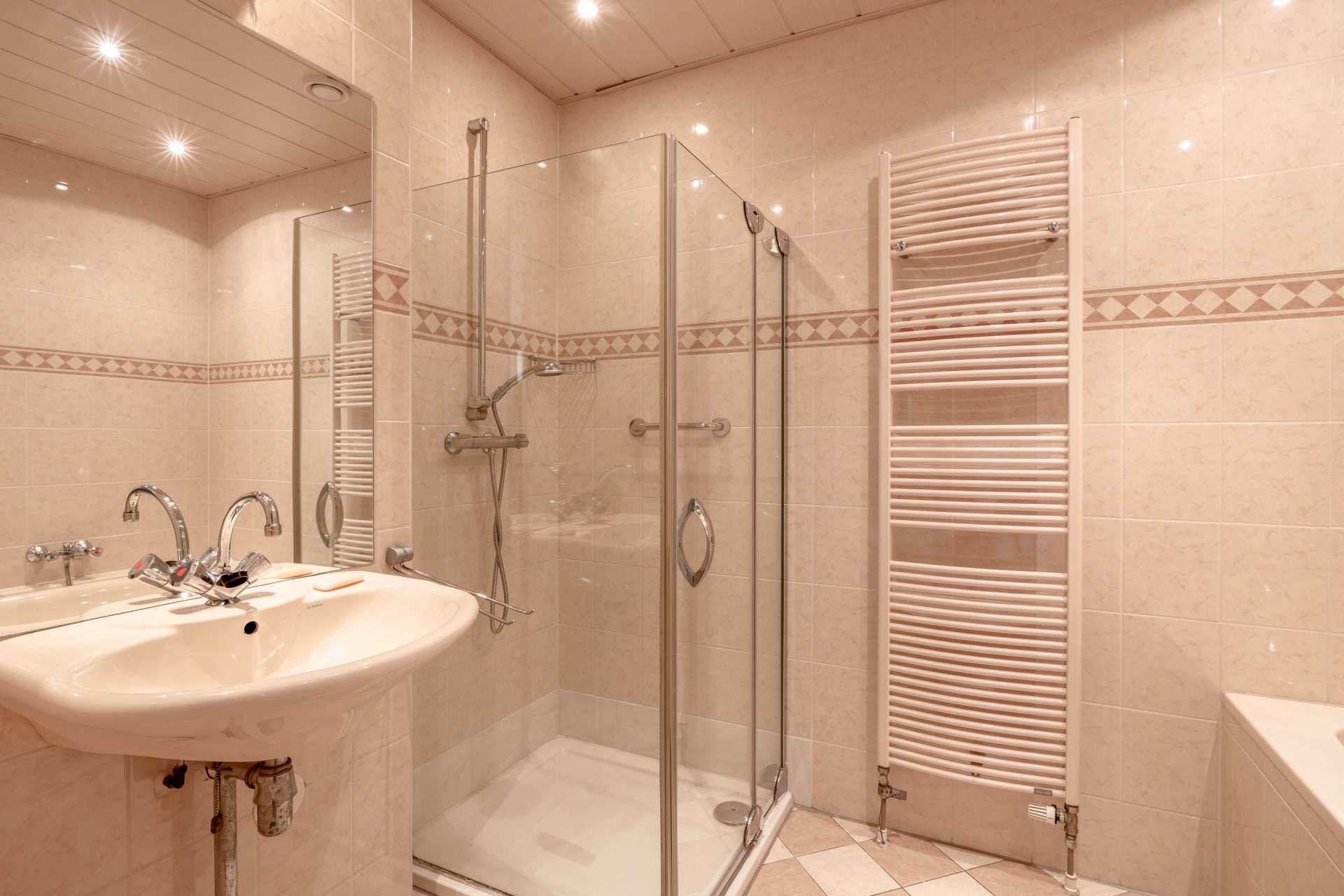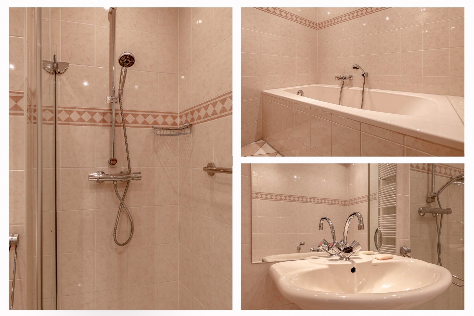De badkamer is uitgerust met een ligbad, een inloopdouche, een wastafel en een handdoekradiator.