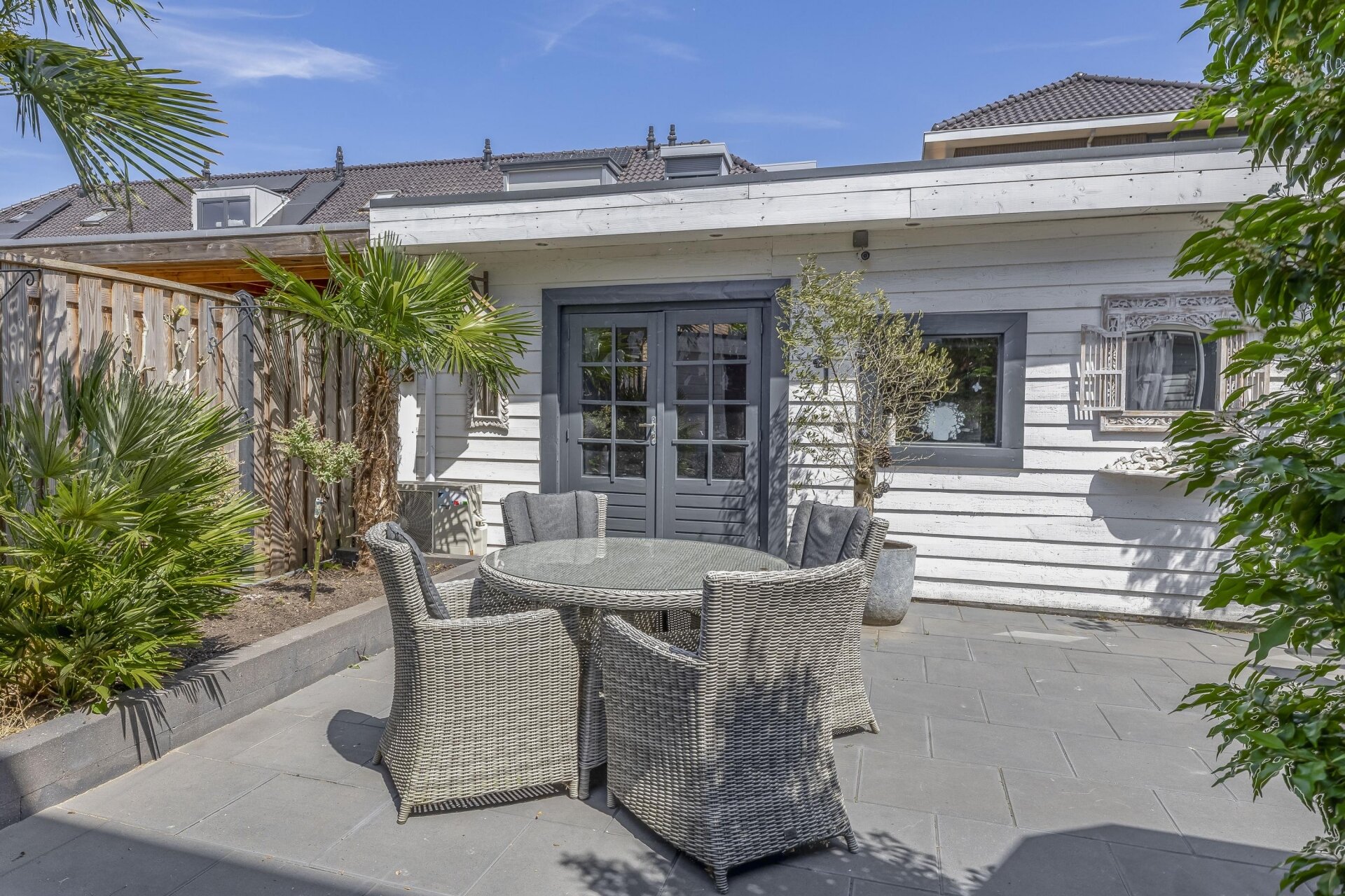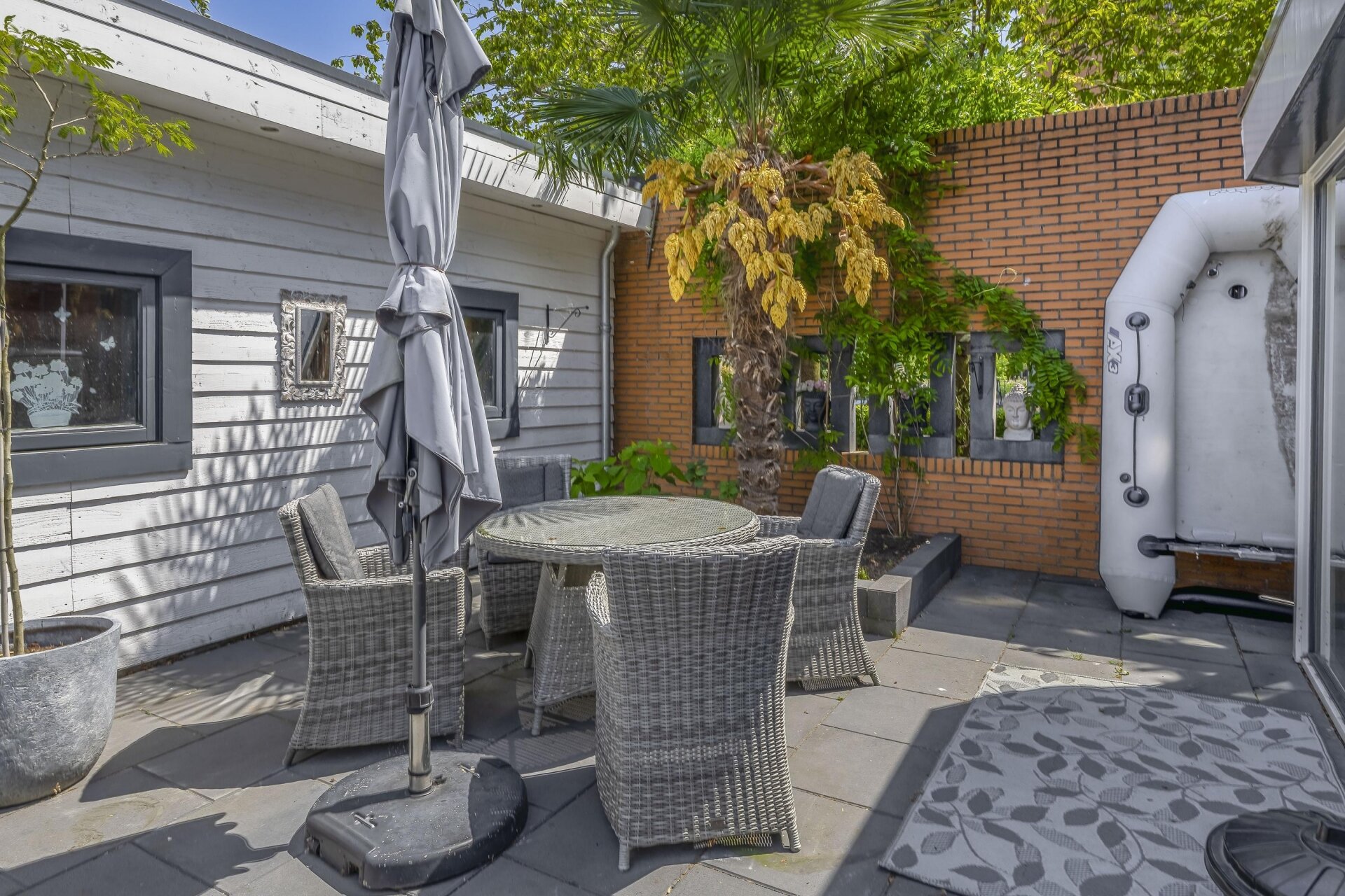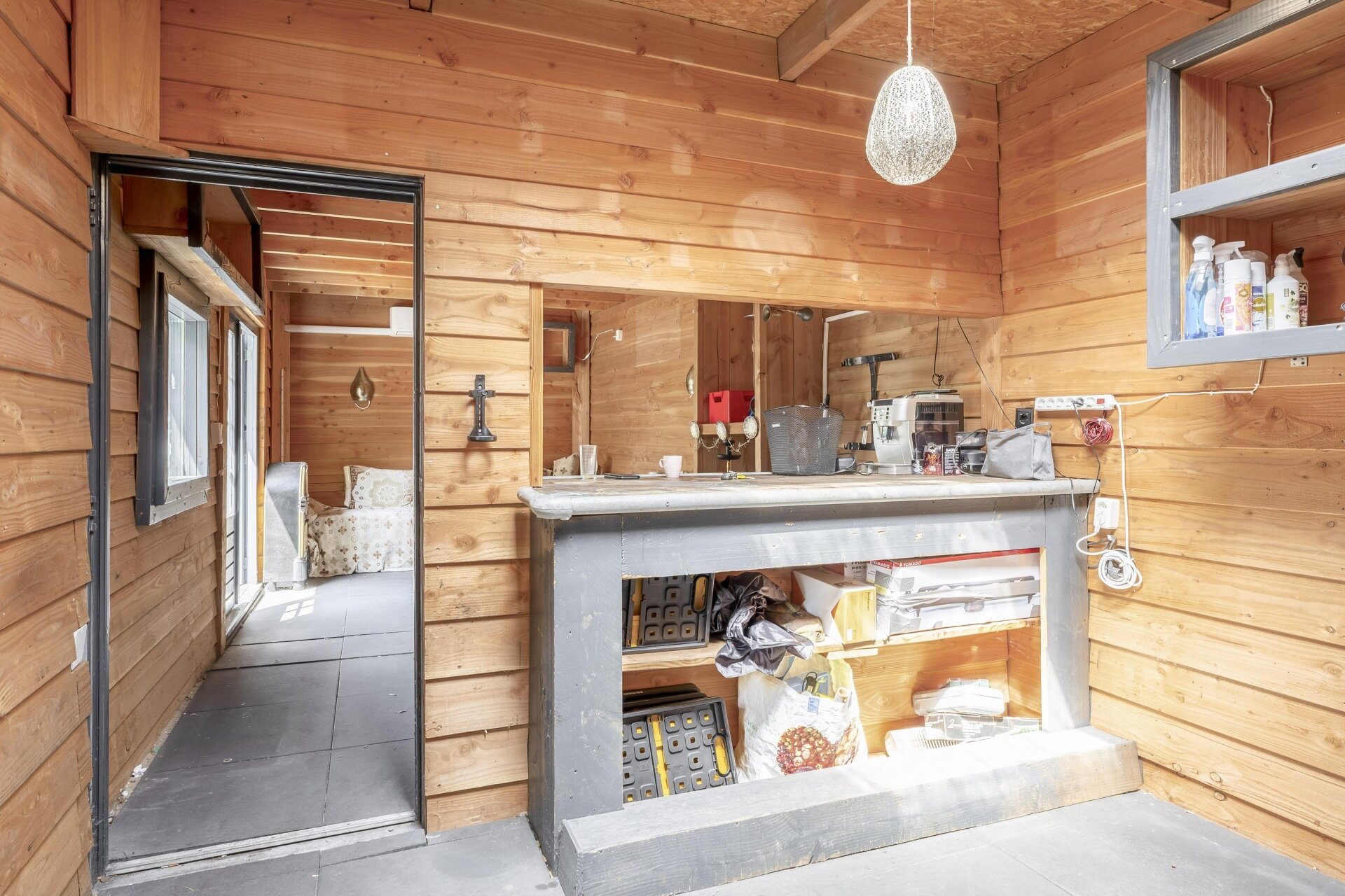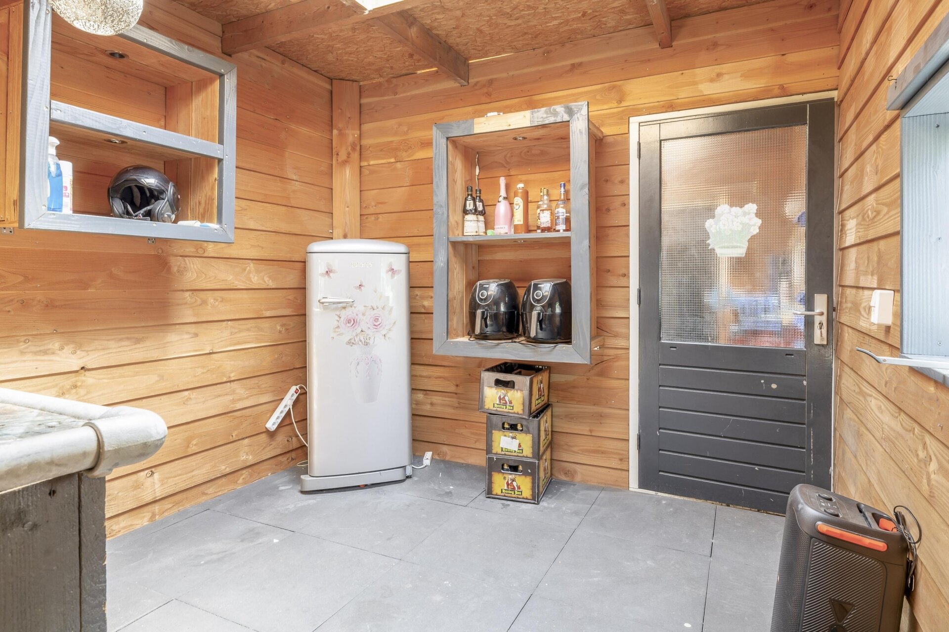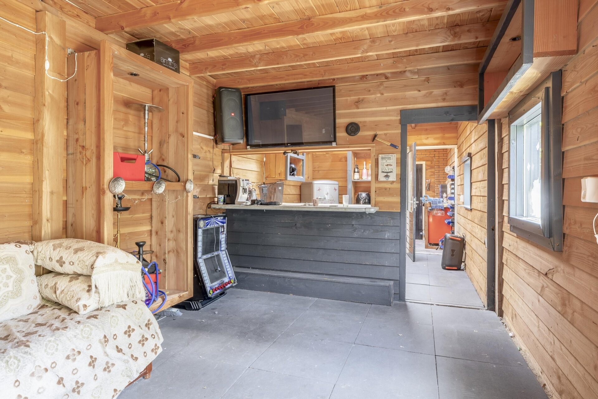 Achter in de tuin staat een ruime overkapping: een plek waar je het hele jaar door kunt relaxen. Hier zit je heerlijk uit de wind met een boek of drankje, maar de ruimte fungeert ook als gezellige bar – perfect voor een borrel met vrienden of een verjaardag in de buitenlucht. Het is echt een verlengstuk van je leefruimte.