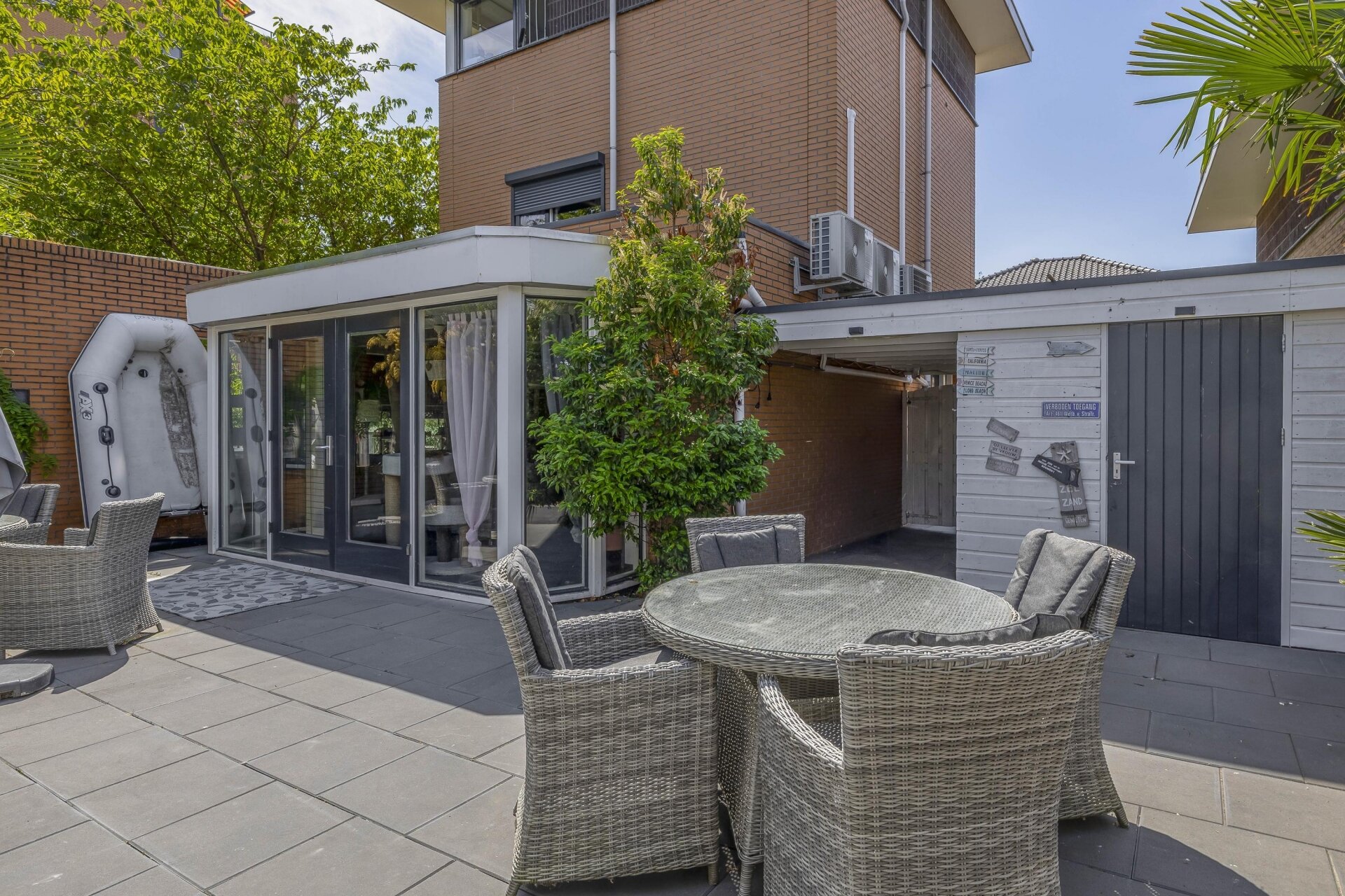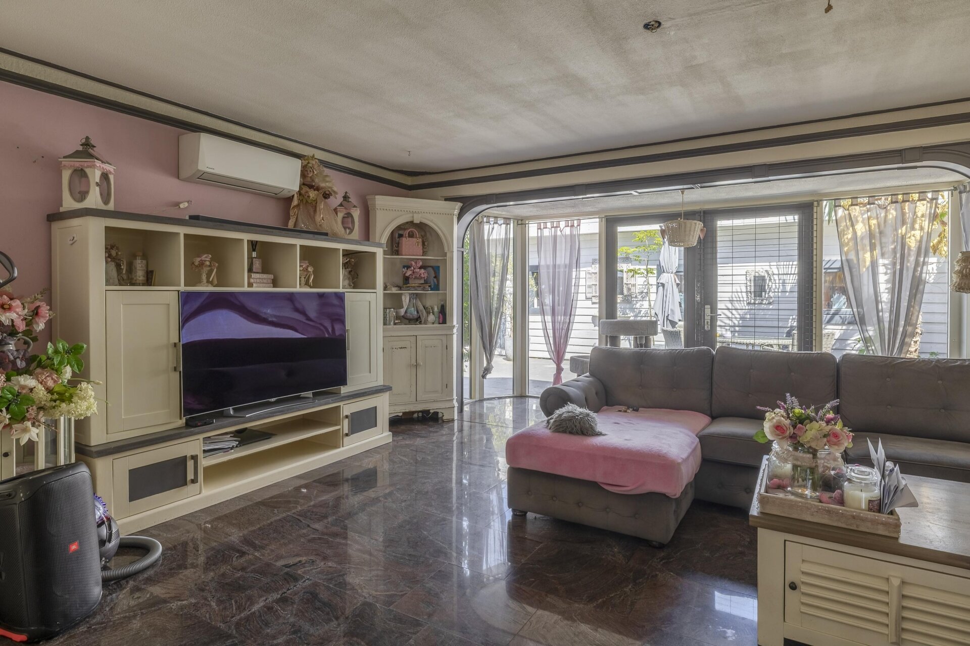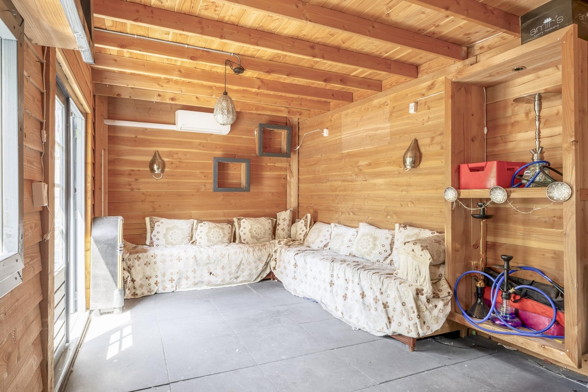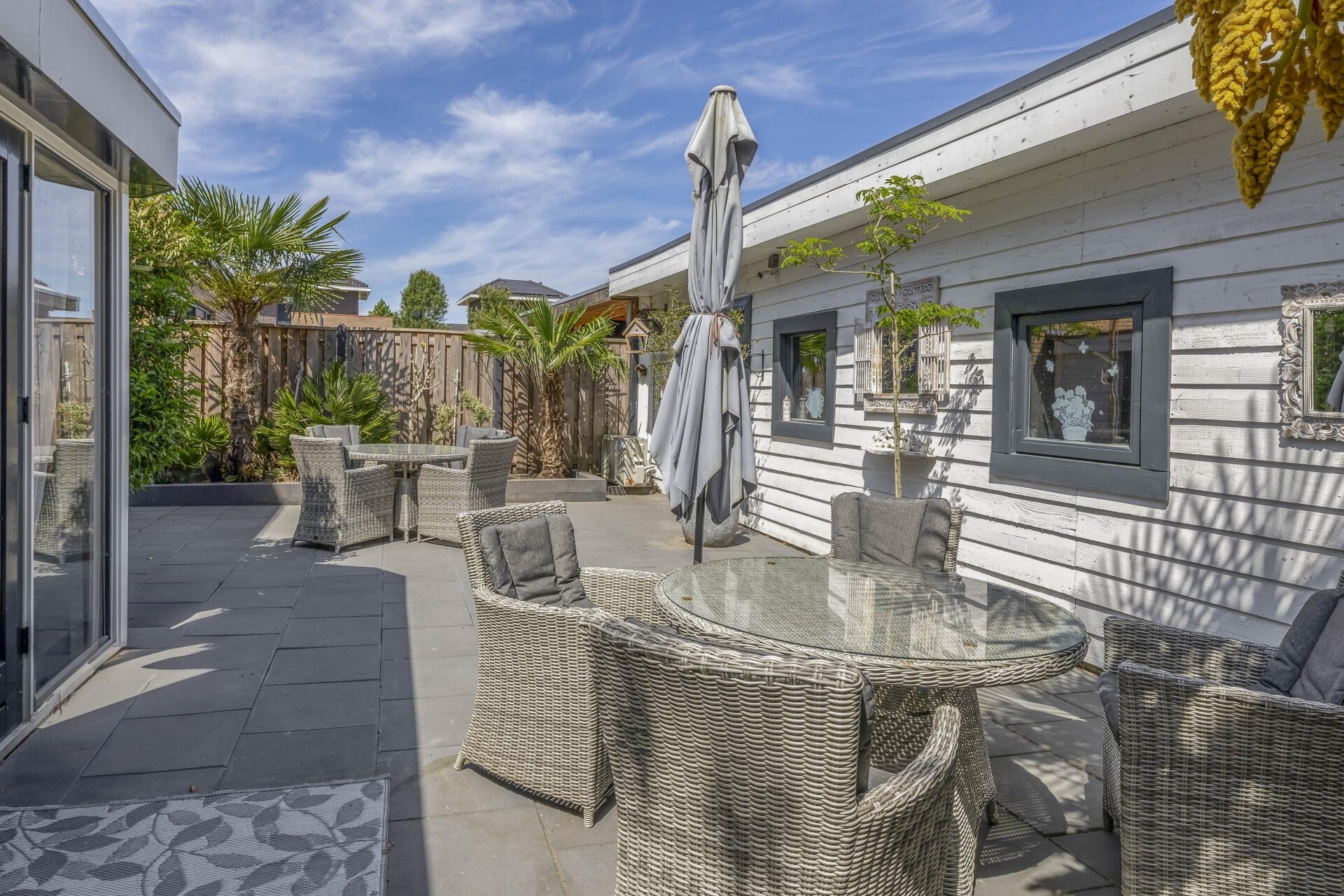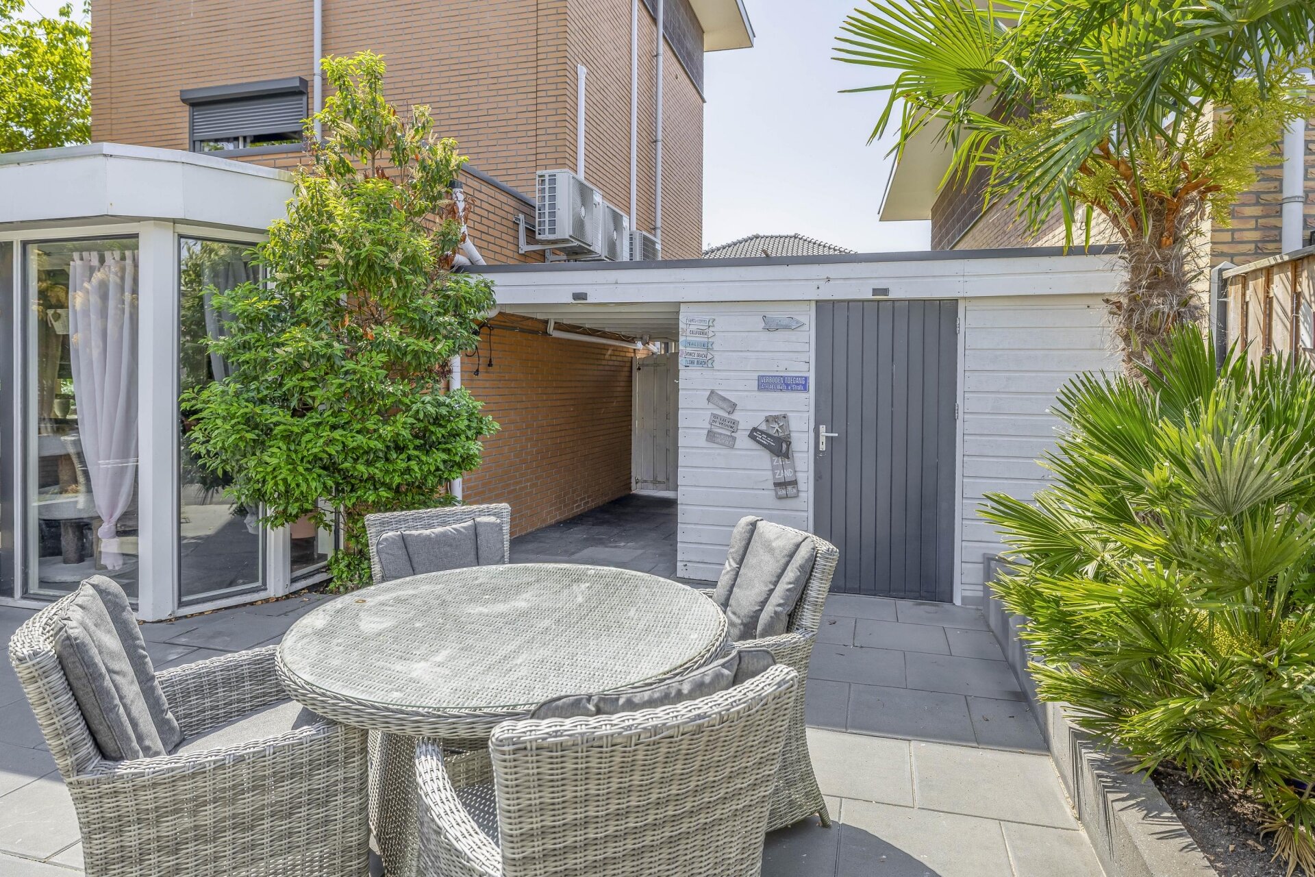 Achter in de tuin staat een ruime overkapping: een plek waar je het hele jaar door kunt relaxen. Hier zit je heerlijk uit de wind met een boek of drankje, maar de ruimte fungeert ook als gezellige bar – perfect voor een borrel met vrienden of een verjaardag in de buitenlucht. Het is echt een verlengstuk van je leefruimte.