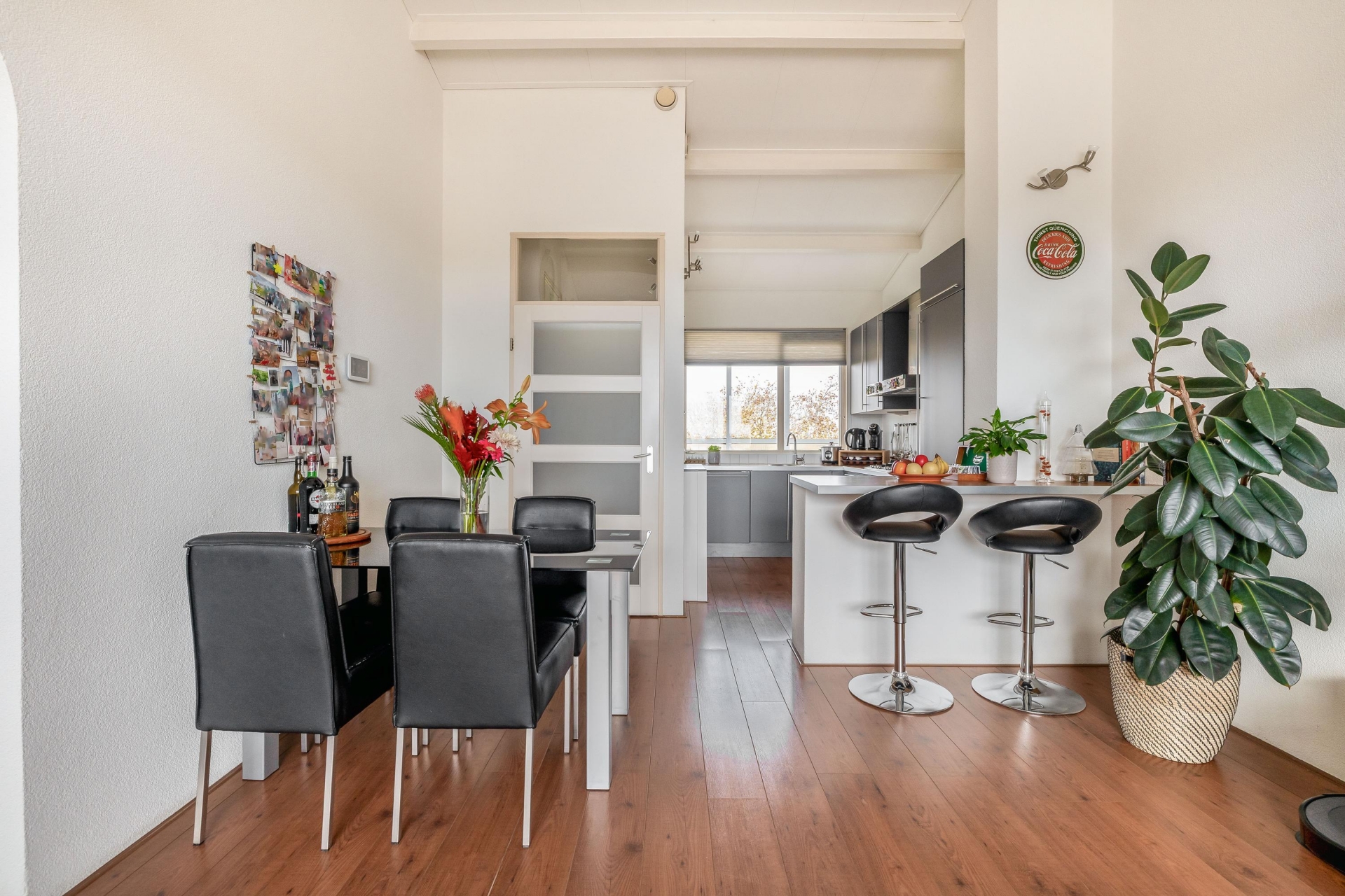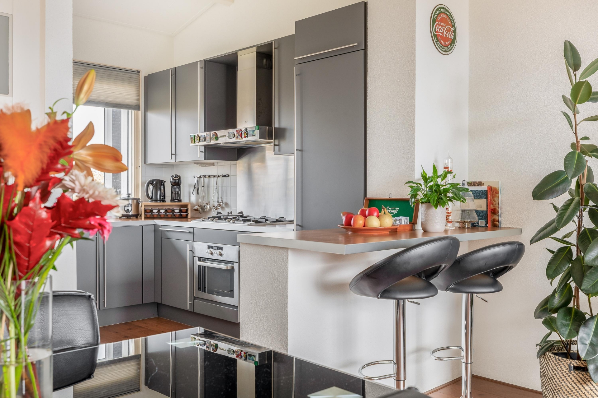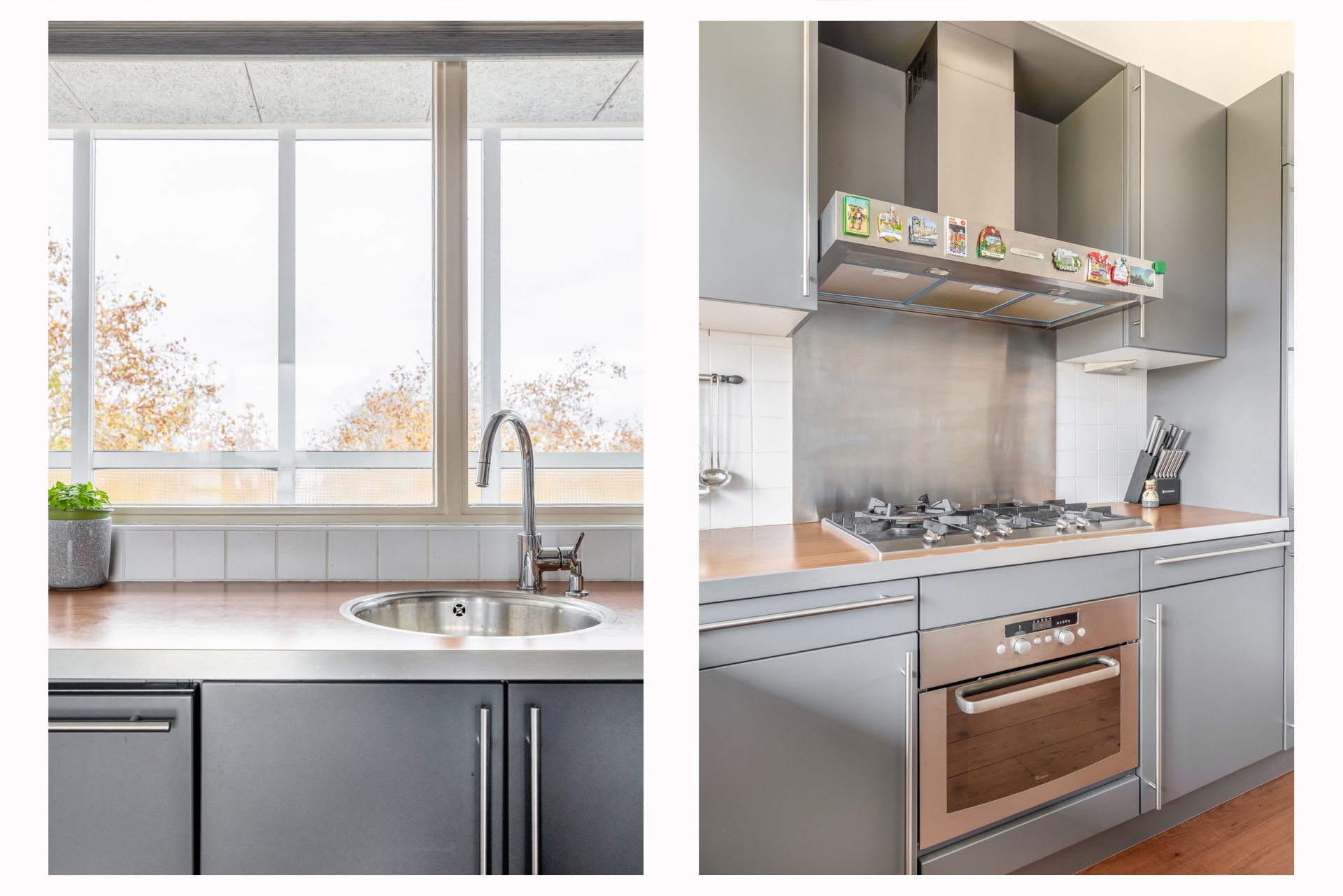 Zodra je de woonkamer binnenkomt valt meteen de hoogte en het vrije uitzicht op. De grote raampartijen zorgen voor een fijne lichtinval en via een deur stap je zo het zonnige balkon op. Dit balkon ligt op het zuidwesten, dus je geniet hier van de middag- tot avondzon. Een perfecte plek om in alle rust buiten te zitten, zonder inkijk. De woonkamer loopt door naar de keuken aan de voorzijde, voorzien van diverse inbouwapparatuur. Alles is netjes afgewerkt, praktisch in gebruik en klaar om in te trekken.