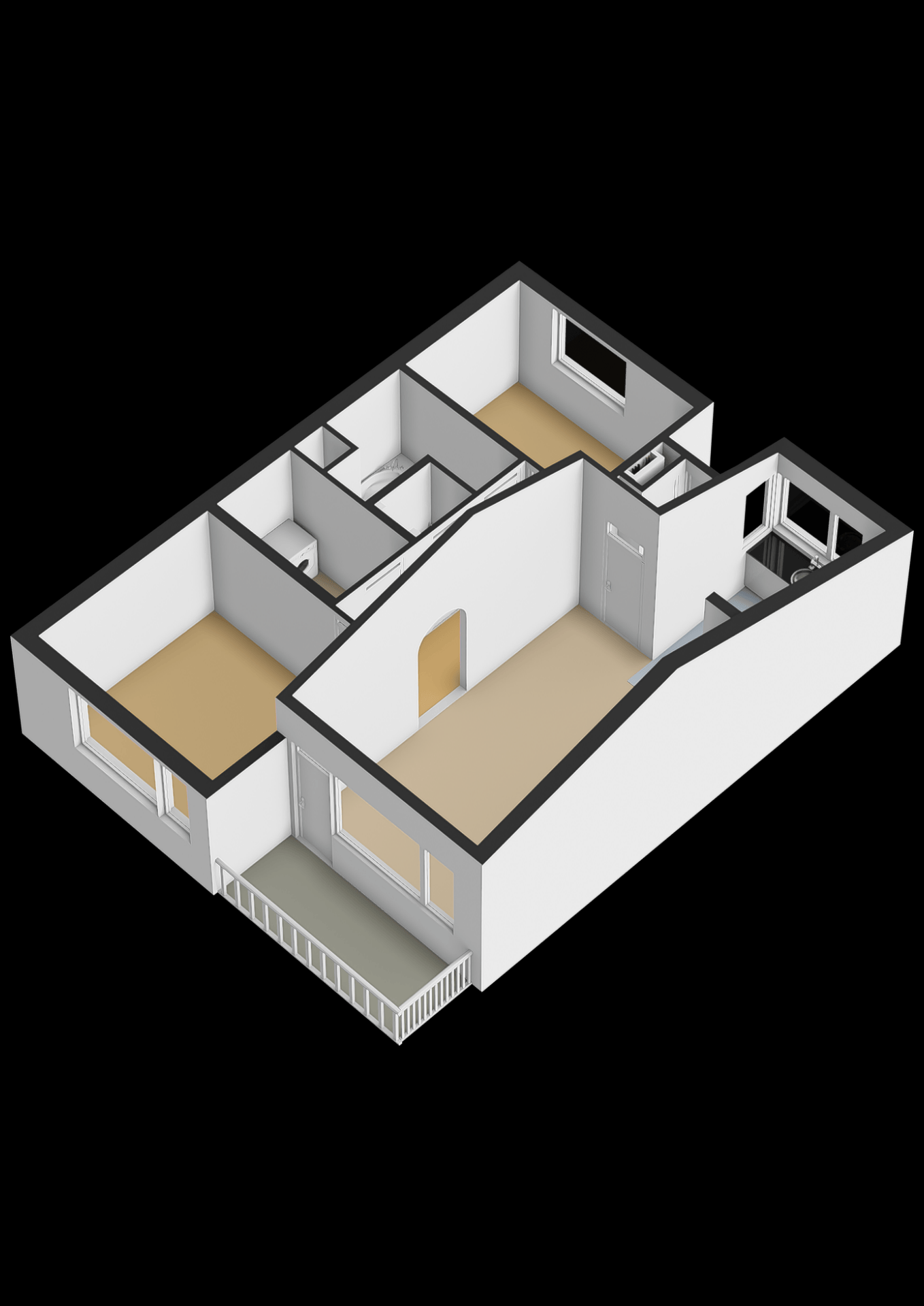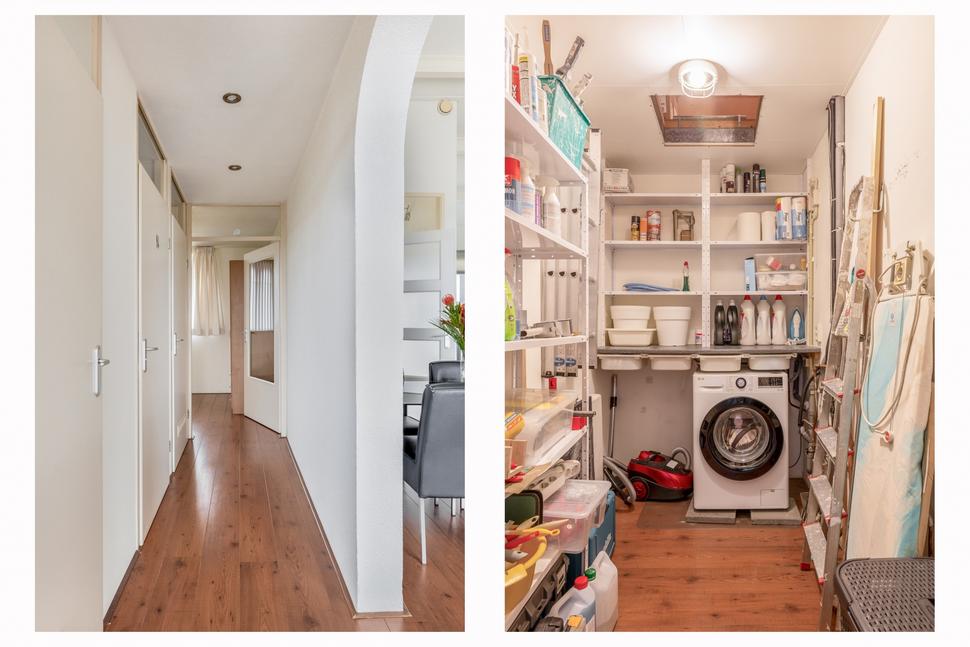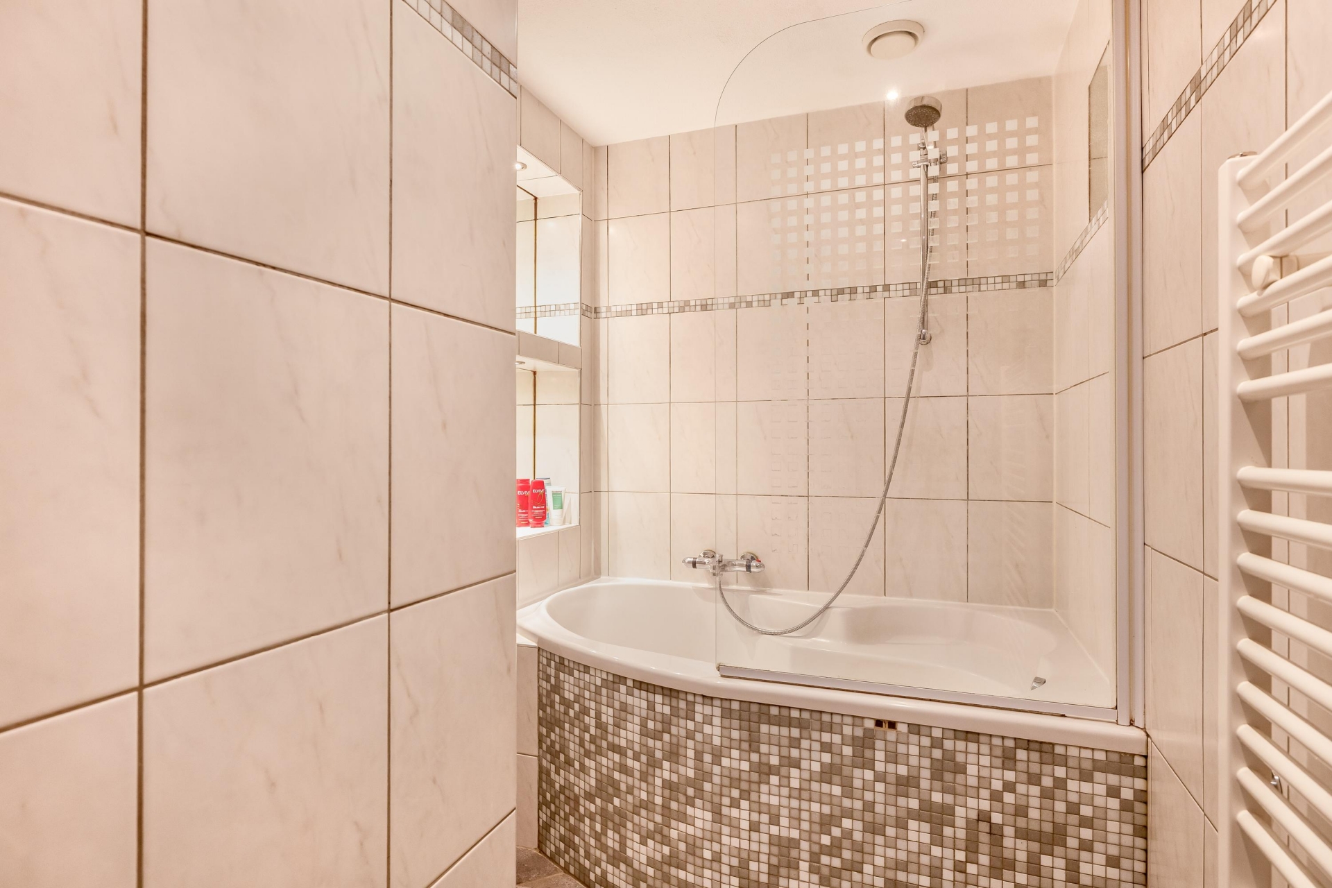 Het appartement beschikt over twee slaapkamers, beide voorzien van airco-units – ideaal voor warme zomers. De hoofdslaapkamer is ruim en ligt aan de rustige achterzijde. De tweede slaapkamer is perfect als logeerkamer, werkkamer of kleedruimte. De badkamer is netjes betegeld en beschikt over een ligbad met douchecombinatie, een wastafelmeubel en ingebouwde spotverlichting. Naast de badkamer bevindt zich een separaat toilet en een ruime inpandige berging/bijkeuken met wasmachineaansluiting en veel opbergmogelijkheden. Alles gelijkvloers en dus ook fijn voor wie comfort zoekt zonder trappen.