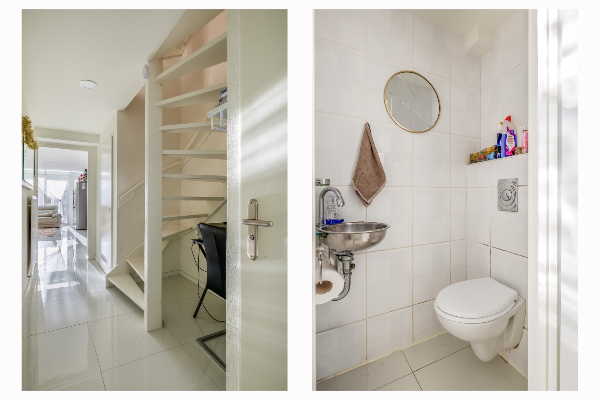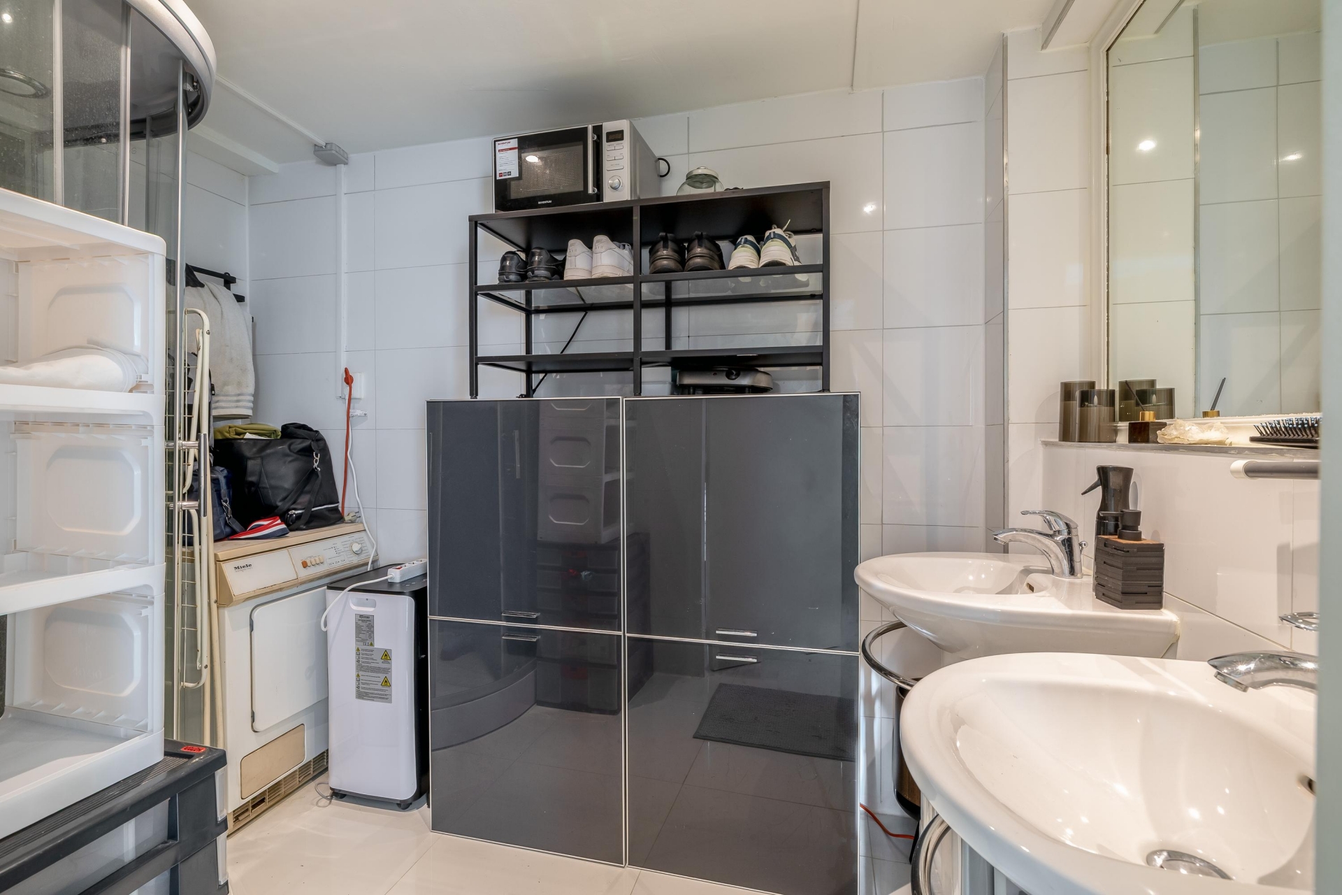 Uniek aan deze woning is de levensloopbestendige indeling op de begane grond: er is hier een ruime slaapkamer én een badkamer aanwezig. Deze badkamer is voorzien van een moderne douchecabine, dubbele wastafel en de aansluitingen voor wasmachine en droger. Ideaal voor gebruik als gelijkvloers wonen of voor logees/familieleden die liever beneden slapen.