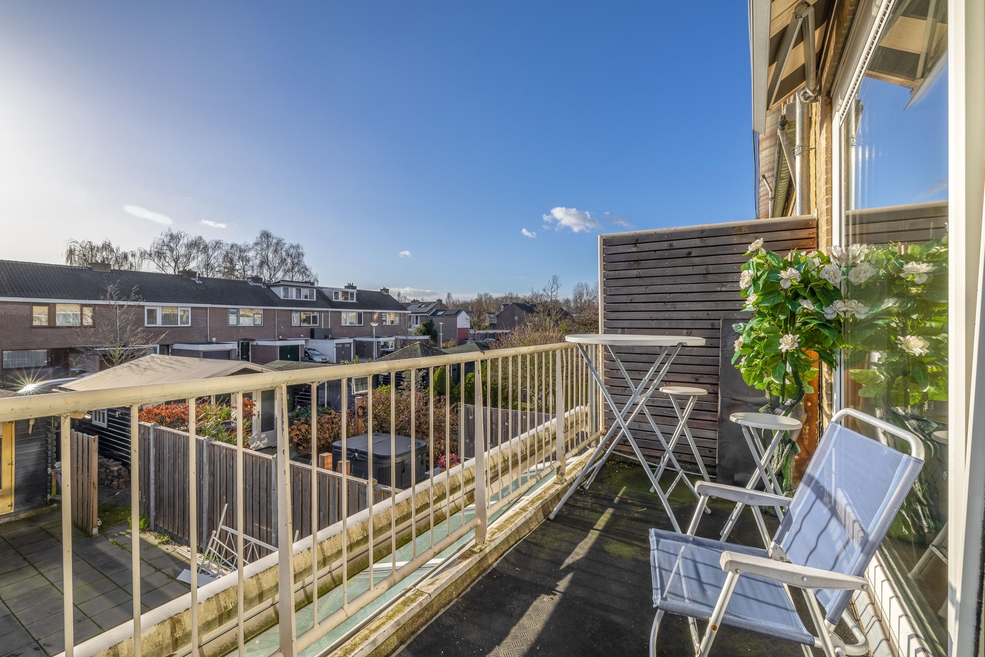 Op de eerste verdieping bevinden zich in totaal vier slaapkamers, variërend in formaat. Aan de achterzijde ligt de master bedroom met toegang tot het balkon – een fijne plek voor een kop koffie in de ochtendzon. De overige slaapkamers zijn geschikt als kinderkamer, werkkamer of hobbyruimte. De houten vloeren en de raampartijen zorgen voor een prettige, lichte sfeer op deze verdieping.