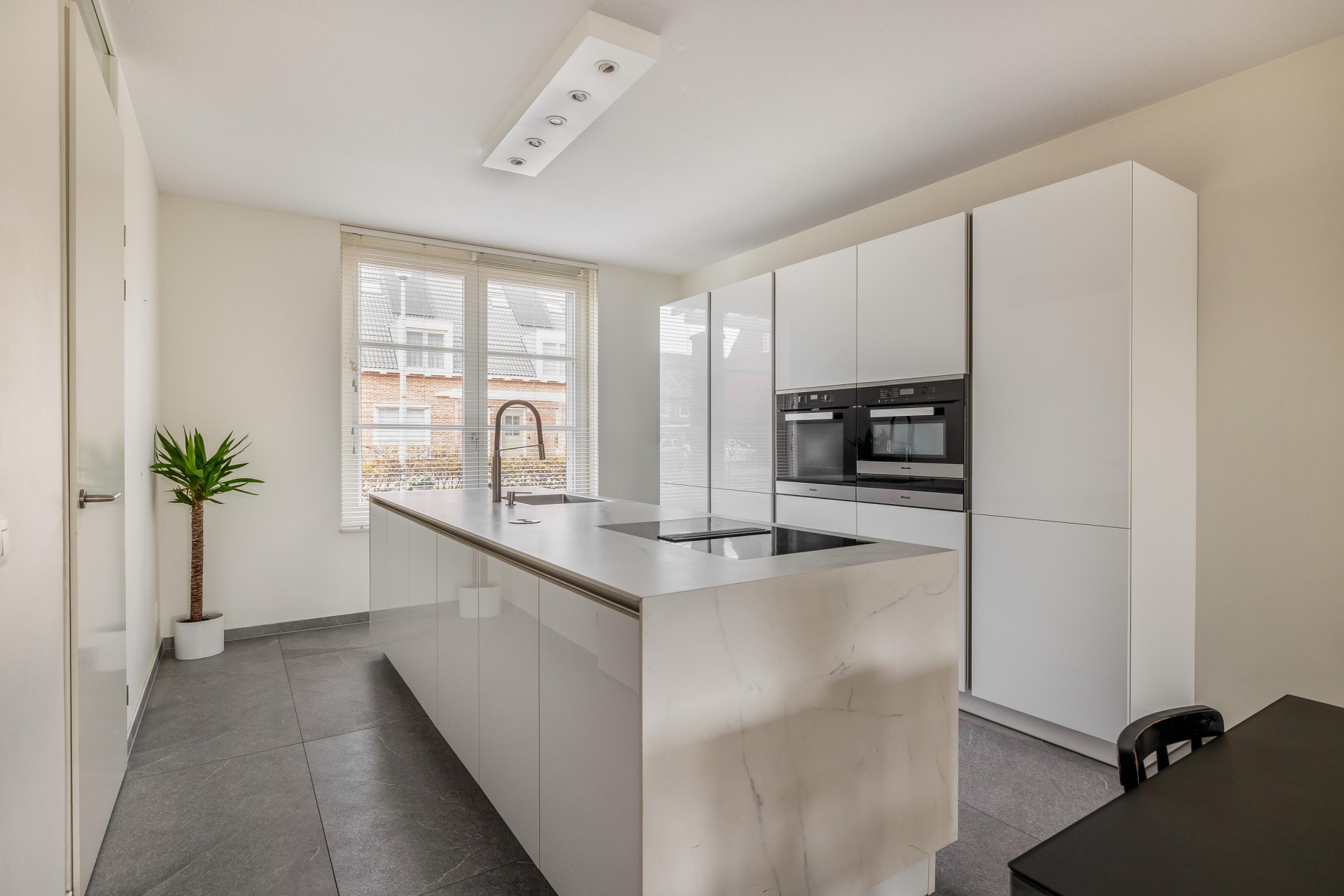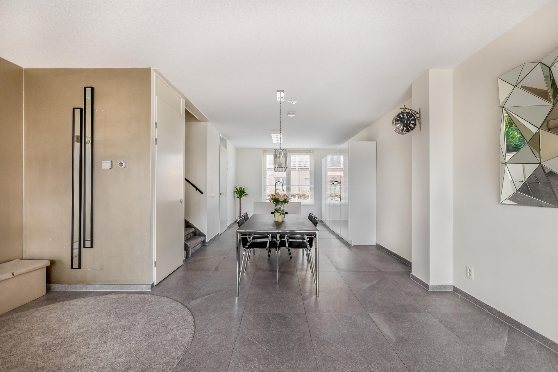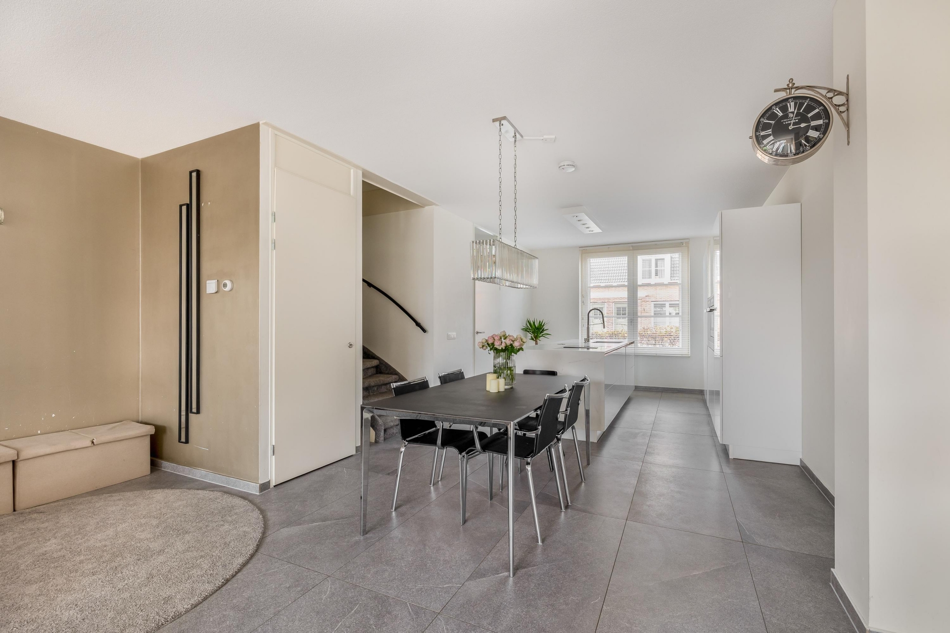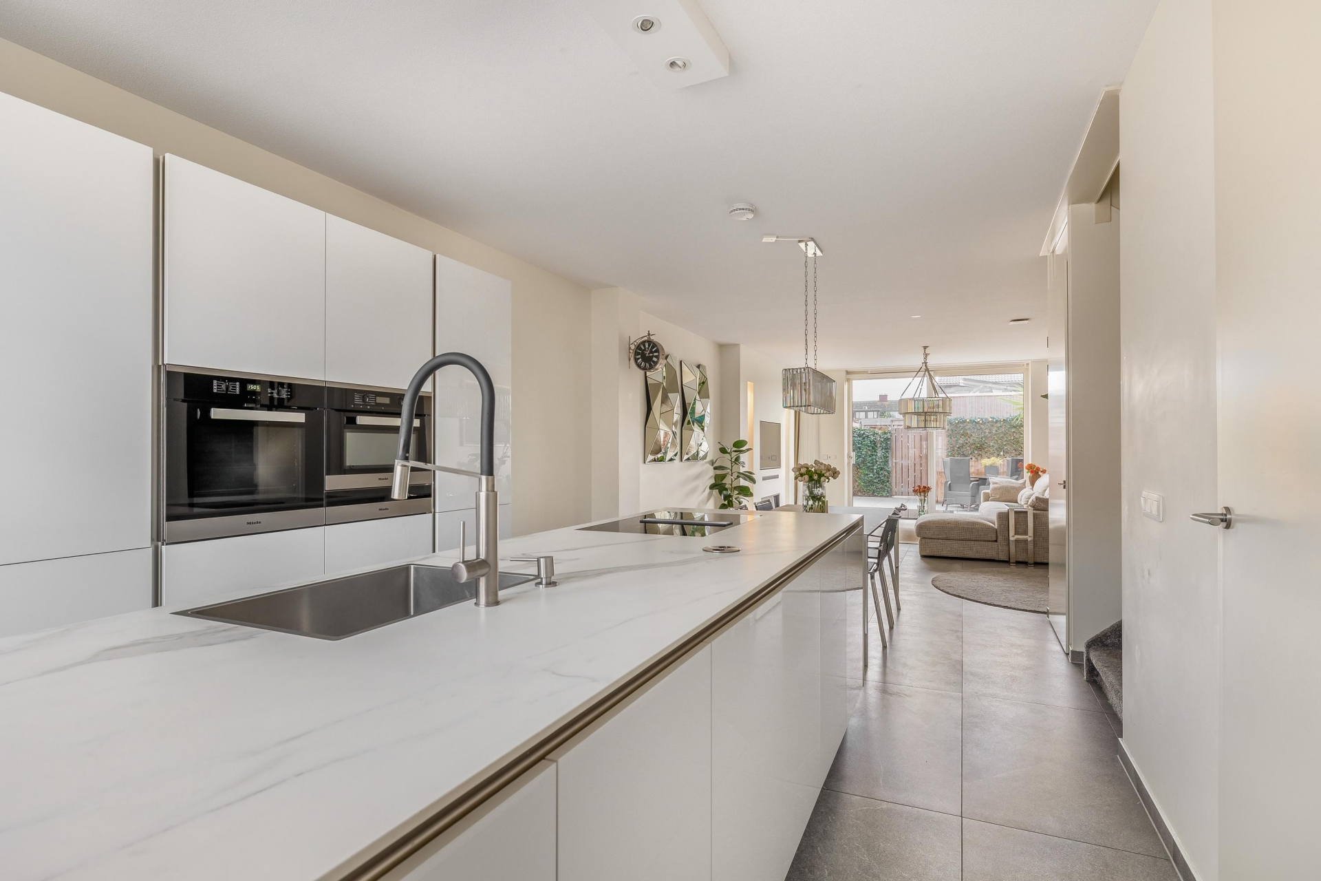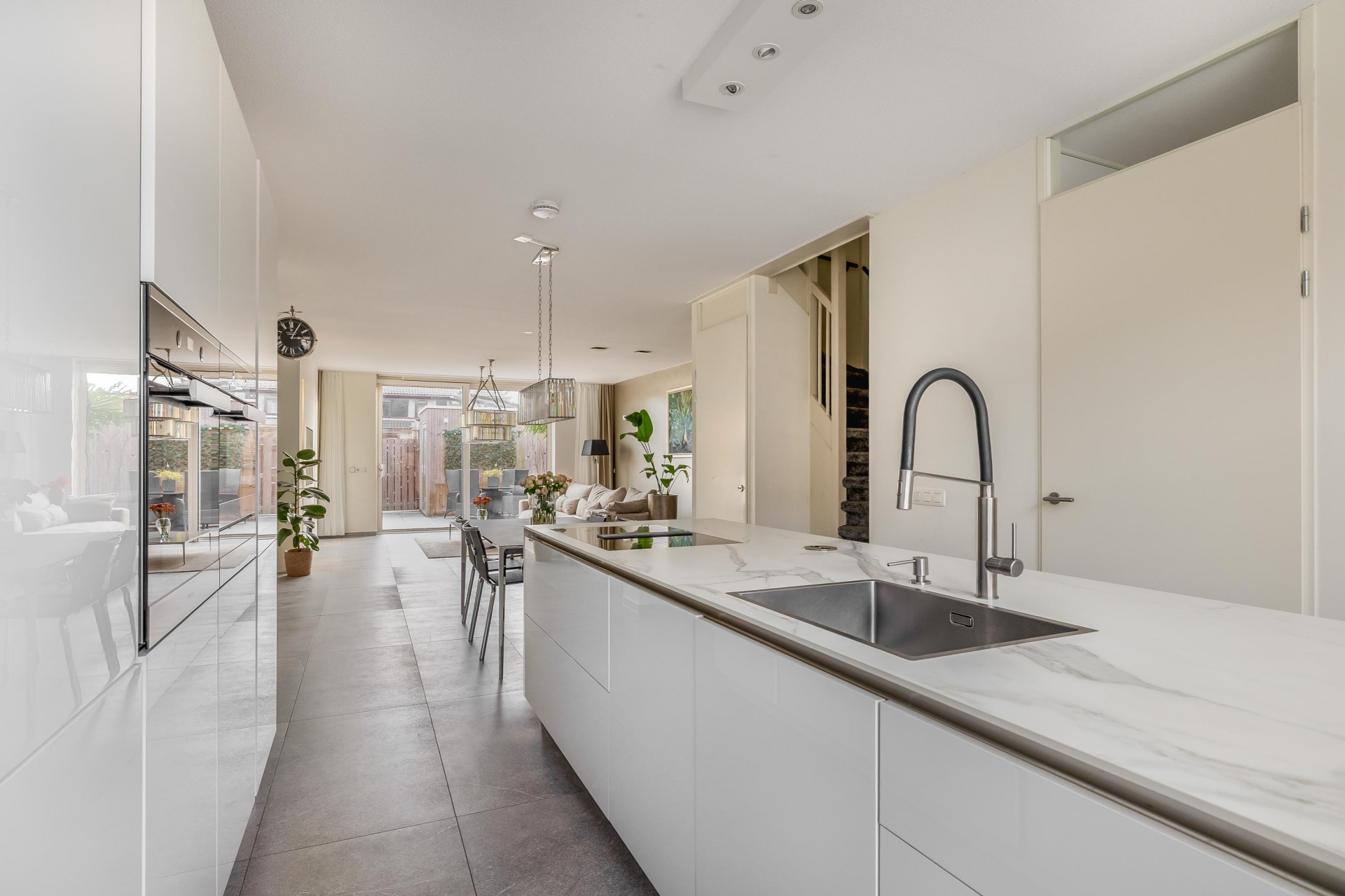 De ruime woonkamer is licht, strak en uitnodigend. Dankzij de grote schuifpui heb je mooi zicht op de tuin en voelt buiten als een verlengde van binnen. De grijze tegelvloer, de neutrale wanden en de slimme indeling zorgen ervoor dat je hier echt je eigen sfeer kunt creëren. Aan de voorzijde ligt de moderne keuken, uitgevoerd met een wit kookeiland en geïntegreerde inbouwapparatuur. Koken, kletsen en leven gaan hier naadloos in elkaar over.