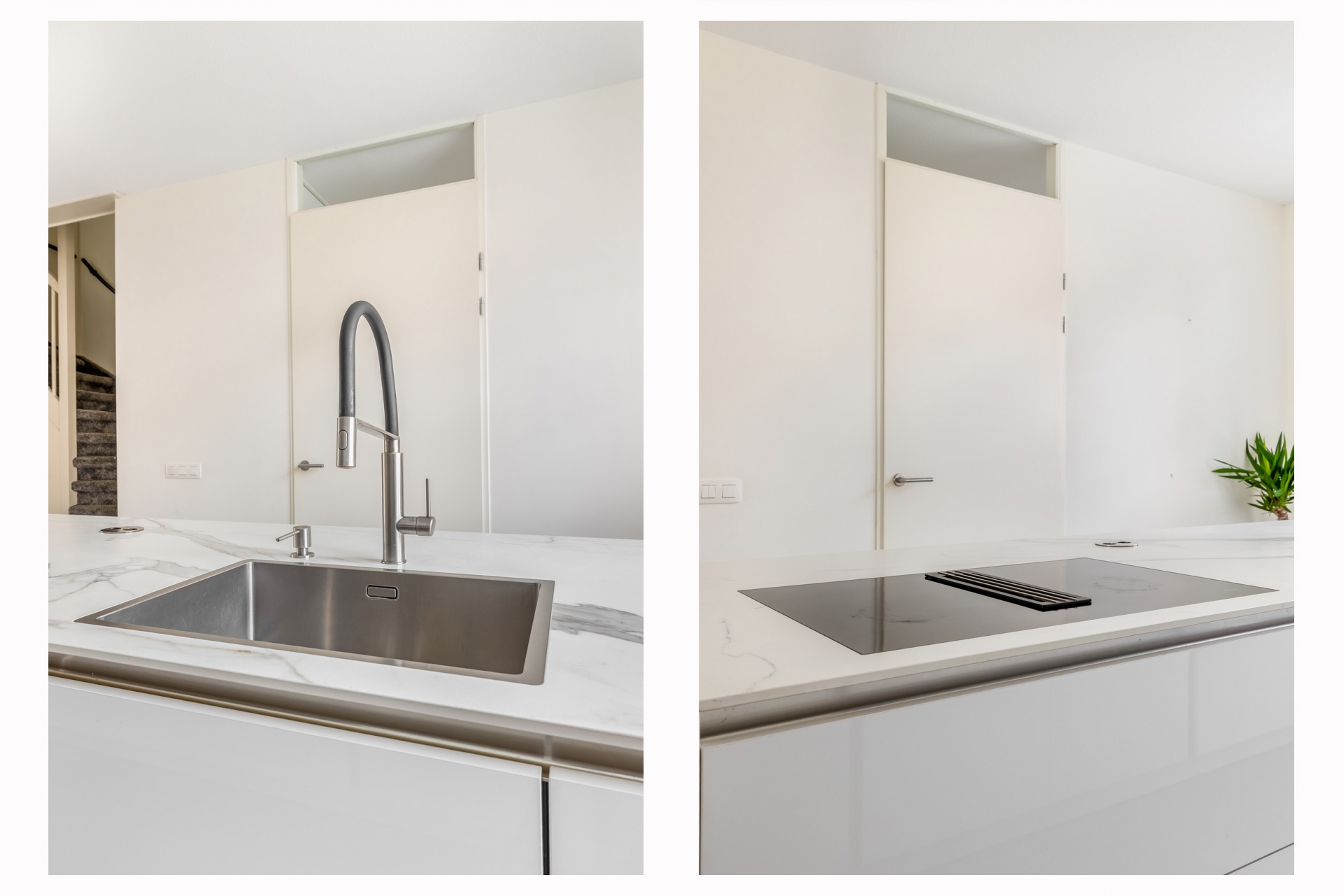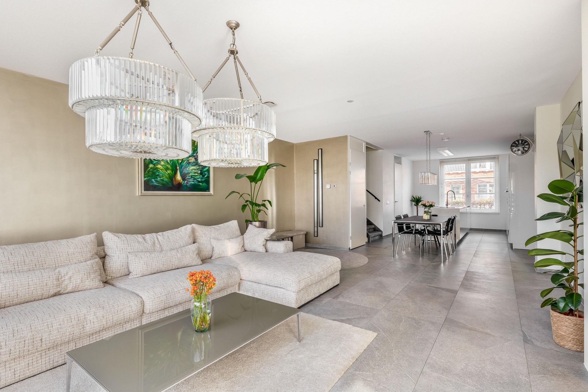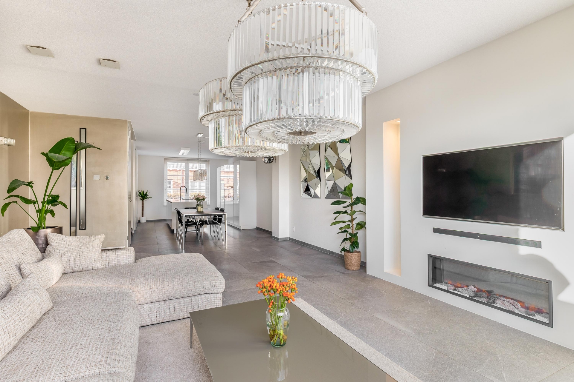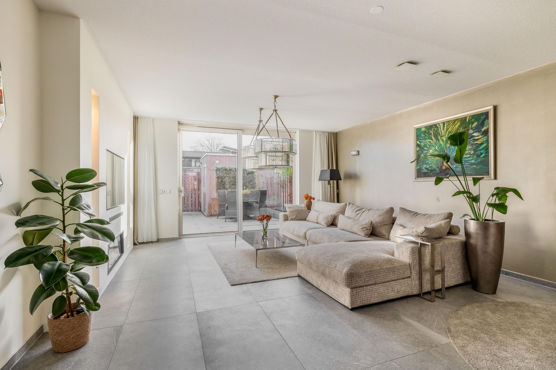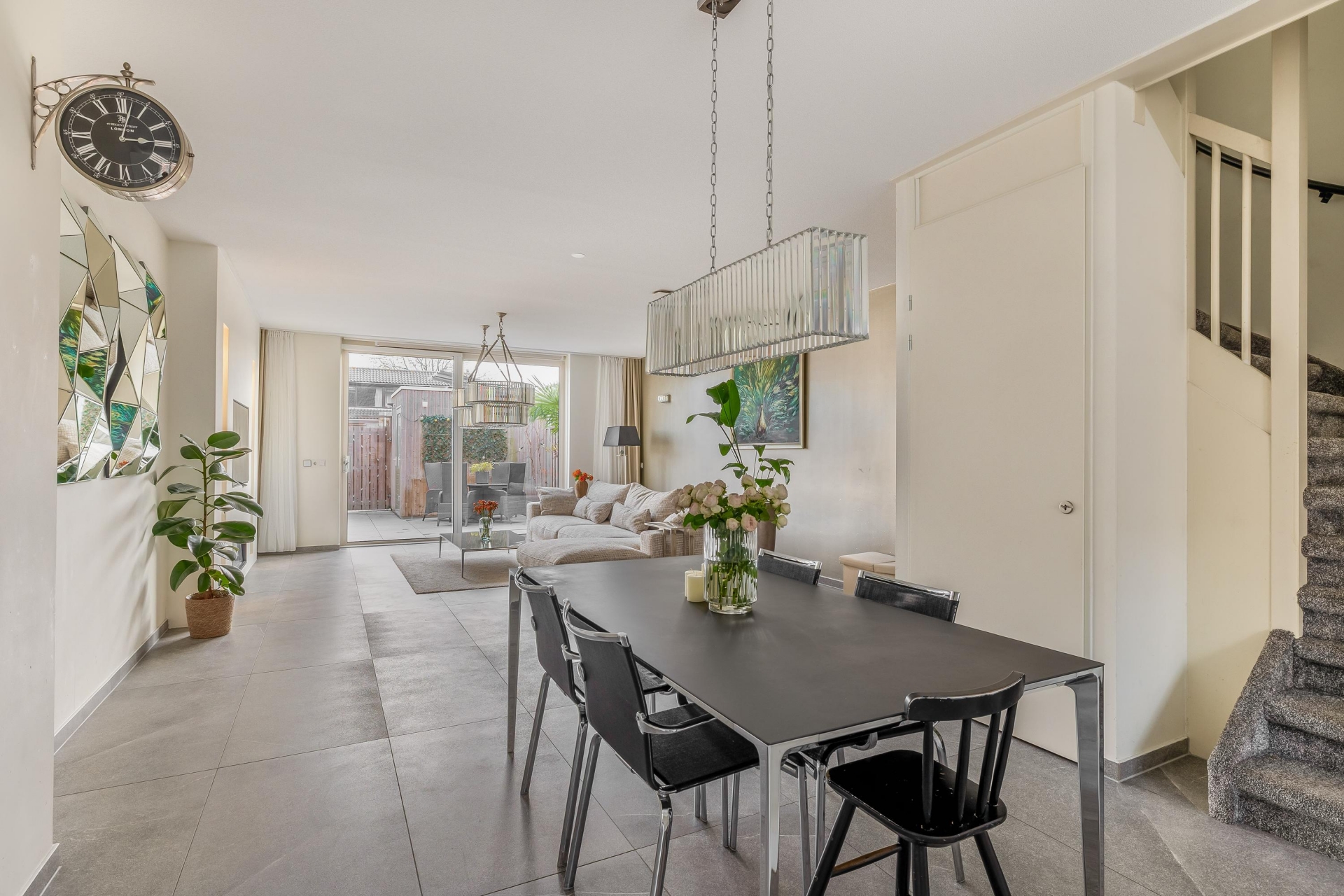 De ruime woonkamer is licht, strak en uitnodigend. Dankzij de grote schuifpui heb je mooi zicht op de tuin en voelt buiten als een verlengde van binnen. De grijze tegelvloer, de neutrale wanden en de slimme indeling zorgen ervoor dat je hier echt je eigen sfeer kunt creëren. Aan de voorzijde ligt de moderne keuken, uitgevoerd met een wit kookeiland en geïntegreerde inbouwapparatuur. Koken, kletsen en leven gaan hier naadloos in elkaar over.