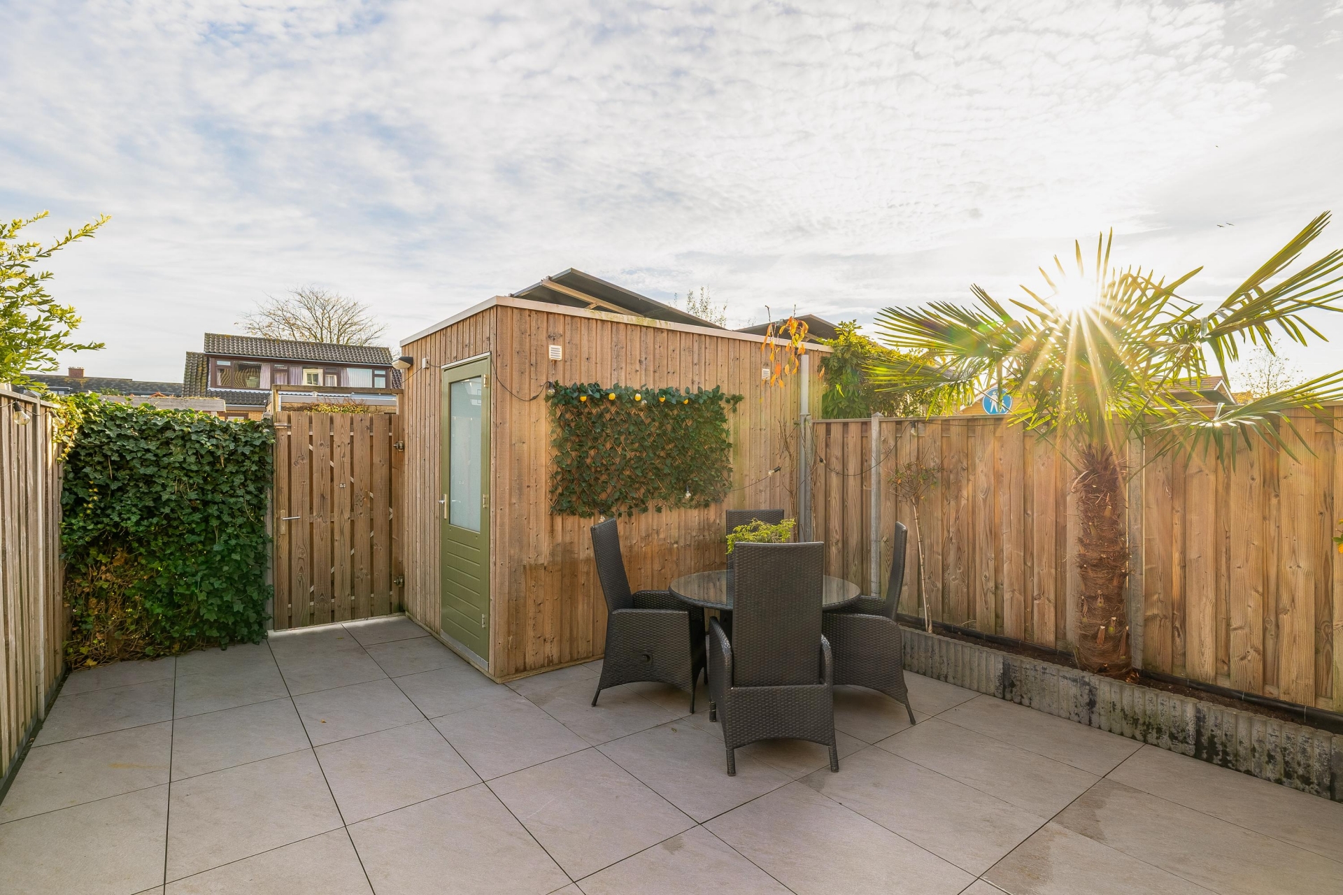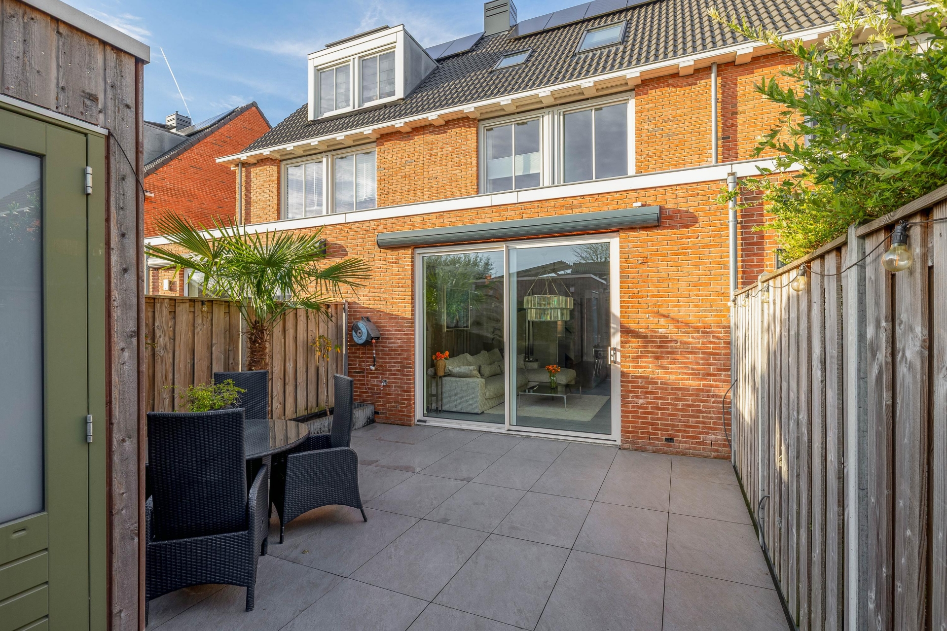 Vanuit de woonkamer stap je zo de strak aangelegde achtertuin in. De tuin ligt op het zuidoosten, wat betekent: veel zon in de middag en avond – perfect voor een barbecue of borrel met vrienden. De houten schuur achterin biedt genoeg ruimte voor fietsen en tuinkussens, en dankzij de betegeling is de tuin onderhoudsarm.