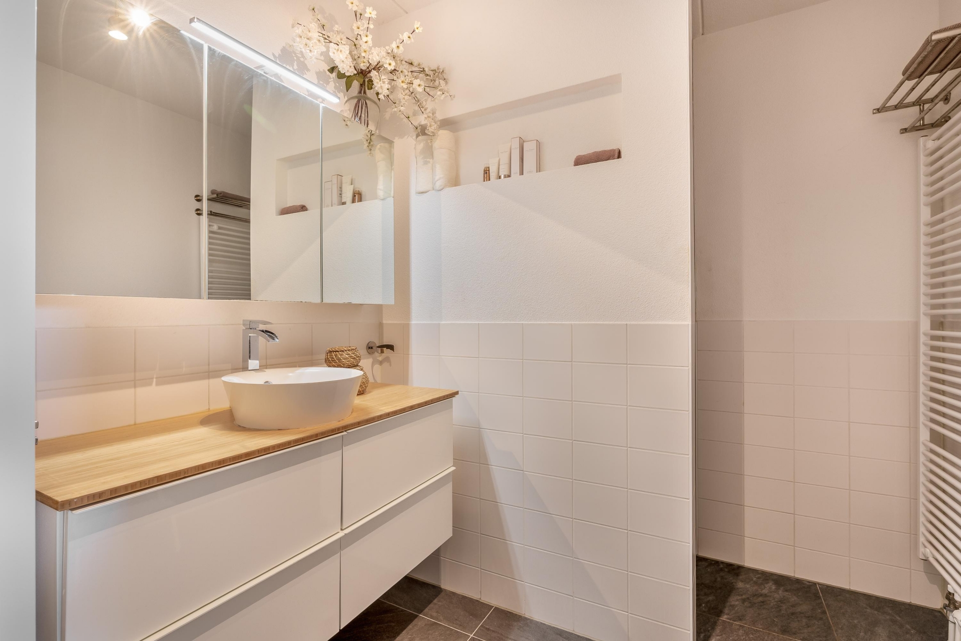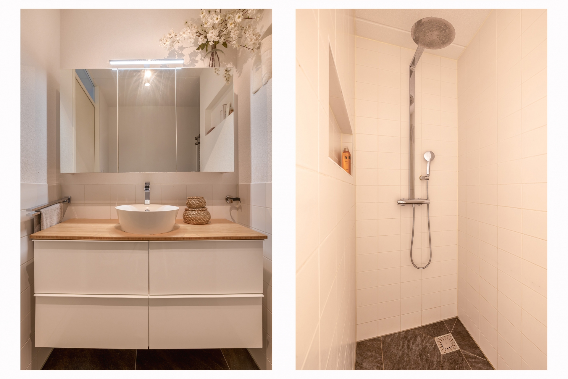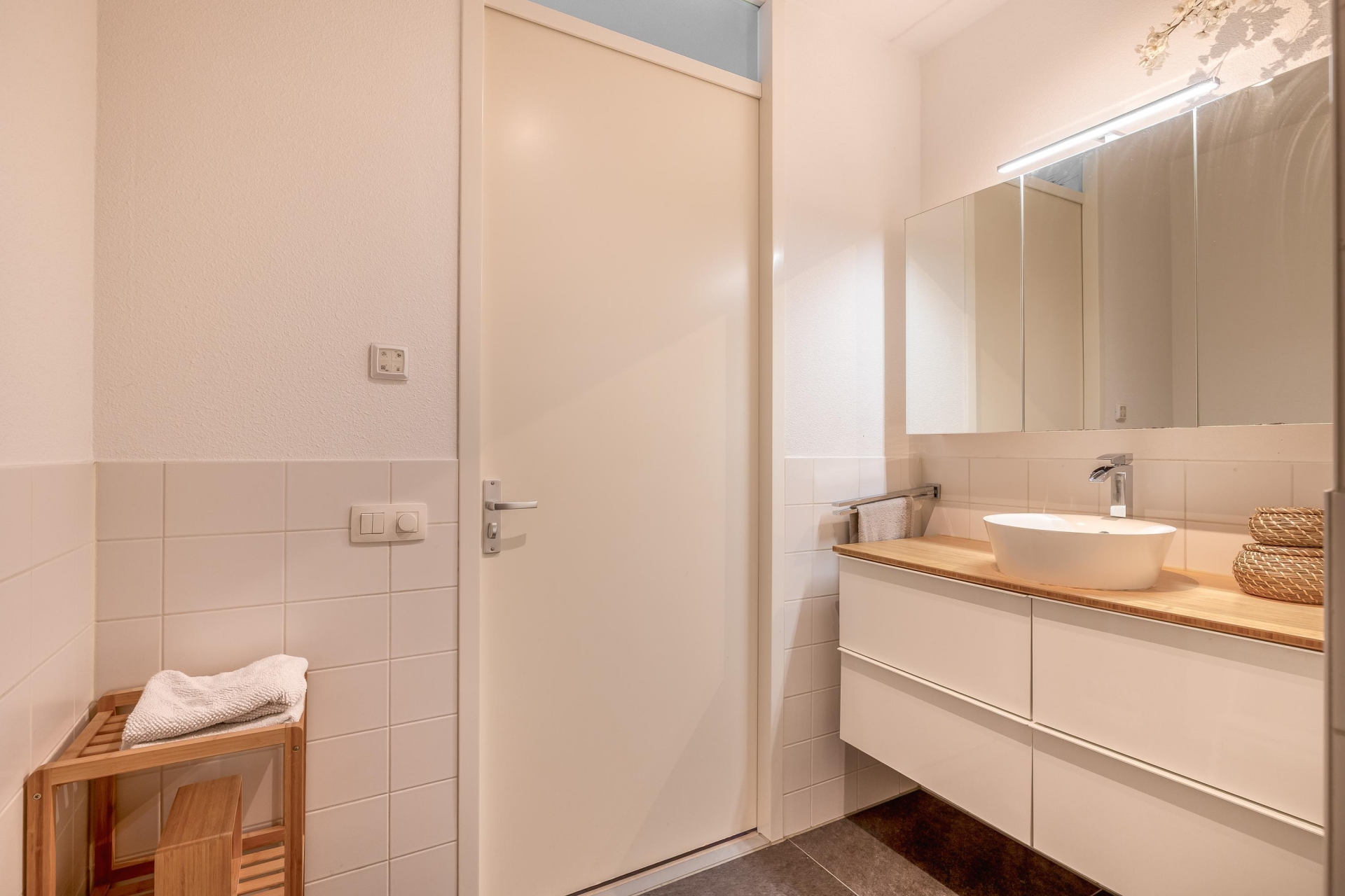 De badkamer is netjes afgewerkt en voorzien van een inloopdouche en wastafel. Daarnaast is er een separaat toilet aanwezig. Alles is fris, modern en klaar voor gebruik – klussen is hier niet nodig.
