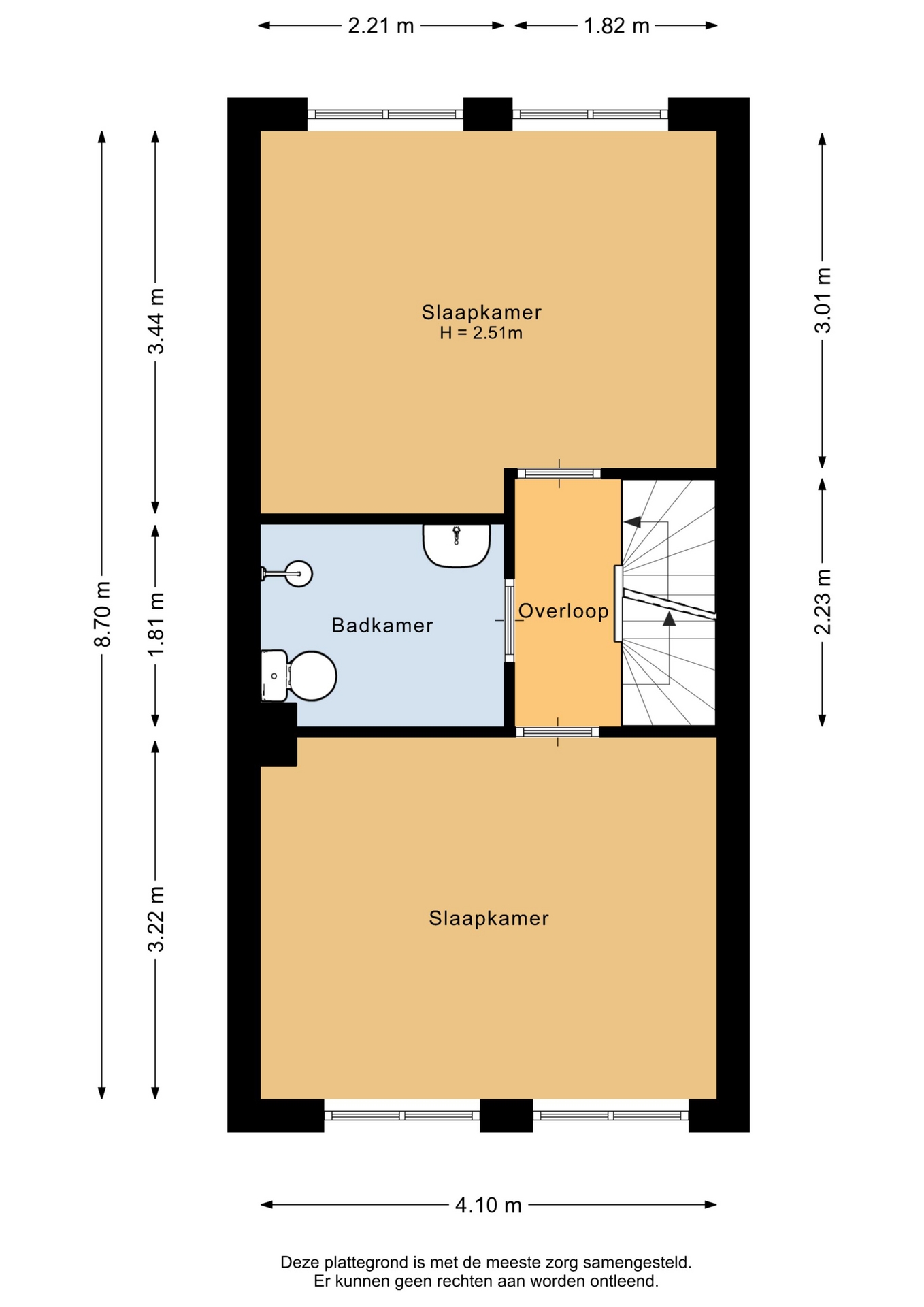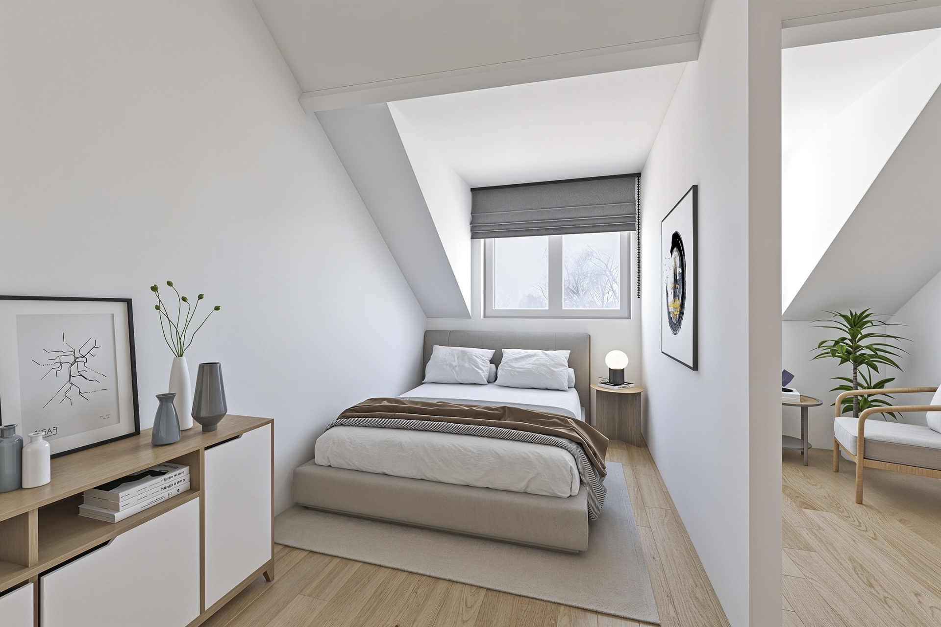 Op de 1e verdieping zijn 2 slaapkamers. De badkamer is eenvoudig en kan met een slimme indeling volledig naar eigen smaak worden ingericht. De woning telt in totaal 3 verdiepingen, met op de zolder nog een extra slaapkamer of mogelijkheden voor uitbreiding, afhankelijk van je wensen.