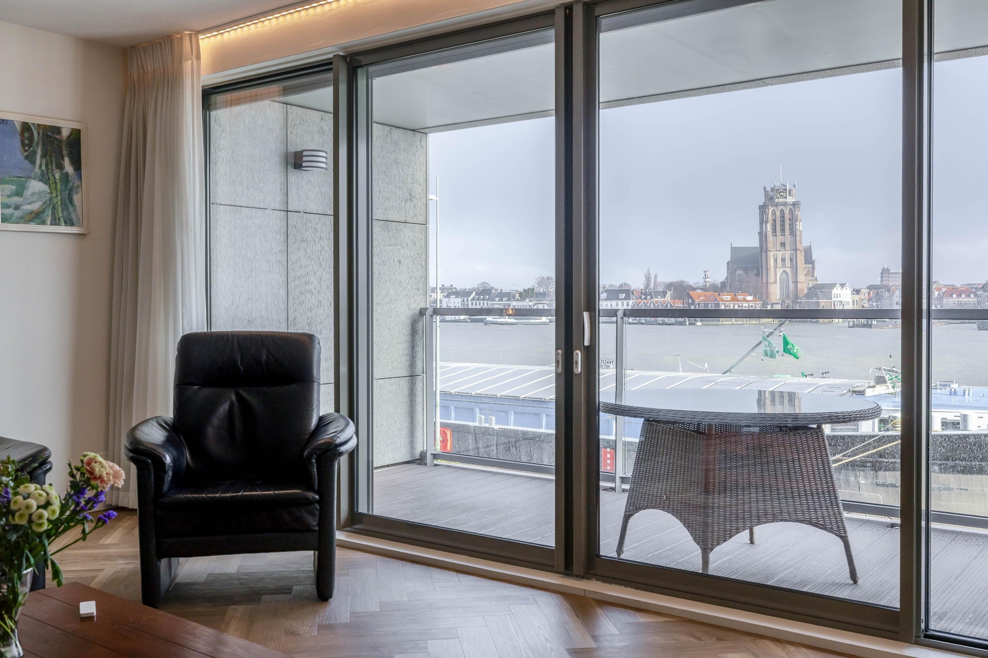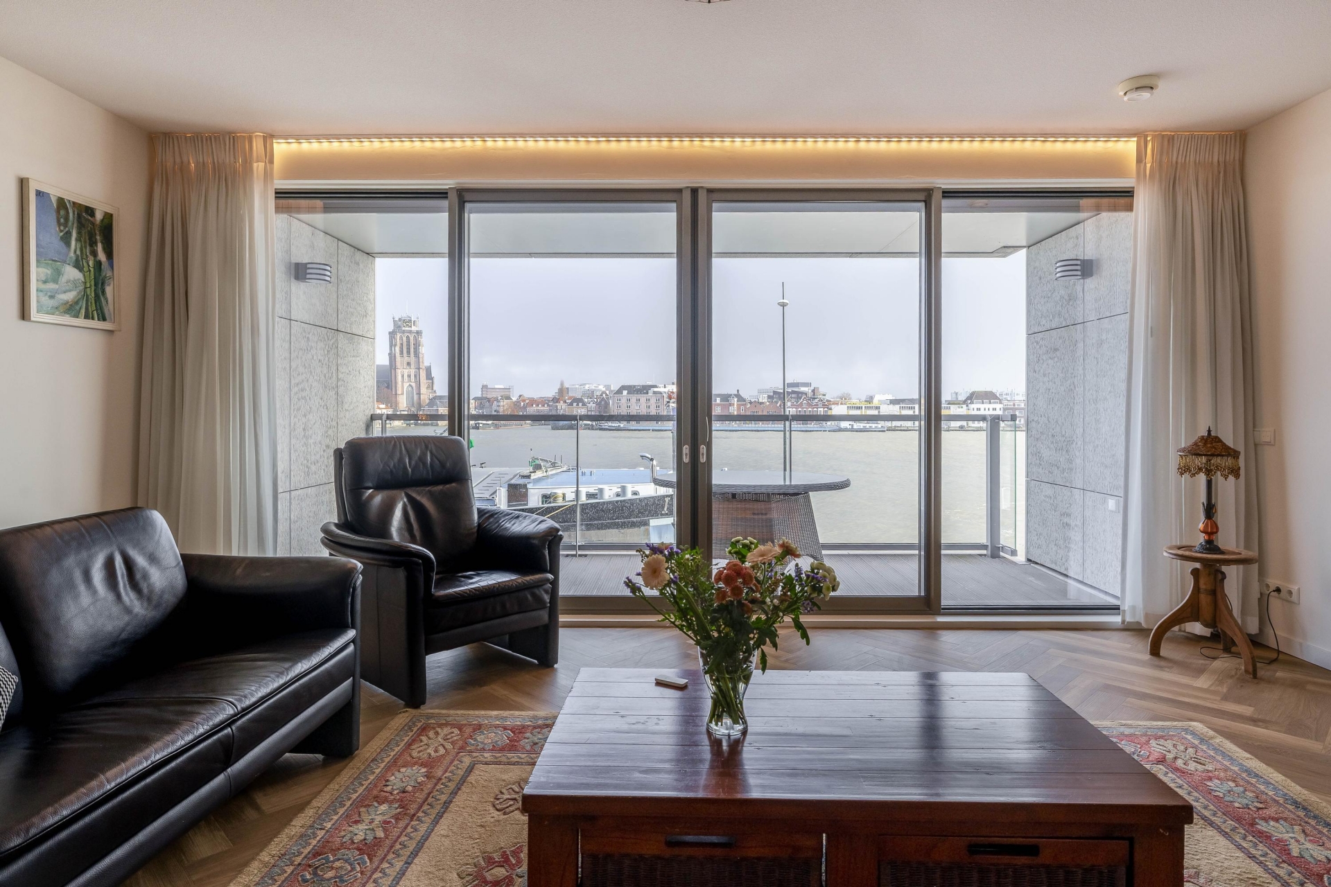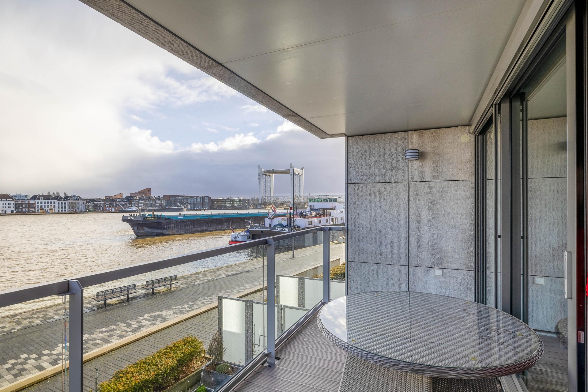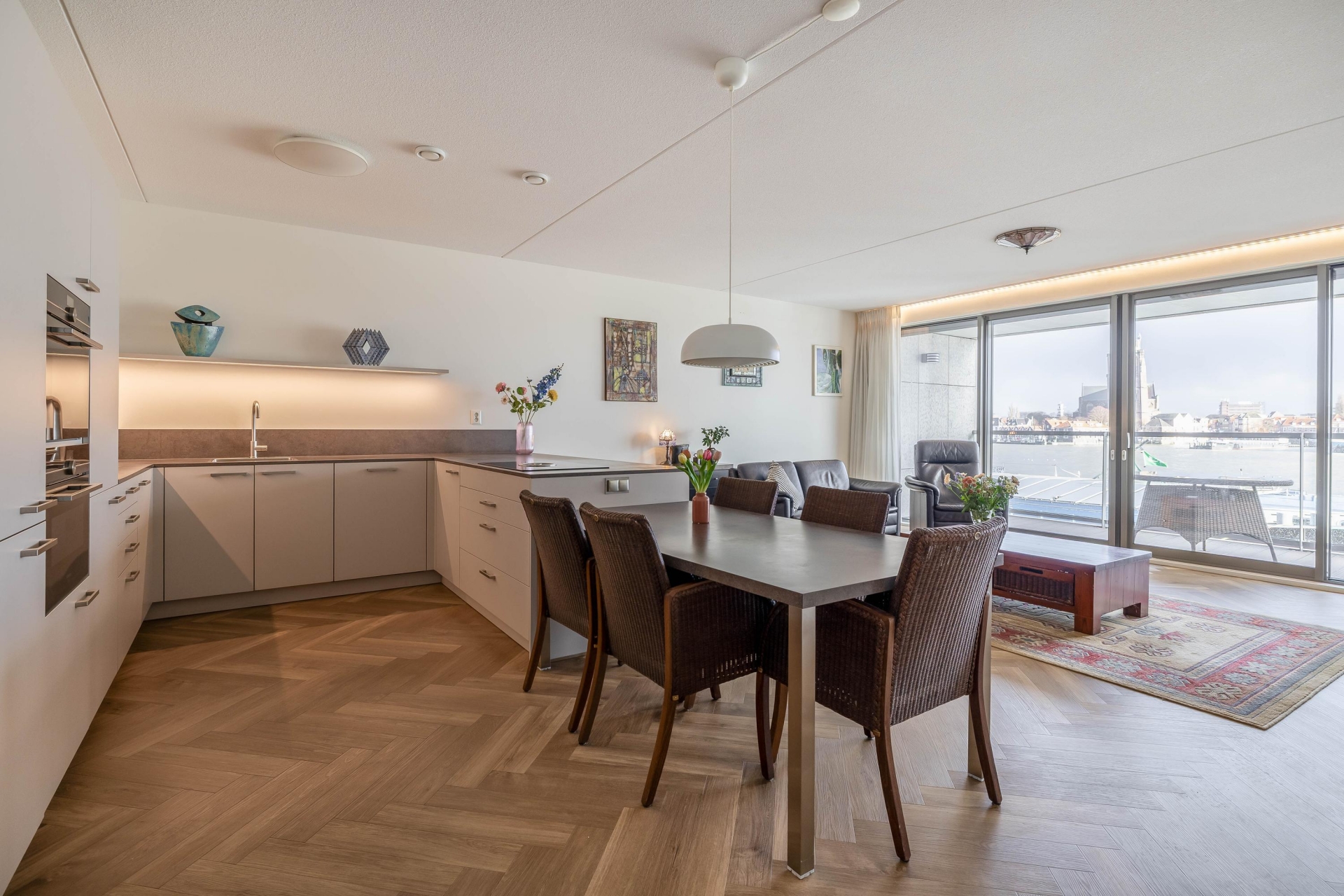 De royale, lichte woonkamer vormt het hart van de woning en biedt dankzij de grote raampartijen een fenomenaal uitzicht over de rivier en het Eiland van Dordrecht. Via de brede schuifpui bereikt u het riante terras, waar u in alle rust kunt genieten van de zon en het voorbijvarende scheepvaartverkeer. Het terras is voorzien van elektra en verlichting en beschikt over drie elektrische screens voor extra comfort.