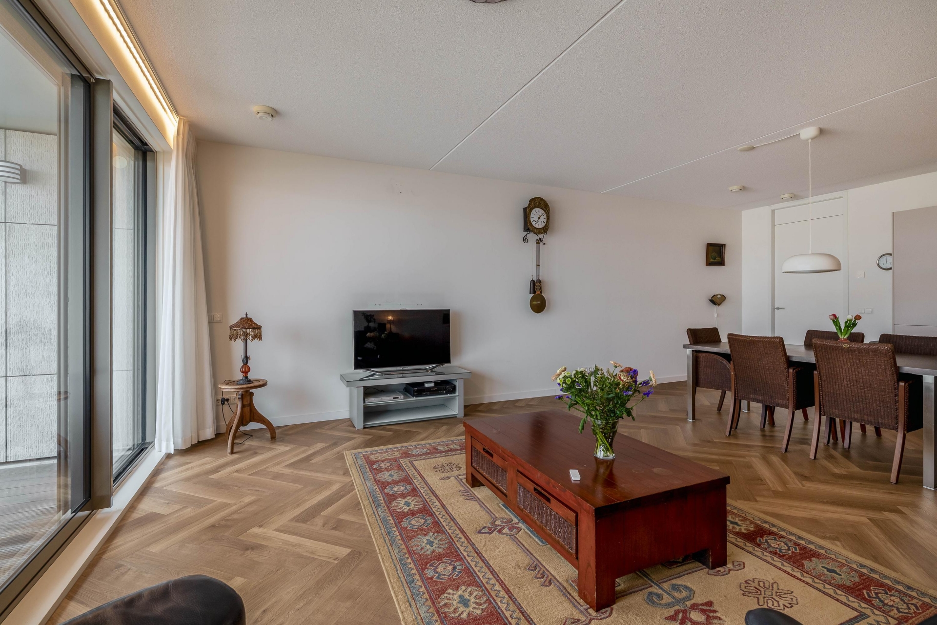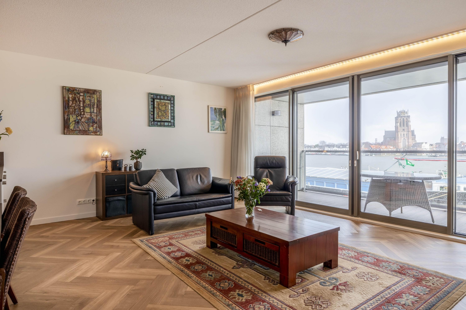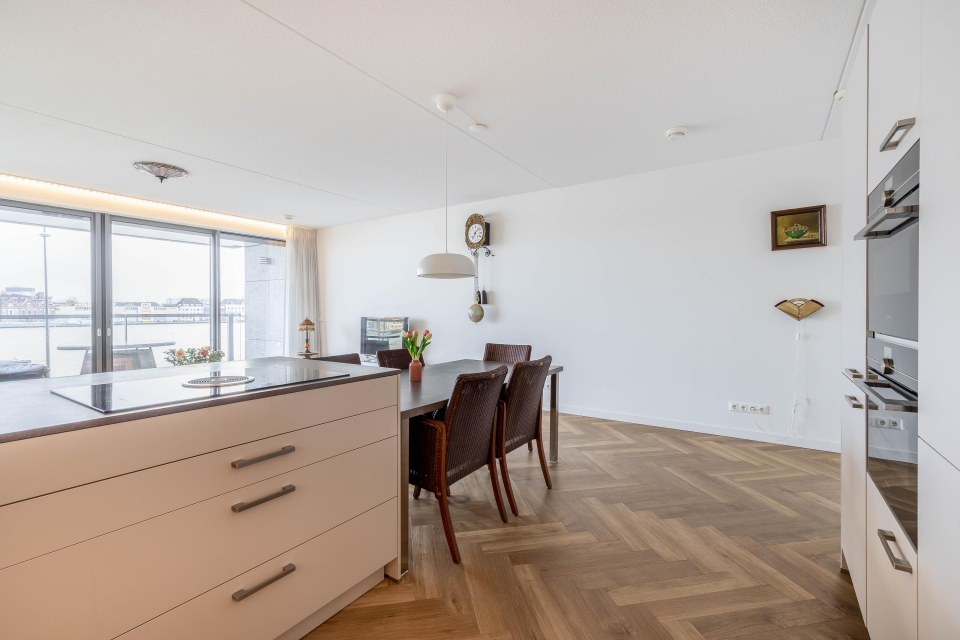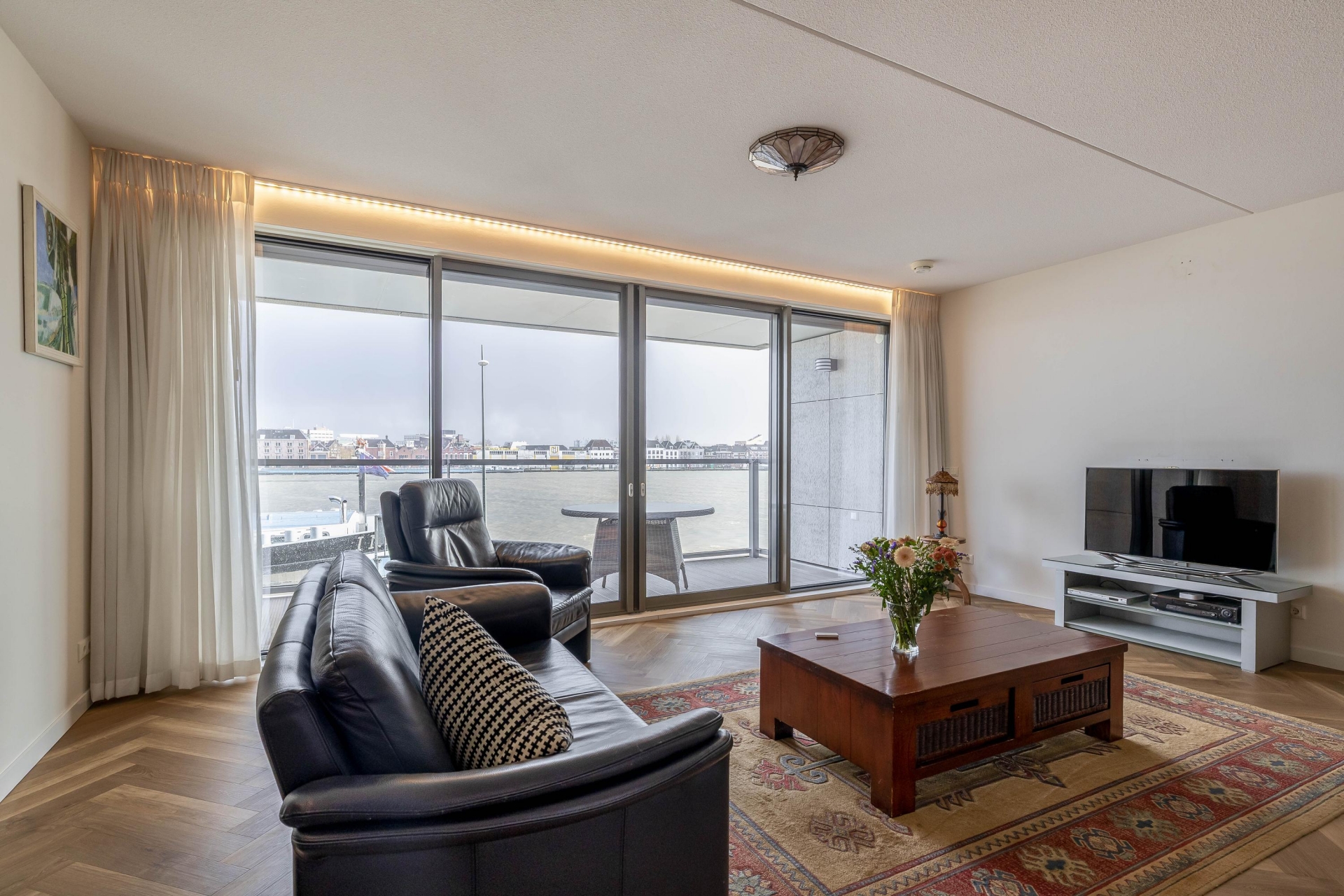 De royale, lichte woonkamer vormt het hart van de woning en biedt dankzij de grote raampartijen een fenomenaal uitzicht over de rivier en het Eiland van Dordrecht. Via de brede schuifpui bereikt u het riante terras, waar u in alle rust kunt genieten van de zon en het voorbijvarende scheepvaartverkeer. Het terras is voorzien van elektra en verlichting en beschikt over drie elektrische screens voor extra comfort.