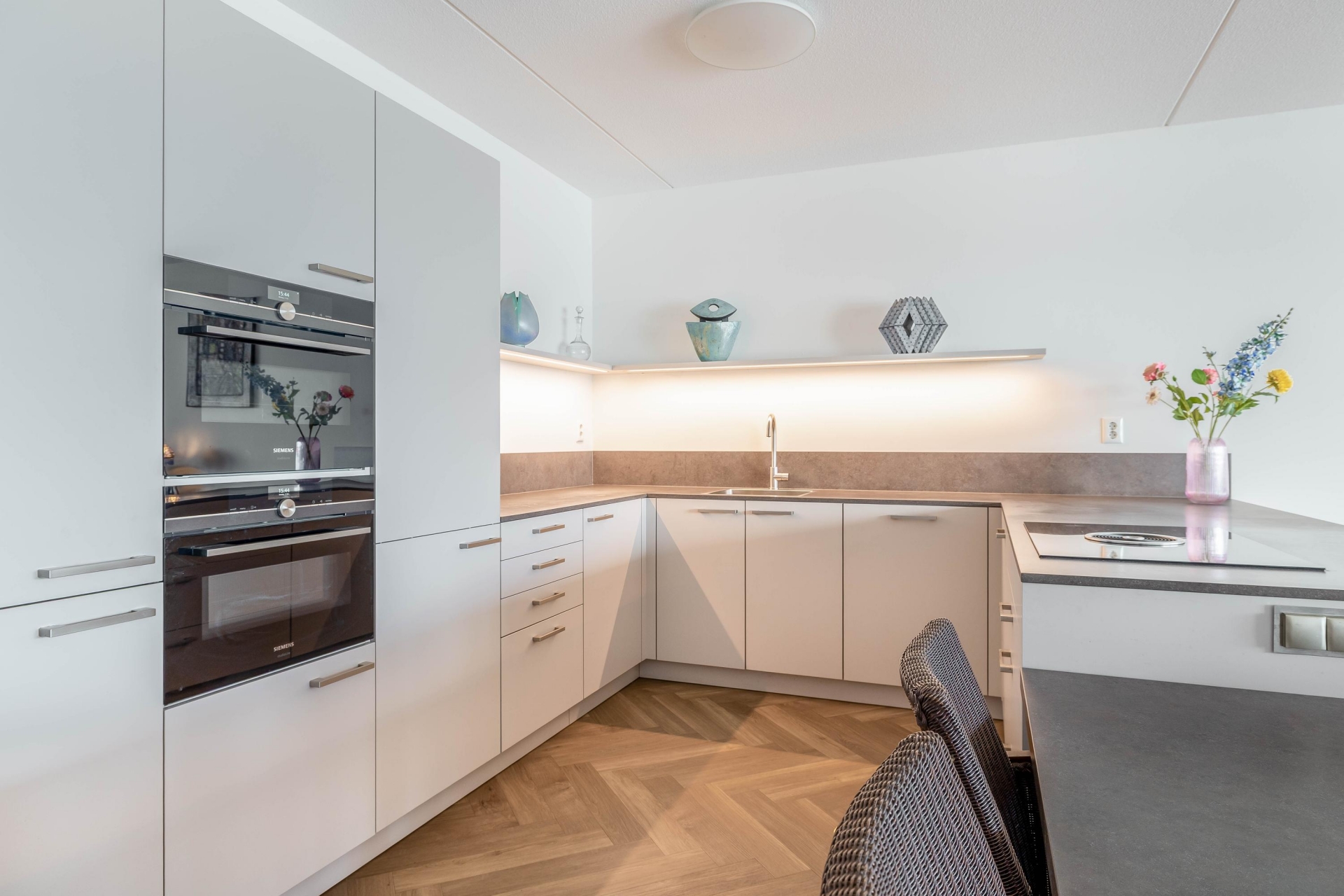 De moderne open keuken met kookeiland is uitgerust met hoogwaardige inbouwapparatuur van toonaangevende merken, waaronder: