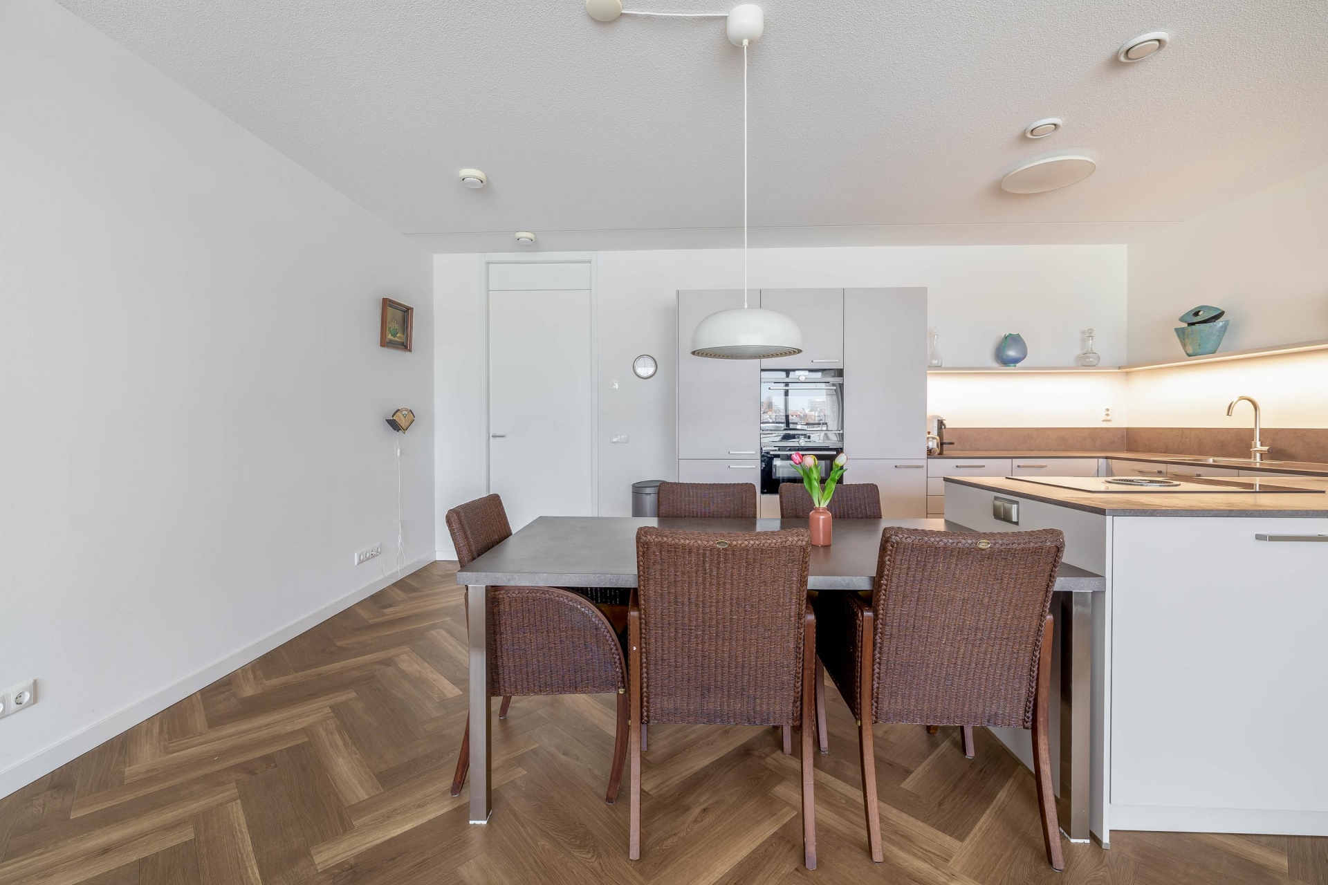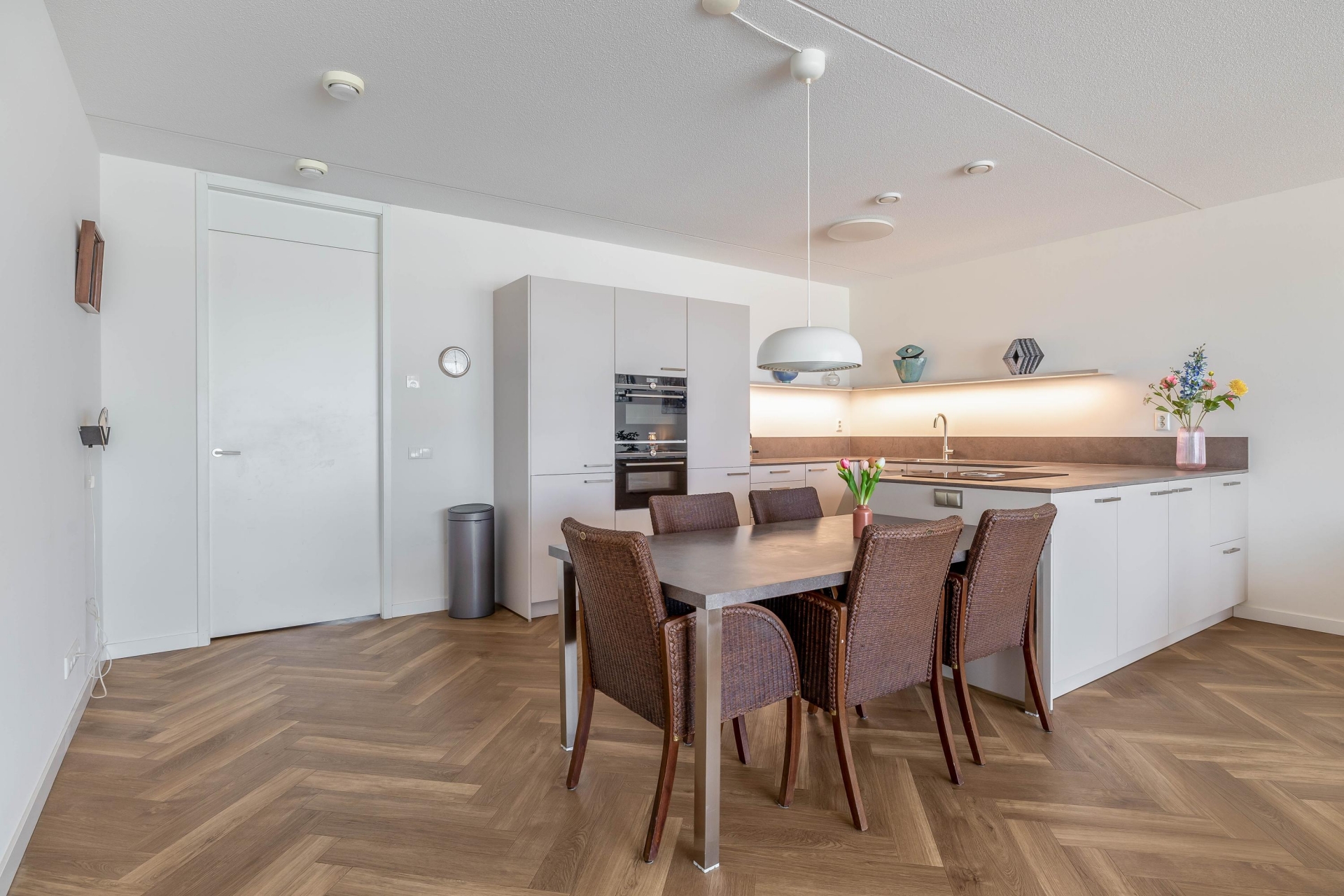 Het appartement is tot in detail afgewerkt en volledig instapklaar. De gehele woning is voorzien van een moderne pvc-vloer met comfortabele vloerverwarming, per ruimte afzonderlijk regelbaar. Strak gestuukte plafonds, stompe binnendeuren en een doordachte indeling zorgen voor een rustige en luxe uitstraling.