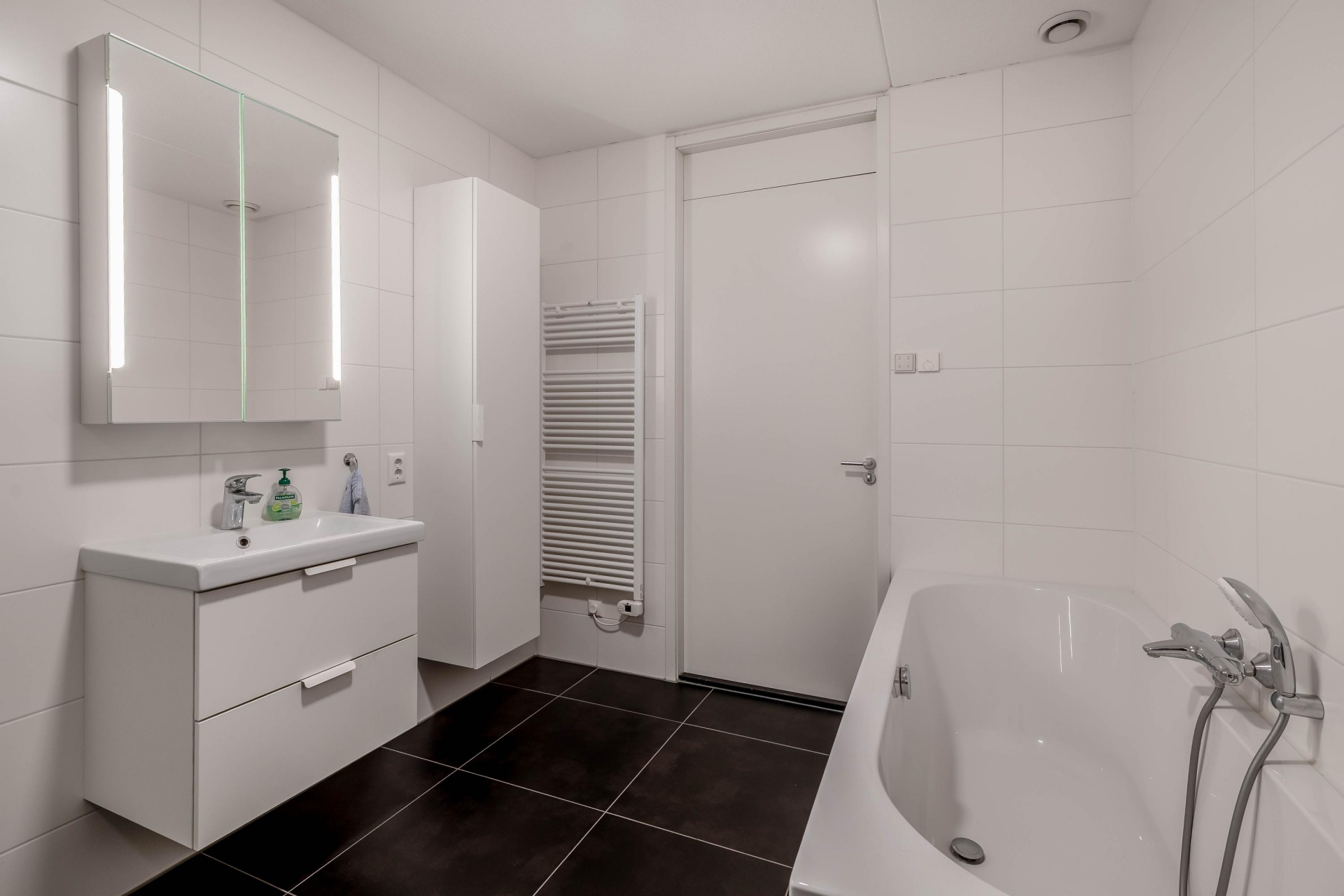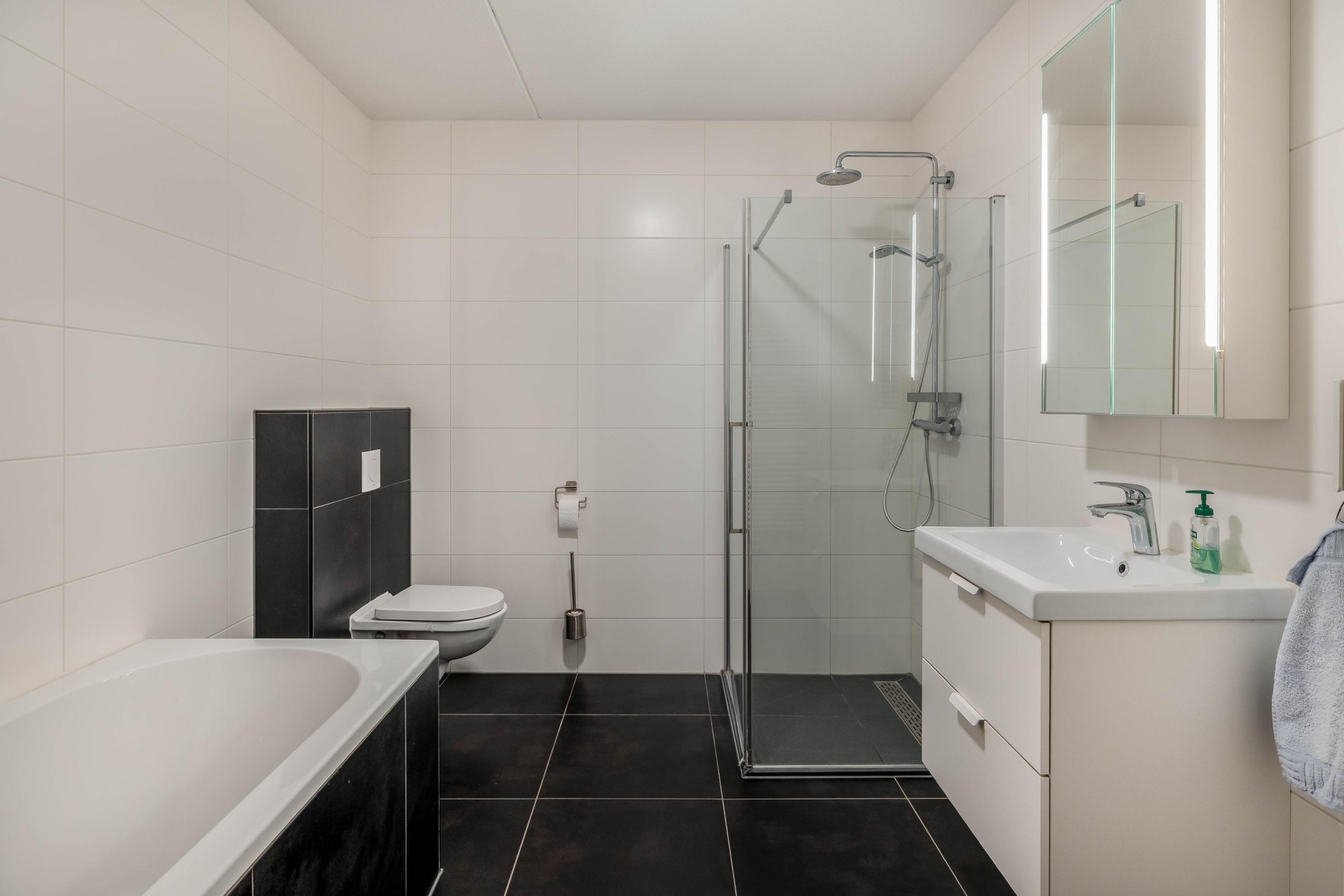 De stijlvolle badkamer is compleet uitgevoerd met ligbad, douchehoek, tweede toilet, wastafelmeubel en handdoekradiator.