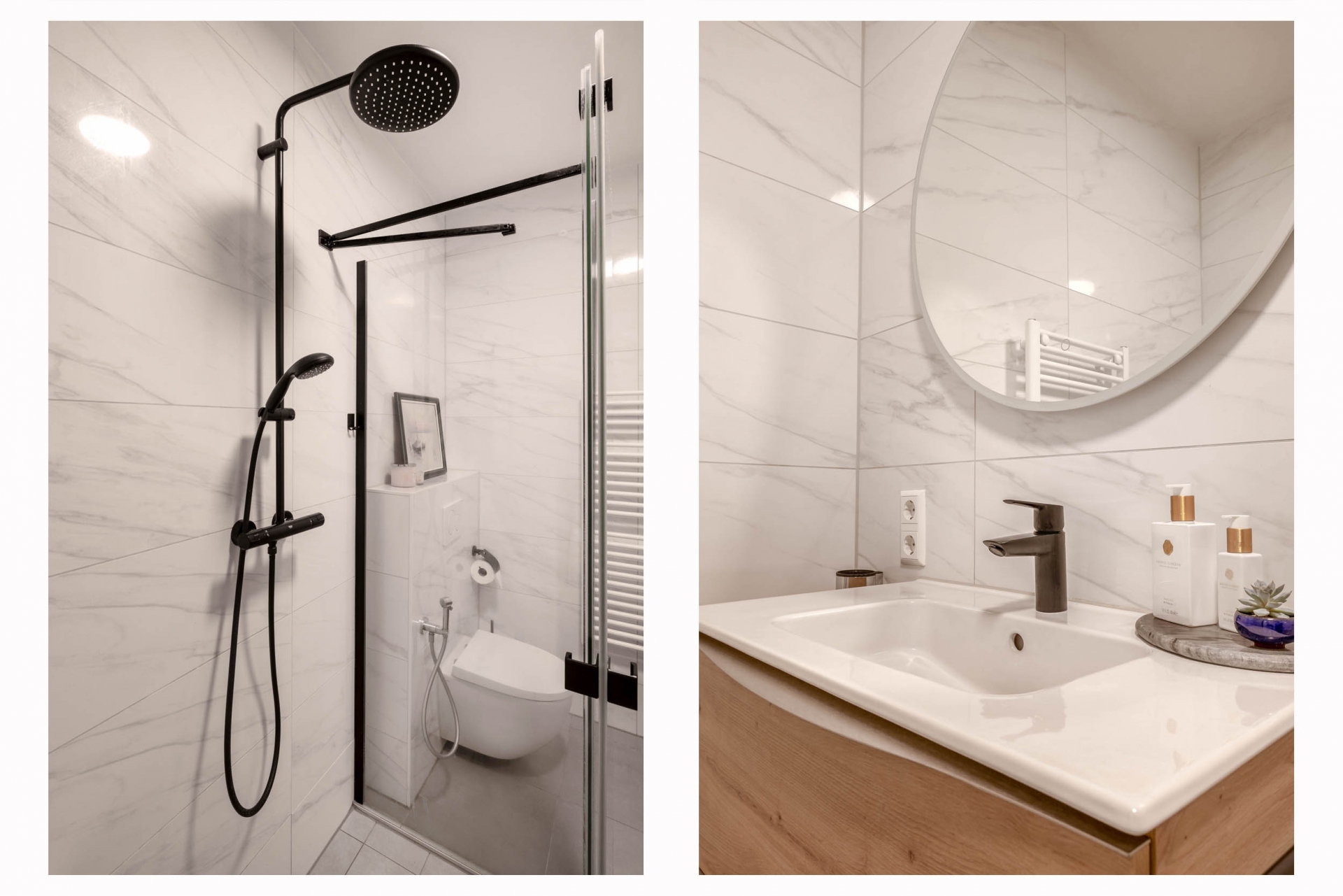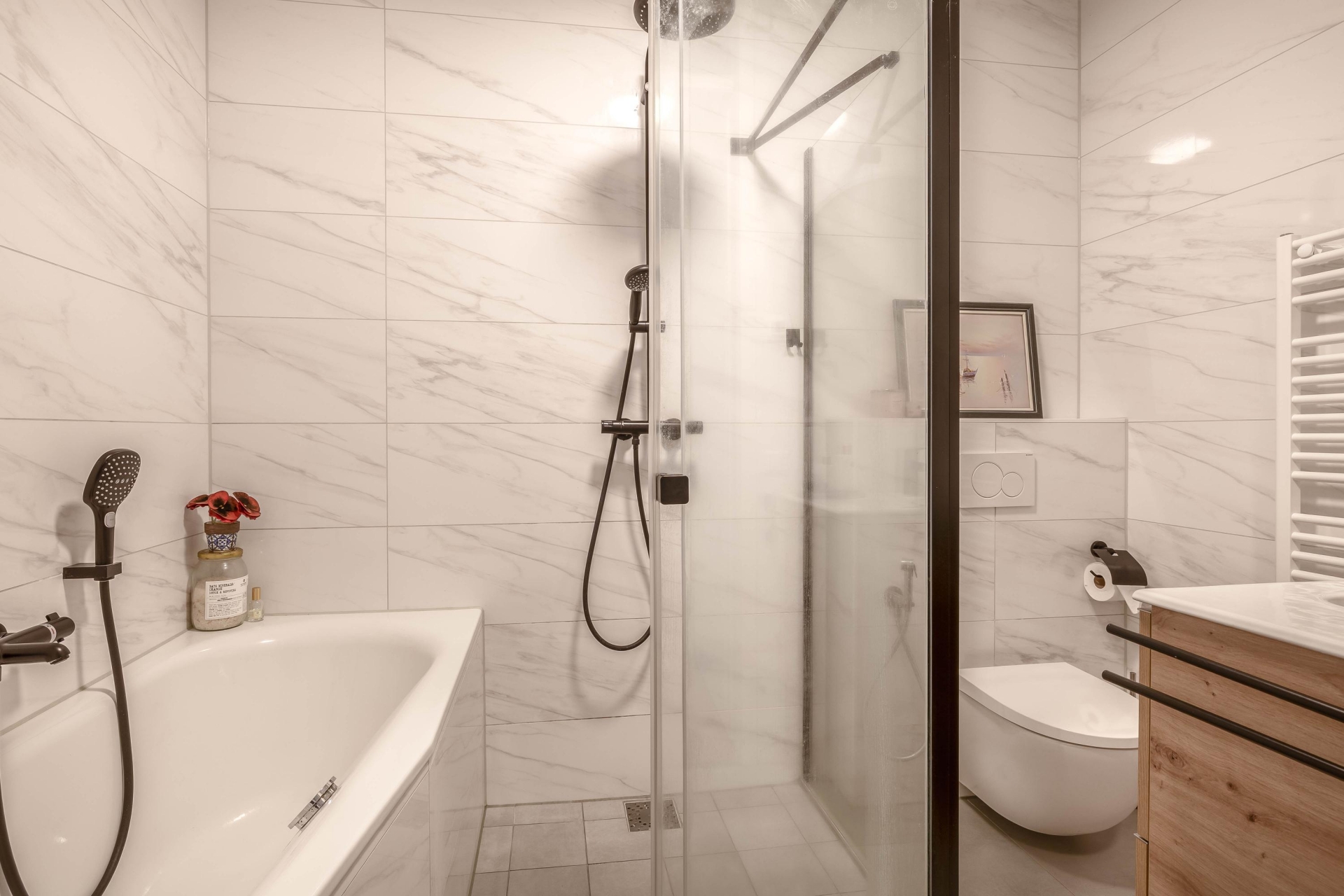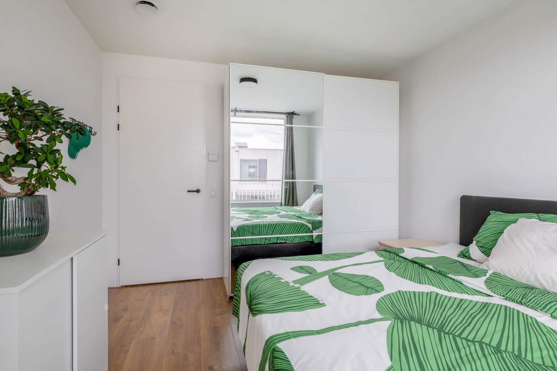 Het appartement heeft twee goed bemeten slaapkamers. De hoofdslaapkamer biedt genoeg ruimte voor een tweepersoonsbed en ruime kast, terwijl de tweede kamer perfect is als werk-, logeer- of kinderkamer. De moderne badkamer is voorzien van een ruime Hüppe inloopdouche met Grohe regendouche met waterbesparende technologie, condensvrije LED spiegel, ligbad met handdouche, fraai wastafelmeubel en toilet met bidet.