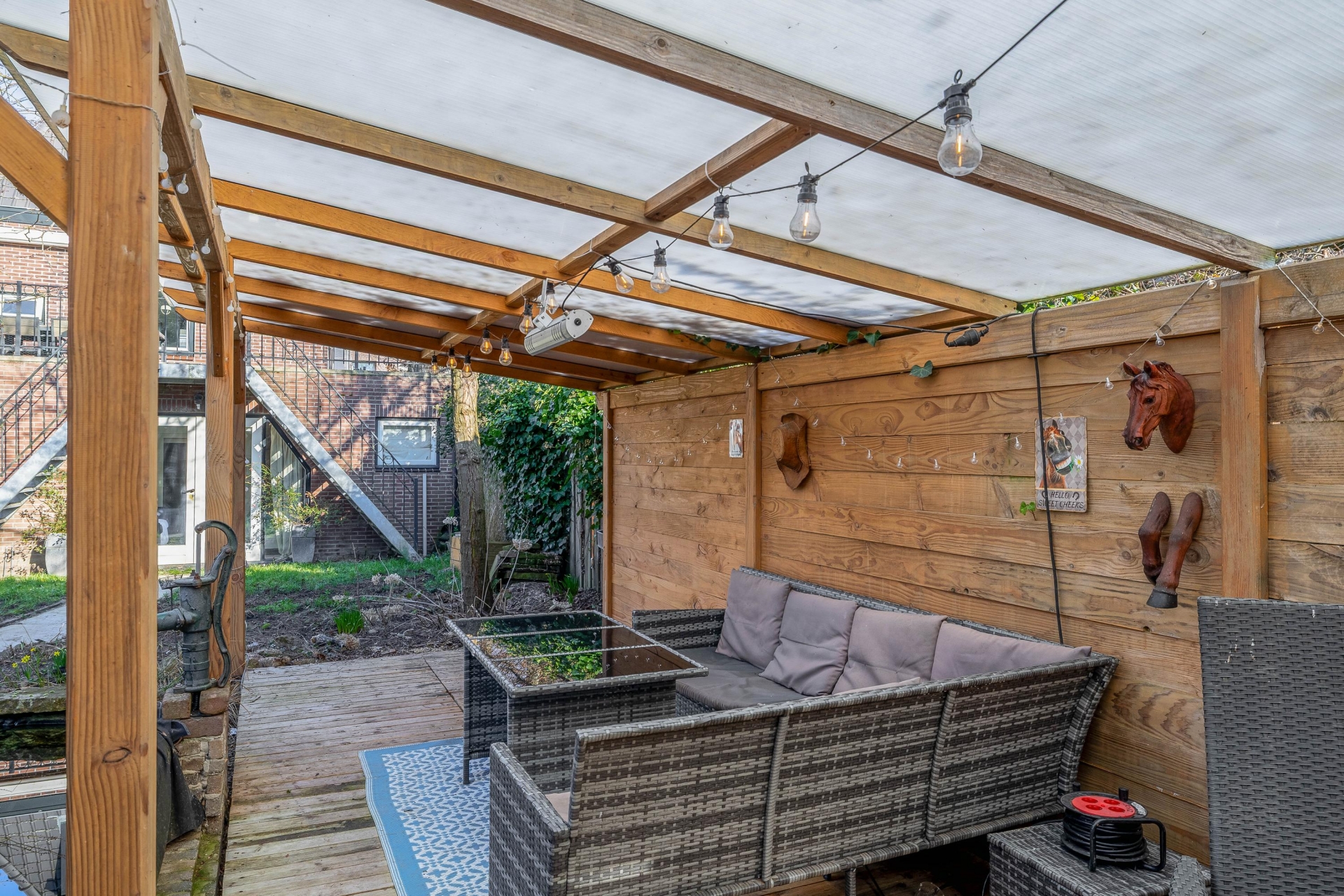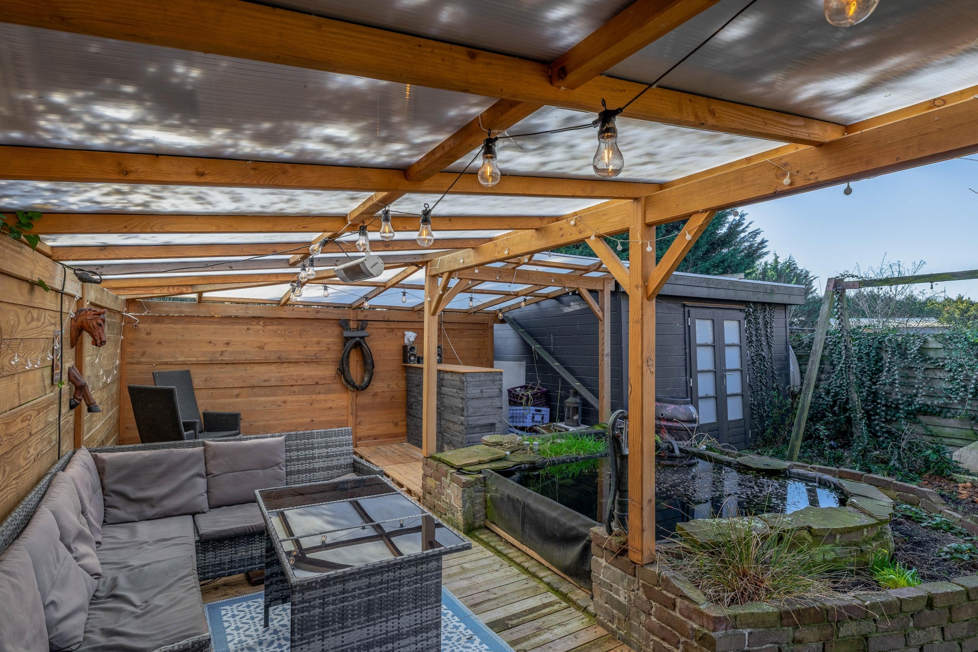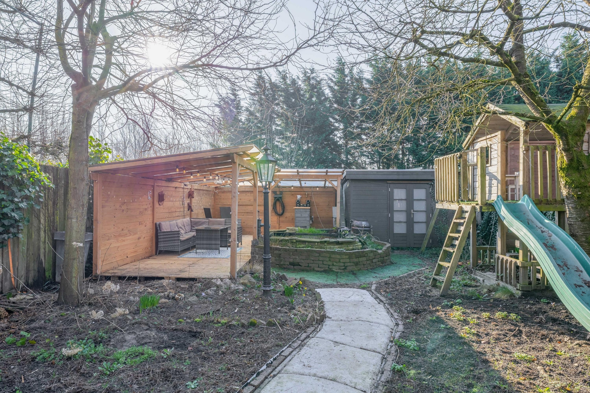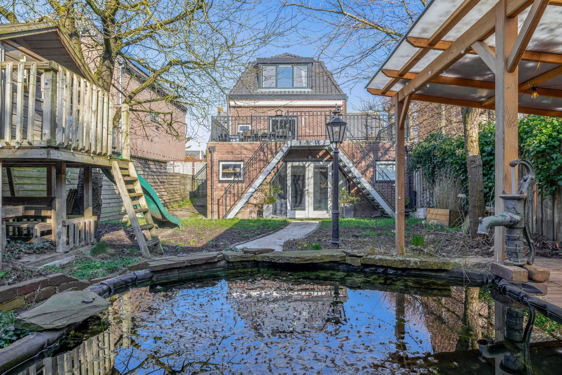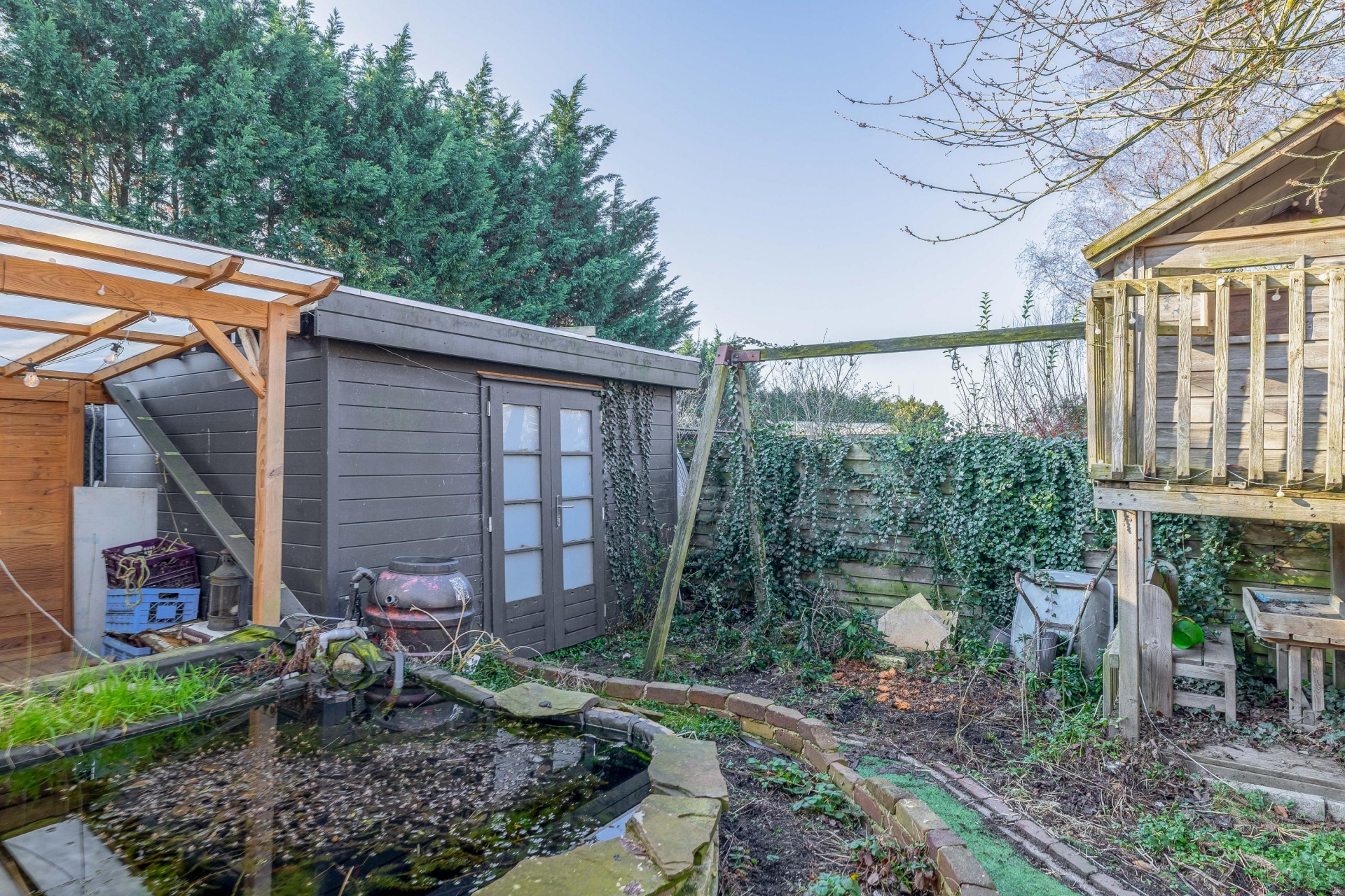 De tuin heeft een speelse indeling met groen, een vijver en verschillende plekken om te zitten of te spelen. Voor kinderen is er volop ruimte en ook voor tuinliefhebbers biedt deze tuin veel mogelijkheden. Daarnaast is er een overkapping en een berging aanwezig, wat zorgt voor extra opslagruimte voor bijvoorbeeld fietsen of tuingereedschap.