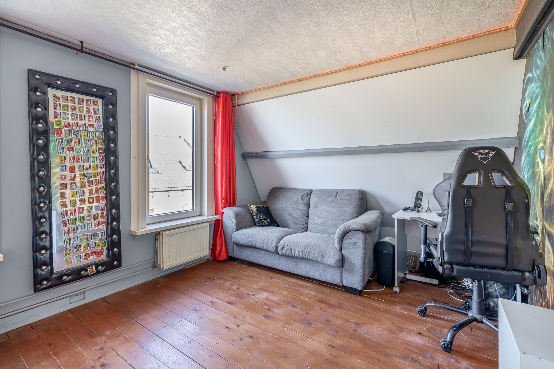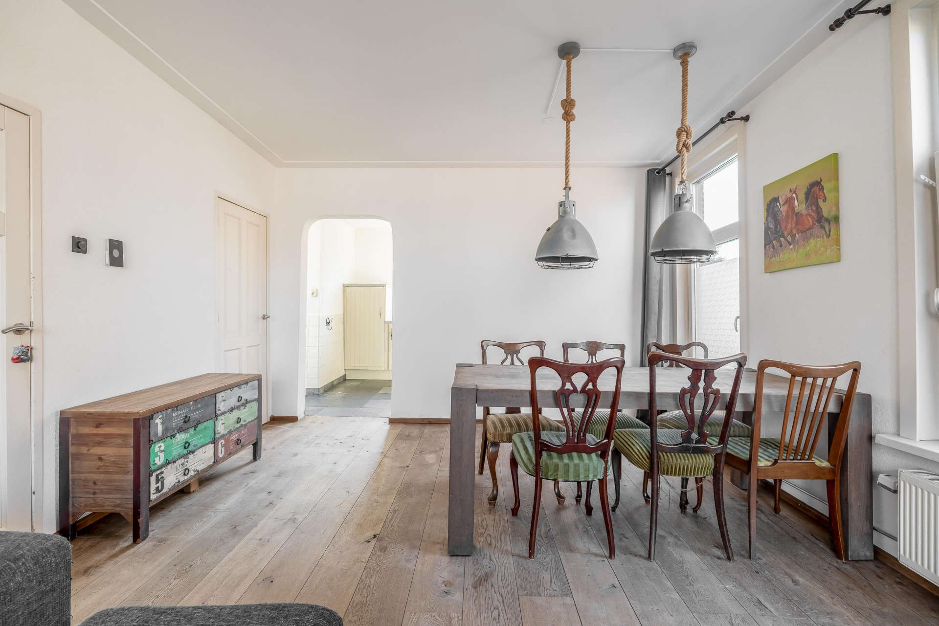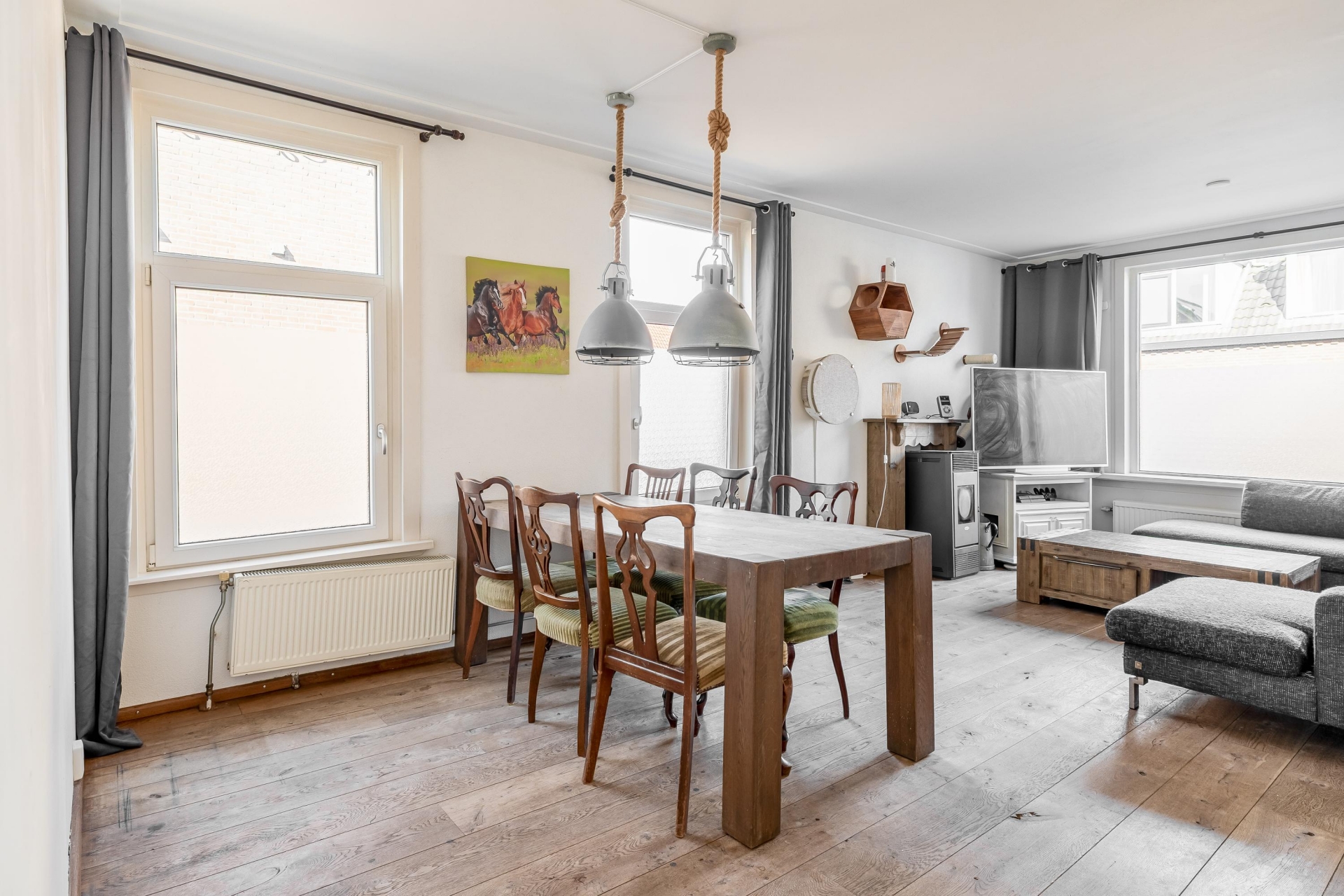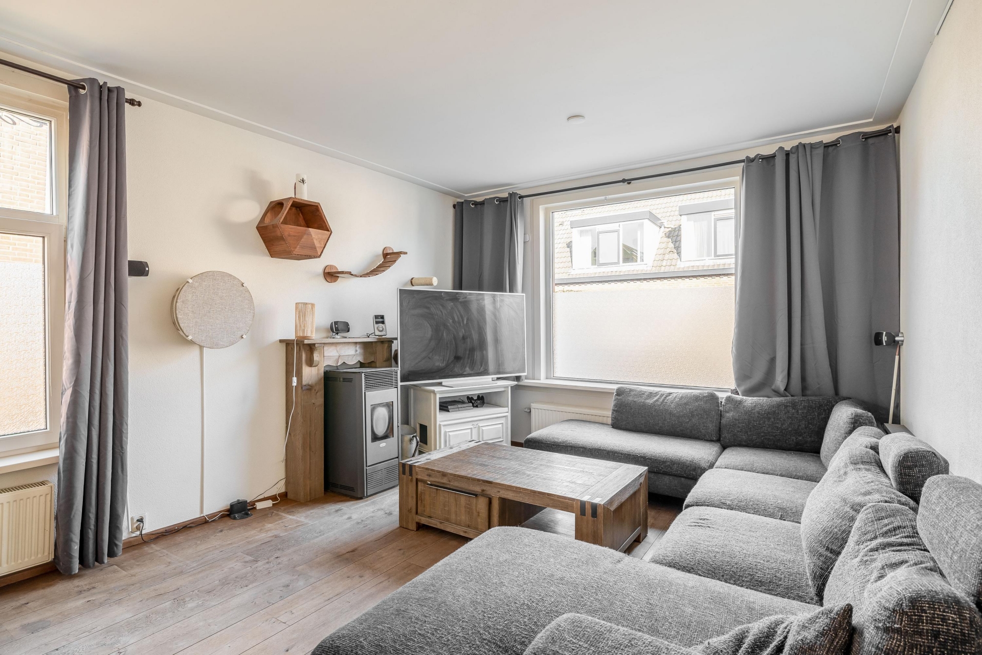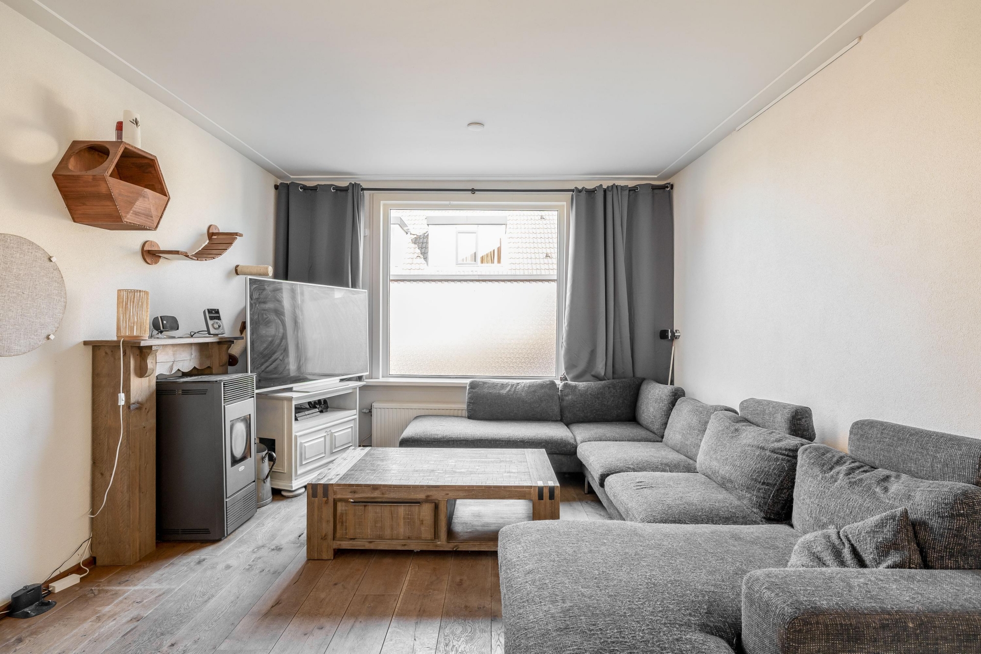 De woonkamer heeft een prettige, open indeling waardoor je verschillende zit- en leefplekken kunt creëren. Aan de voorzijde kun je een comfortabele zithoek maken waar je uitkijkt over de straat, terwijl er richting de keuken voldoende ruimte is voor een grote eettafel. Door de breedte van de kamer voelt de ruimte ruim en overzichtelijk aan.