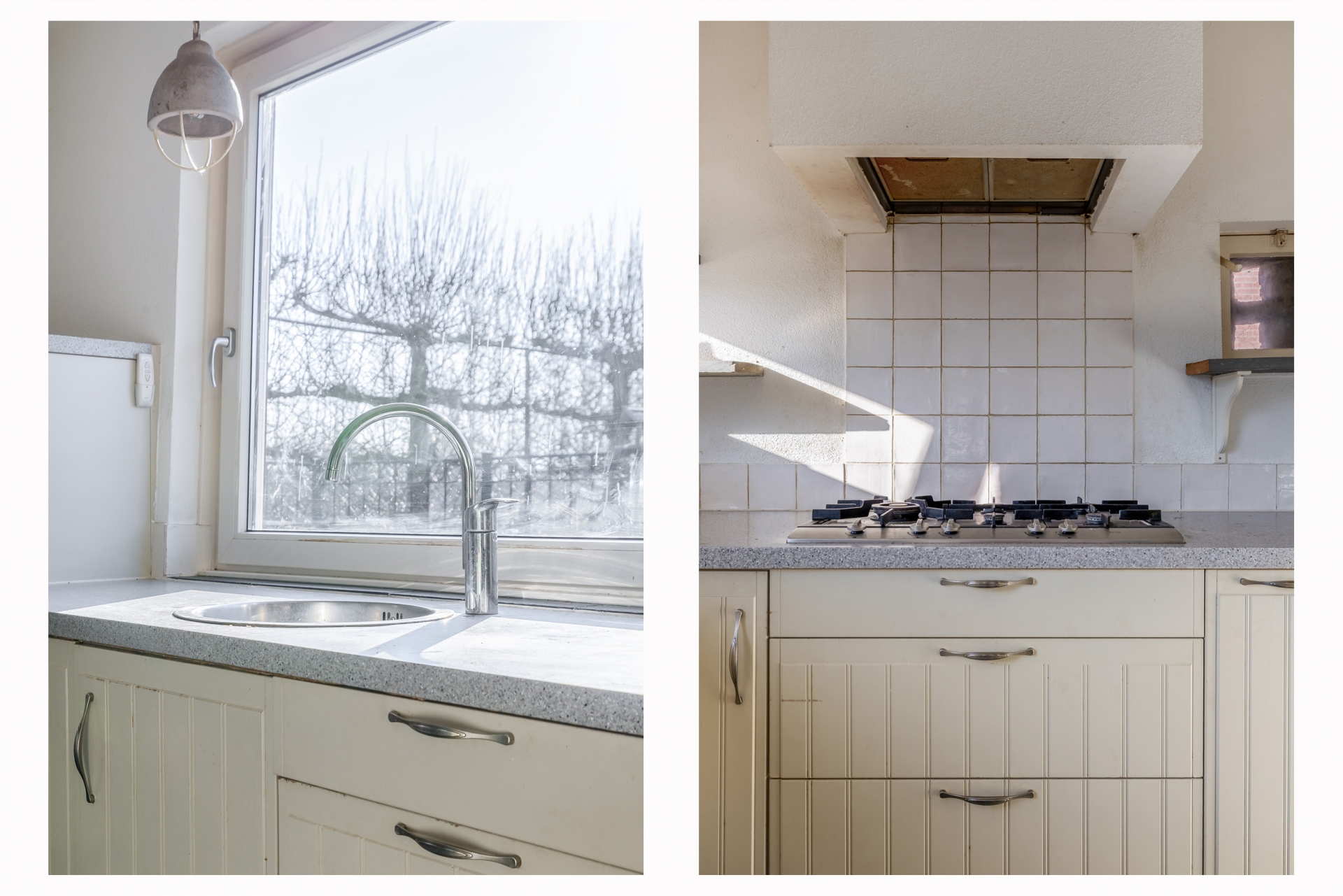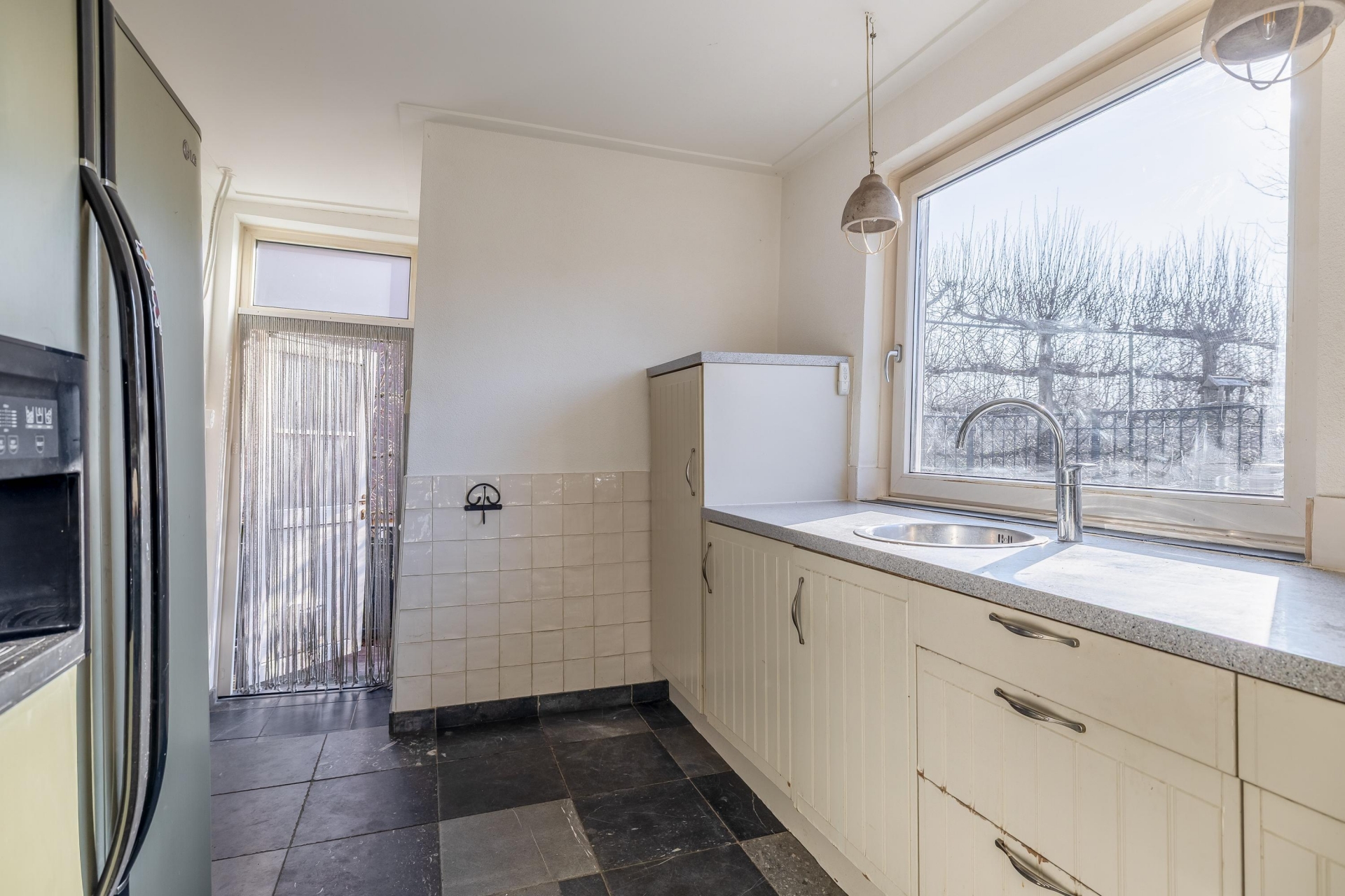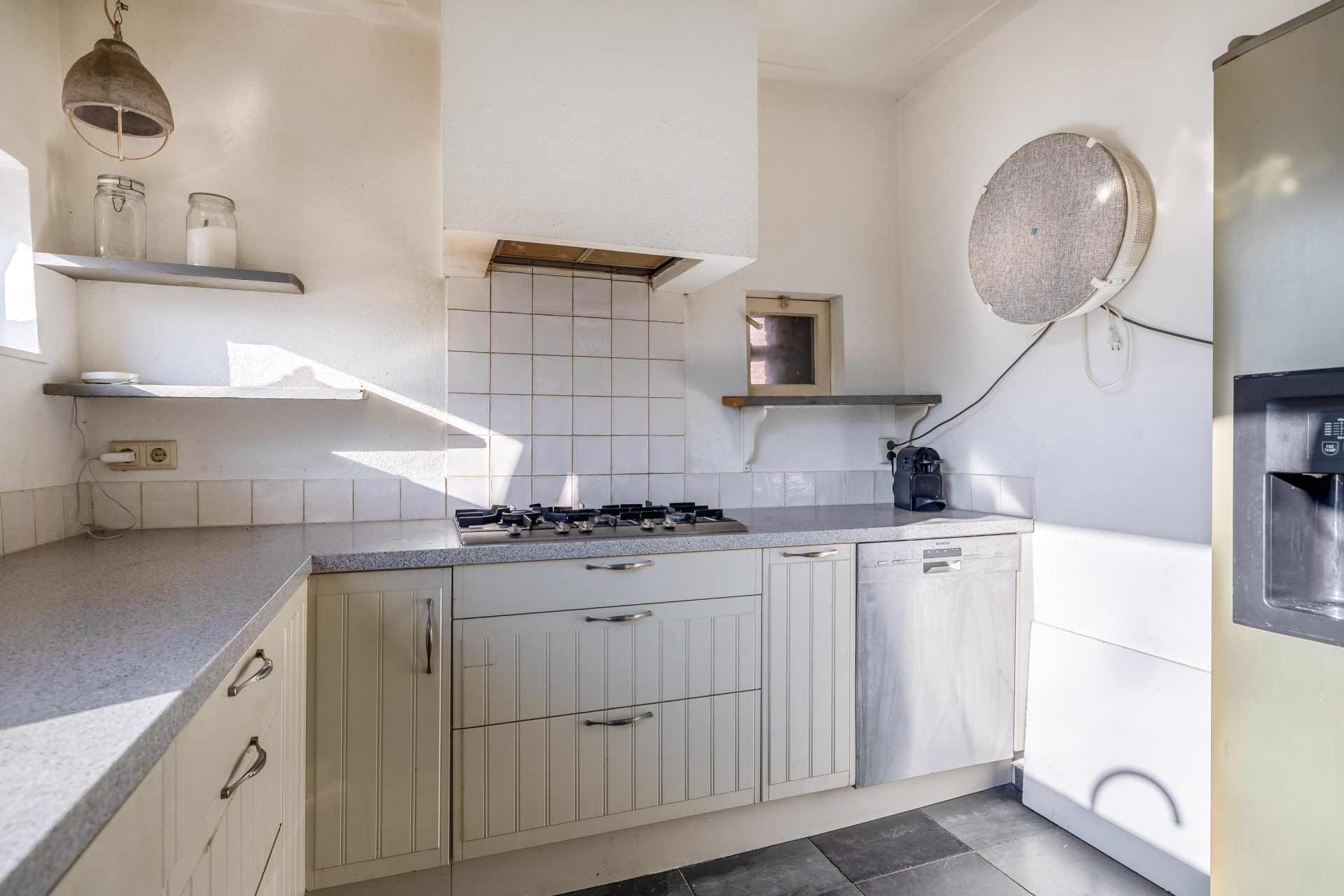 De keuken heeft een praktische opstelling met voldoende werkblad en kastruimte. Het raam boven het aanrecht zorgt voor veel licht en geeft zicht op het terras en de tuin. Hierdoor voelt ook deze ruimte open en prettig aan.