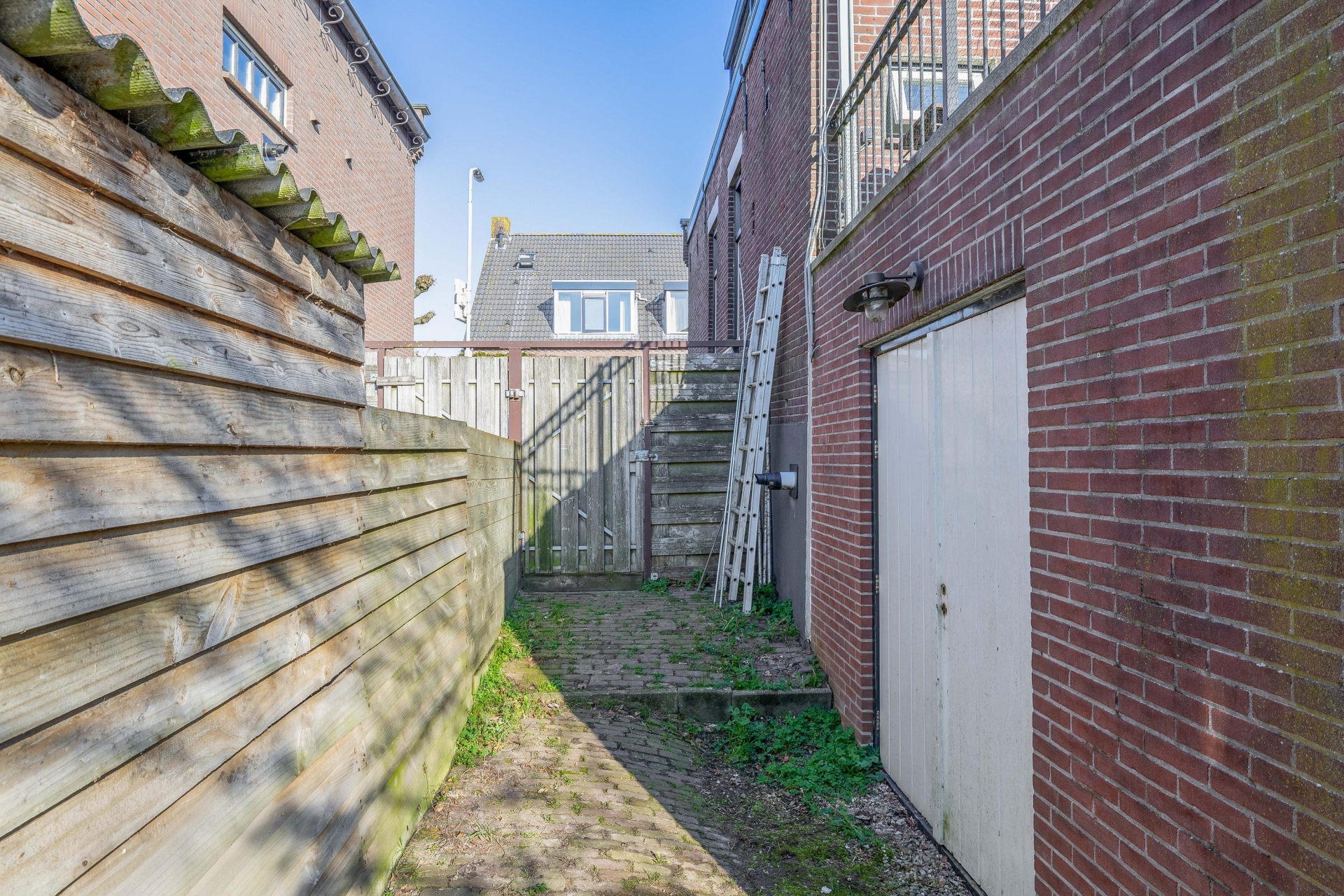 De trap vanuit de tuin naar het dakterras geeft een mooi zicht op de achterzijde van het huis en benadrukt het karakter van het dijkhuis. Het terras zelf is ruim genoeg voor een grote tafel of een loungeset en vormt een heerlijke plek om buiten te leven.