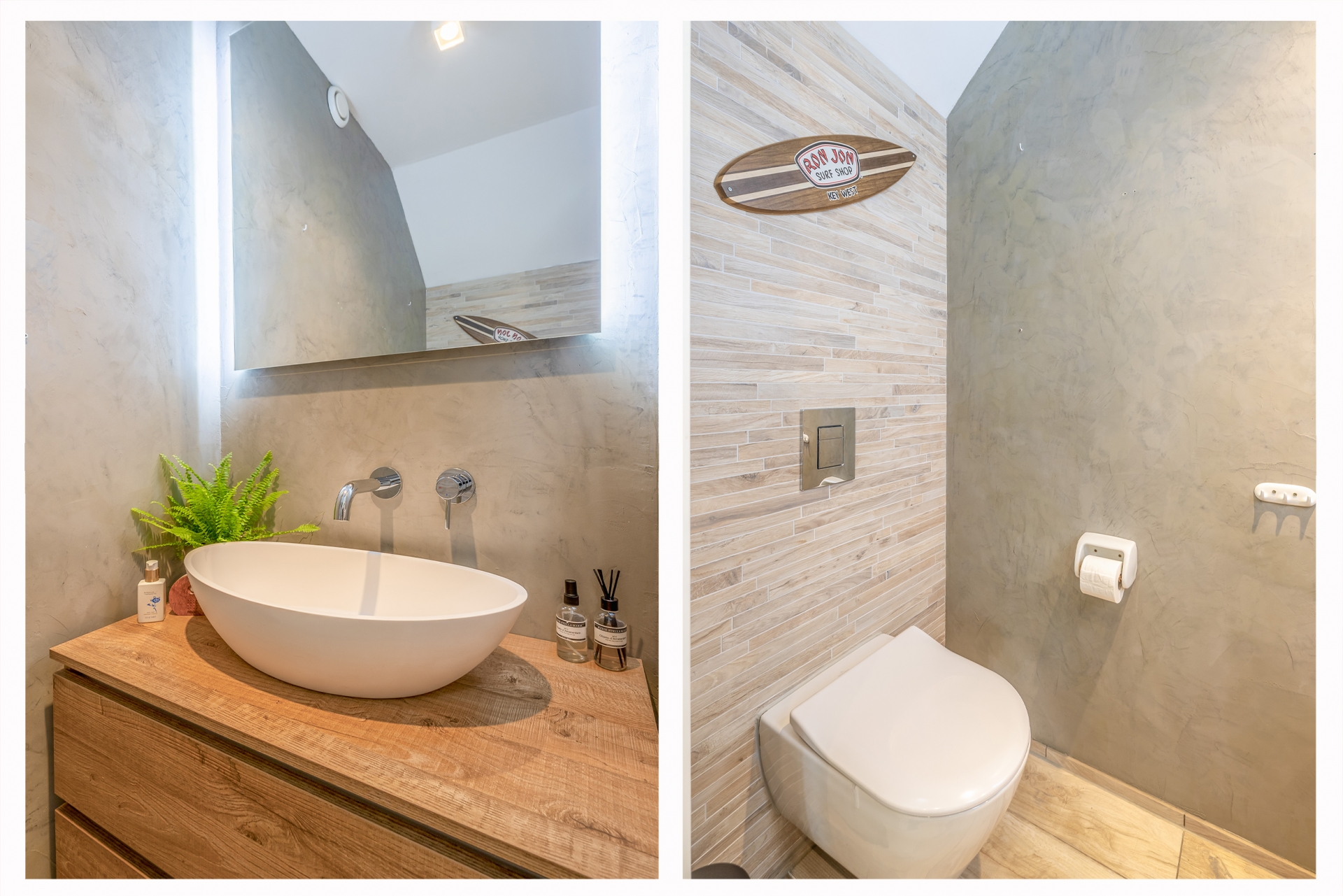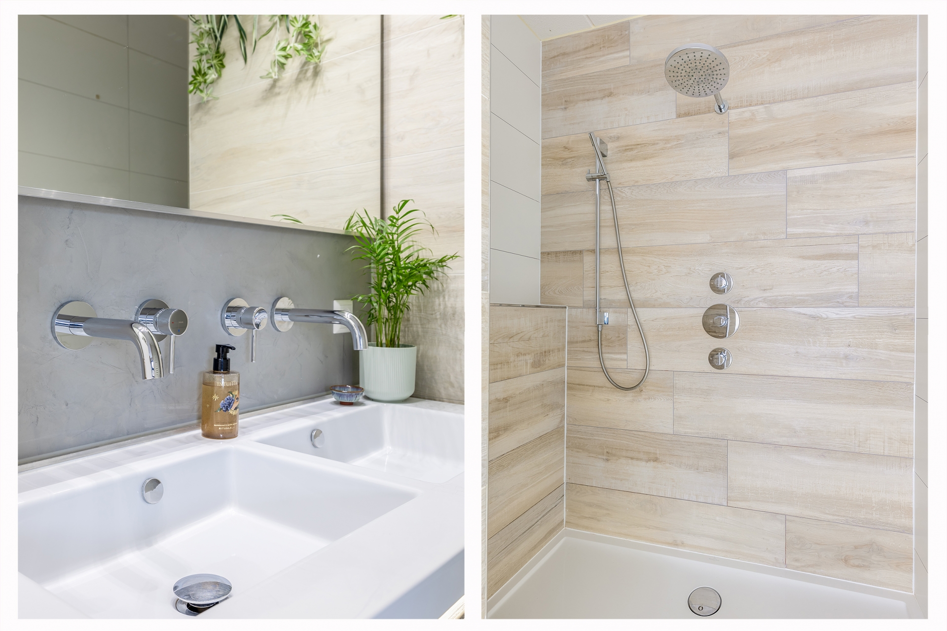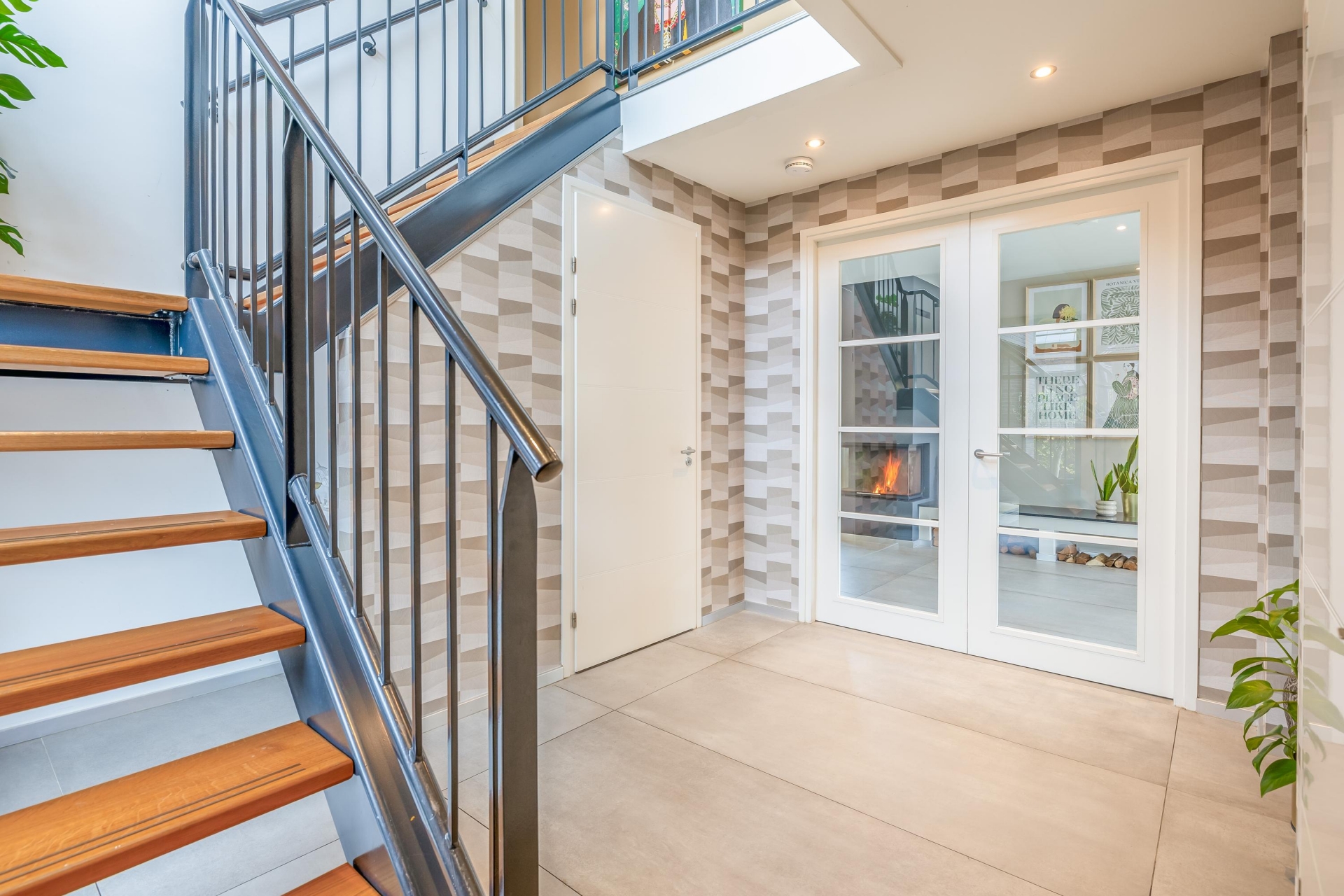 De begane grond biedt een woonbeleving van formaat. De keramische tegelvloer (80x180 cm) met vloerverwarming is strak en stijlvol, terwijl de grote raampartijen voor een zee aan licht zorgen. In de woonkamer staat de driezijdige Spartherm Arte liftdeurhaard centraal – een echte eyecatcher die warmte en sfeer brengt. De afwerking is van hoog niveau: strak gestucte wanden en plafond, sfeervolle verlichting en een harmonieus kleurgebruik.