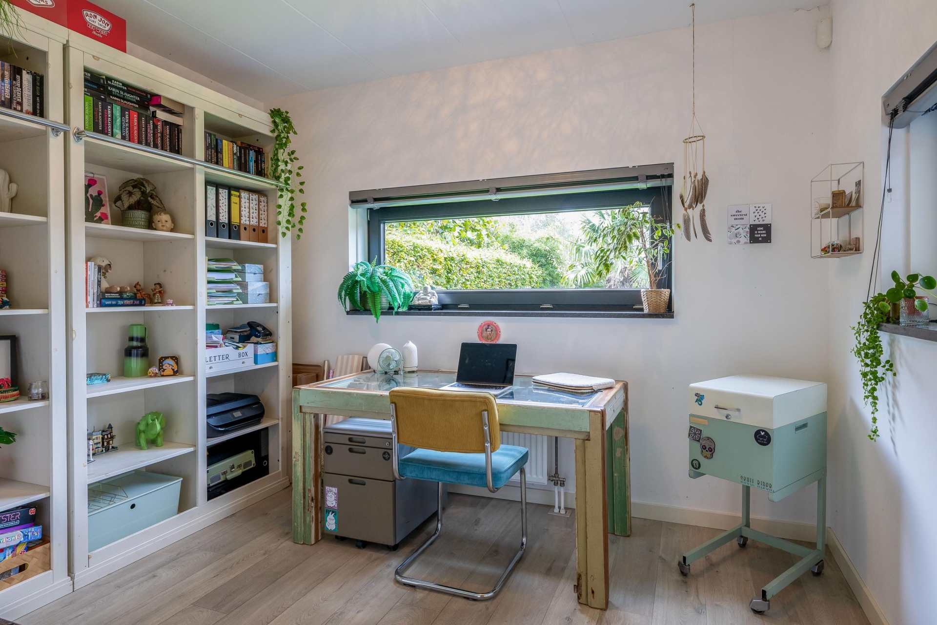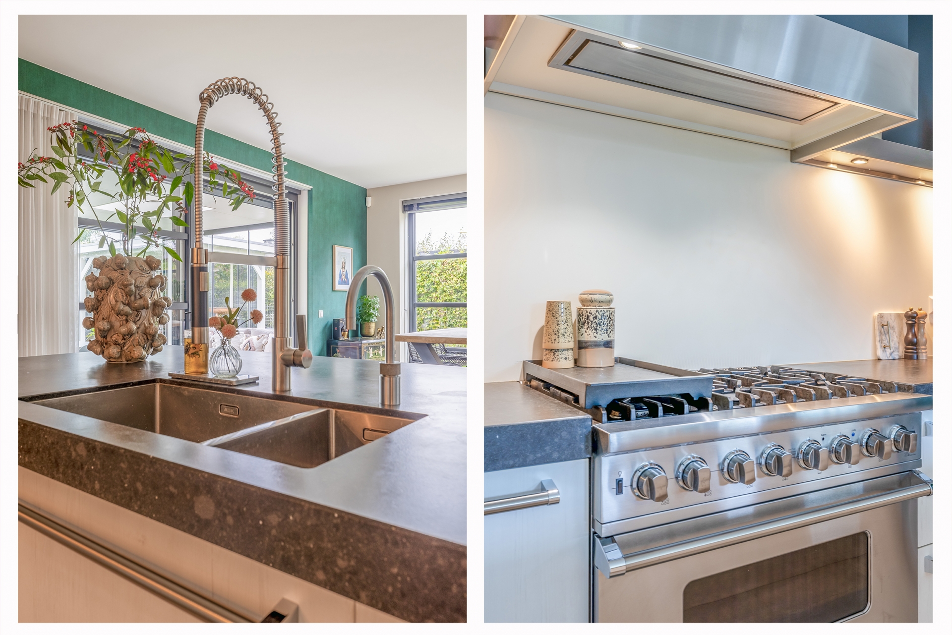 De woonkeuken is een droom voor kookliefhebbers: modern, ruim, voorzien van een royaal eiland en hoogwaardige inbouwapparatuur, zoals het 6 pits Viking fornuis met oven. Aansluitend vind je een praktische bijkeuken, toegang tot de inpandige garage én een extra kantoorruimte – ideaal voor werken aan huis. De serre aan de achterzijde maakt het plaatje compleet. Deze ruimte met glazen schuifwanden en daklichten verbindt binnen moeiteloos met buiten en zorgt voor een plek waar je ieder seizoen kunt genieten.