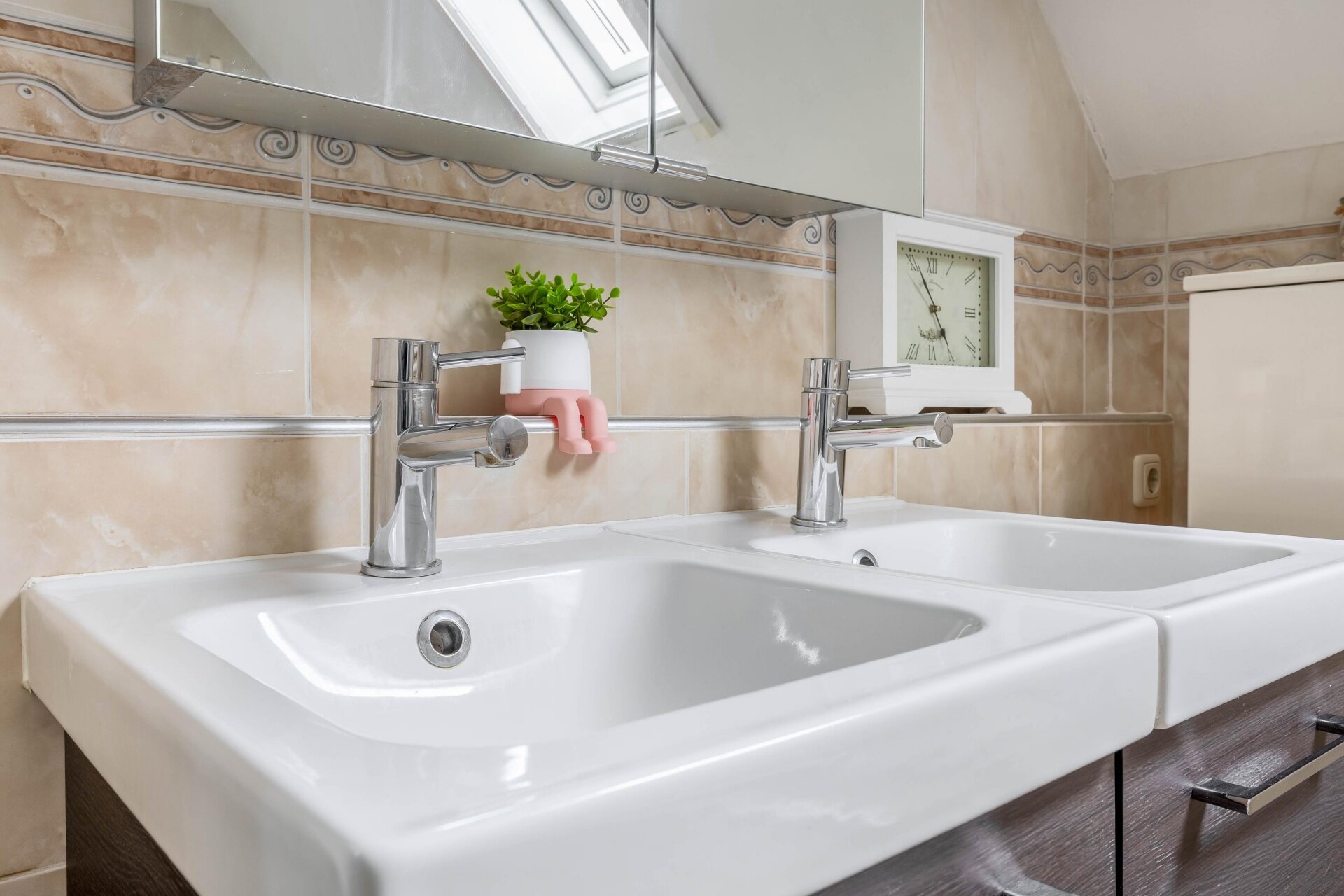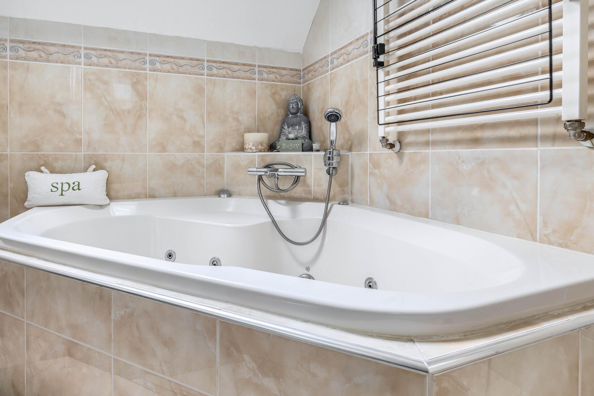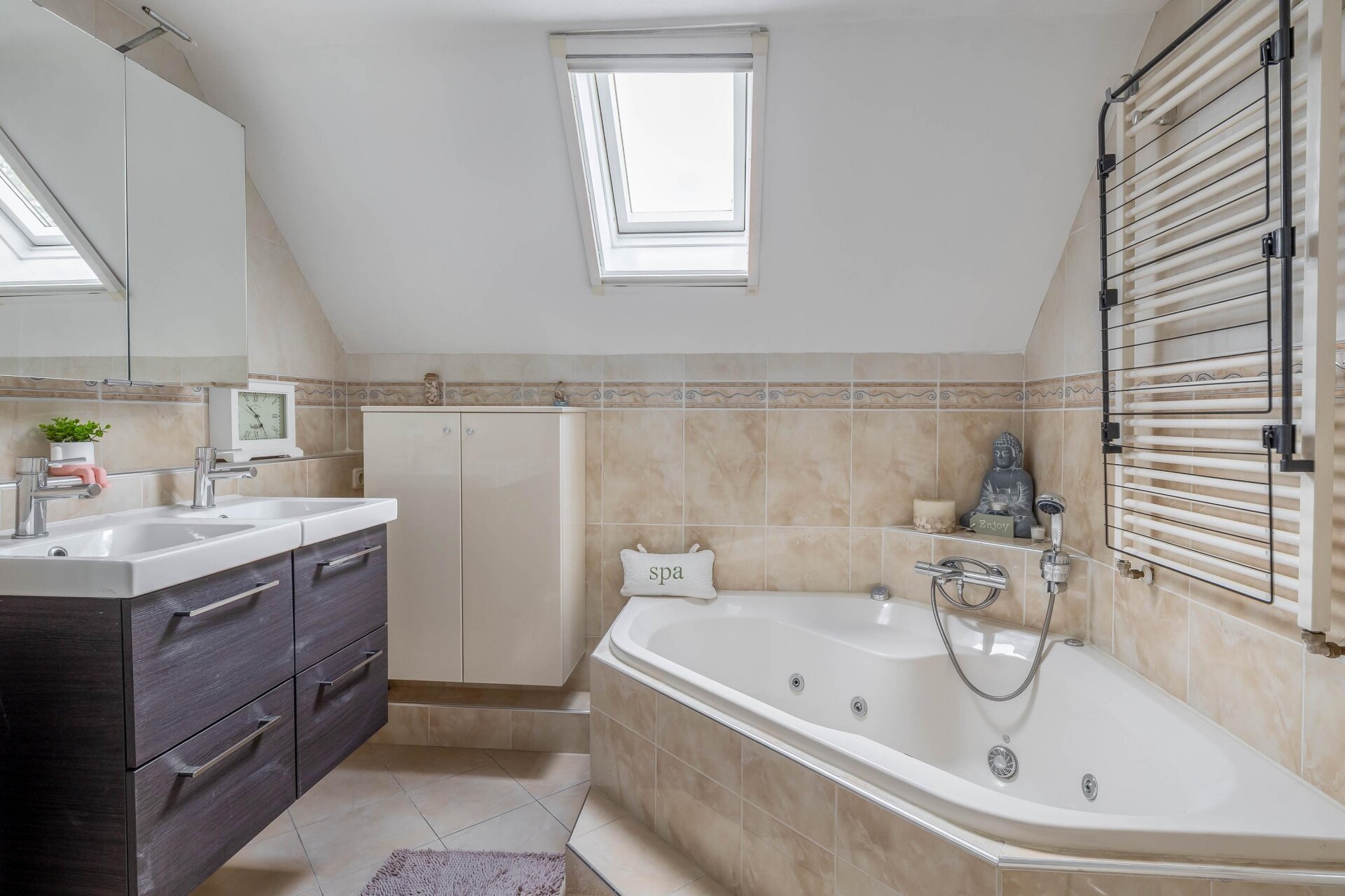 Op de verdieping vind je de fraaie badkamer en twee slaapkamers. De slaapkamers aan de voorzijde zijn voorzien van dakramen voor extra lichtinval. De badkamer beschikt over een Jacuzzi, inloopdouche, toilet en dubbele wastafelmeubel. Naast de badkamer is de tweede slaapkamer die tevens toegang geeft tot het balkon welke gelegen is op het noorden.