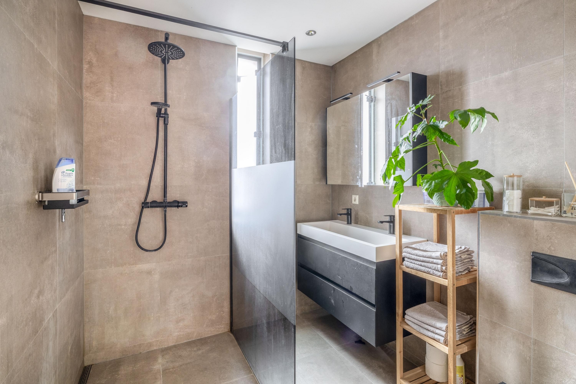 Op de eerste verdieping zijn 2 slaapkamers en de badkamer gelegen. De moderne badkamer is volledig betegeld en voorzien van een ruime inloopdouche, dubbele wastafel met meubel en een toilet. Nog een verdieping hoger is de 3e slaapkamer gelegen over de volledige diepte van de verdieping. Tevens is hier ook een ruime wasruimte met de opstelling voor de wasmachine, droger en mechanische ventilatie-unit.