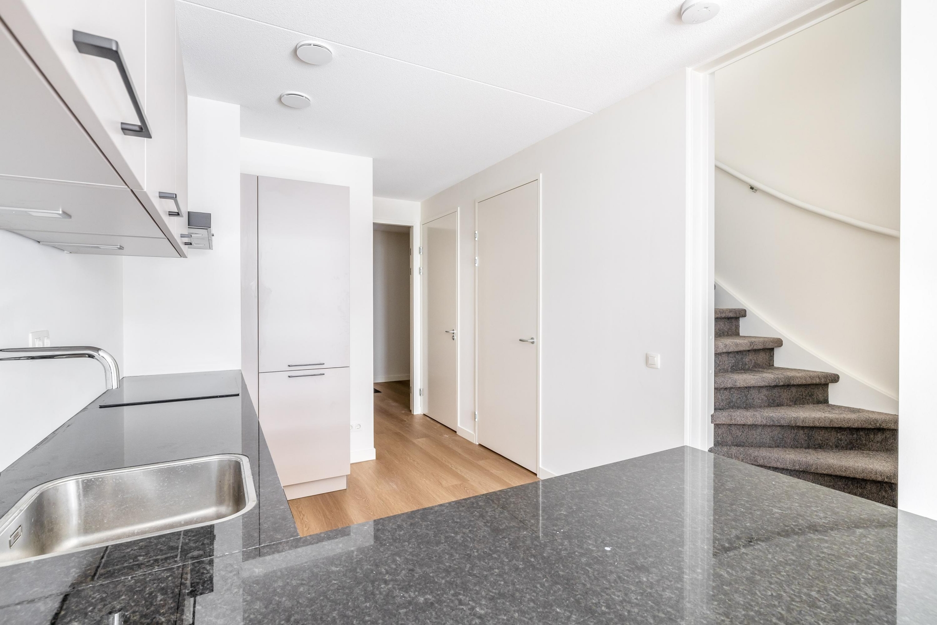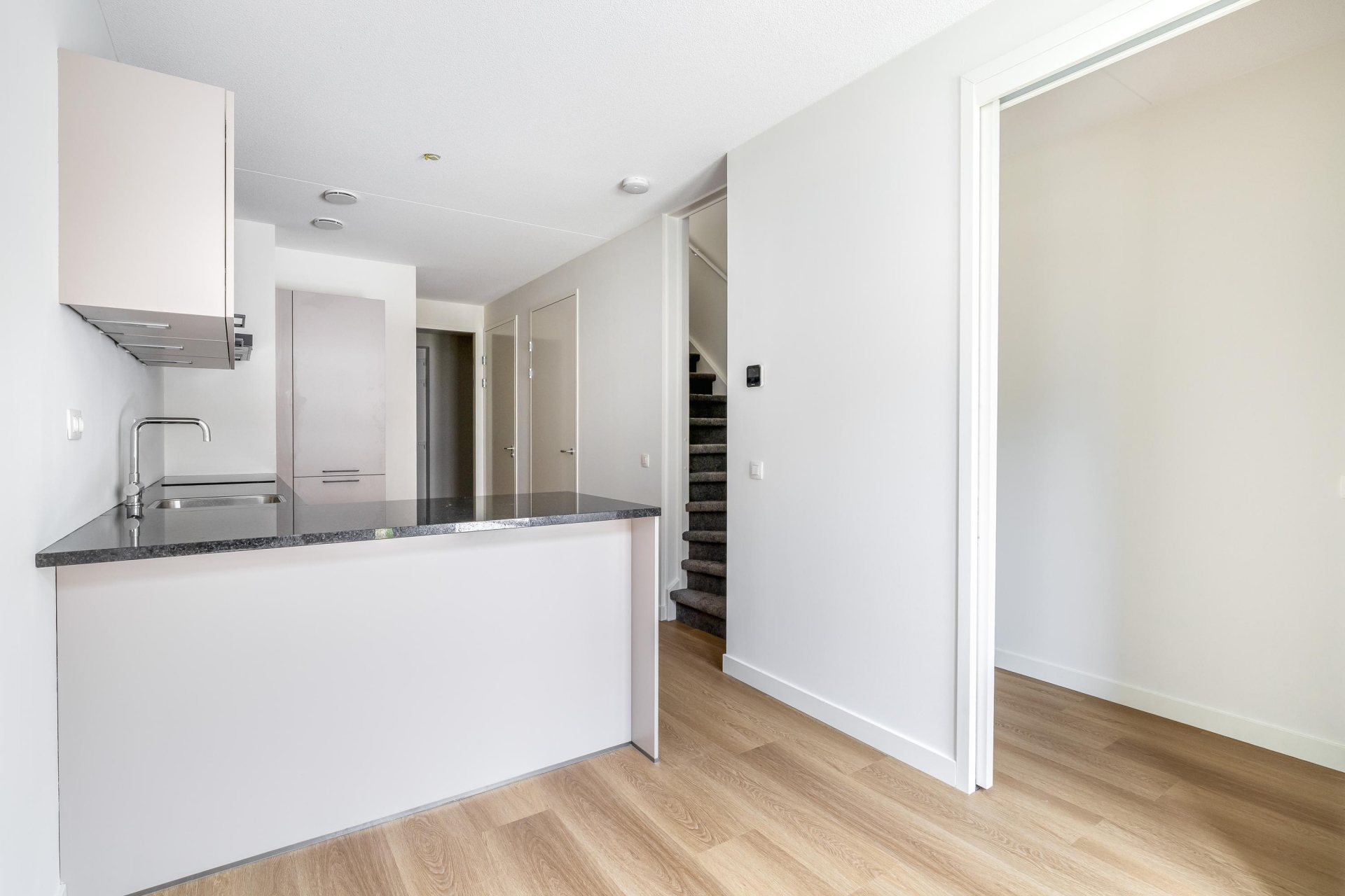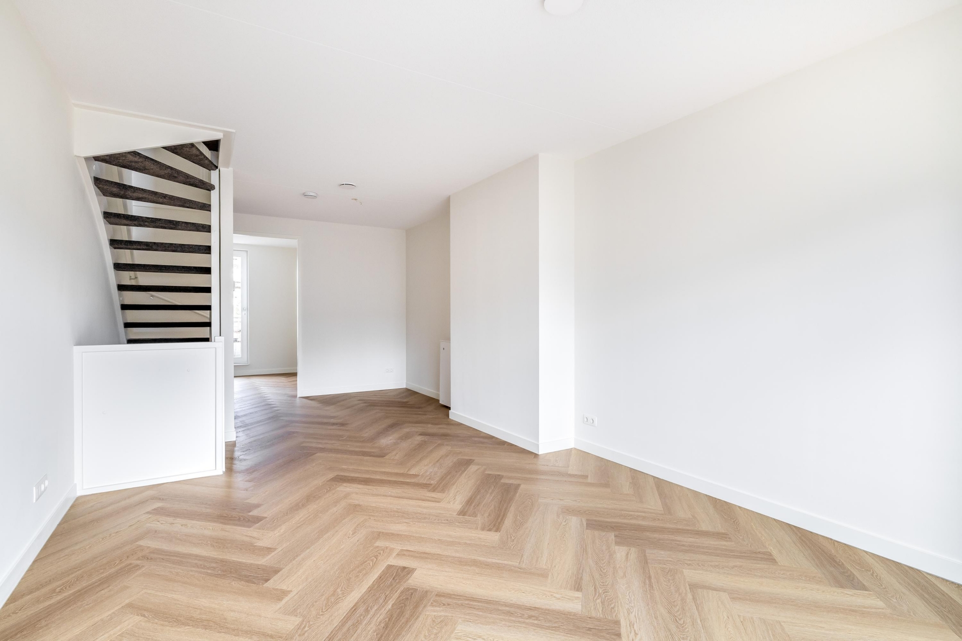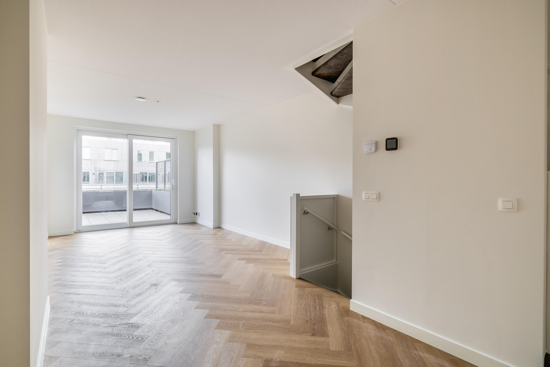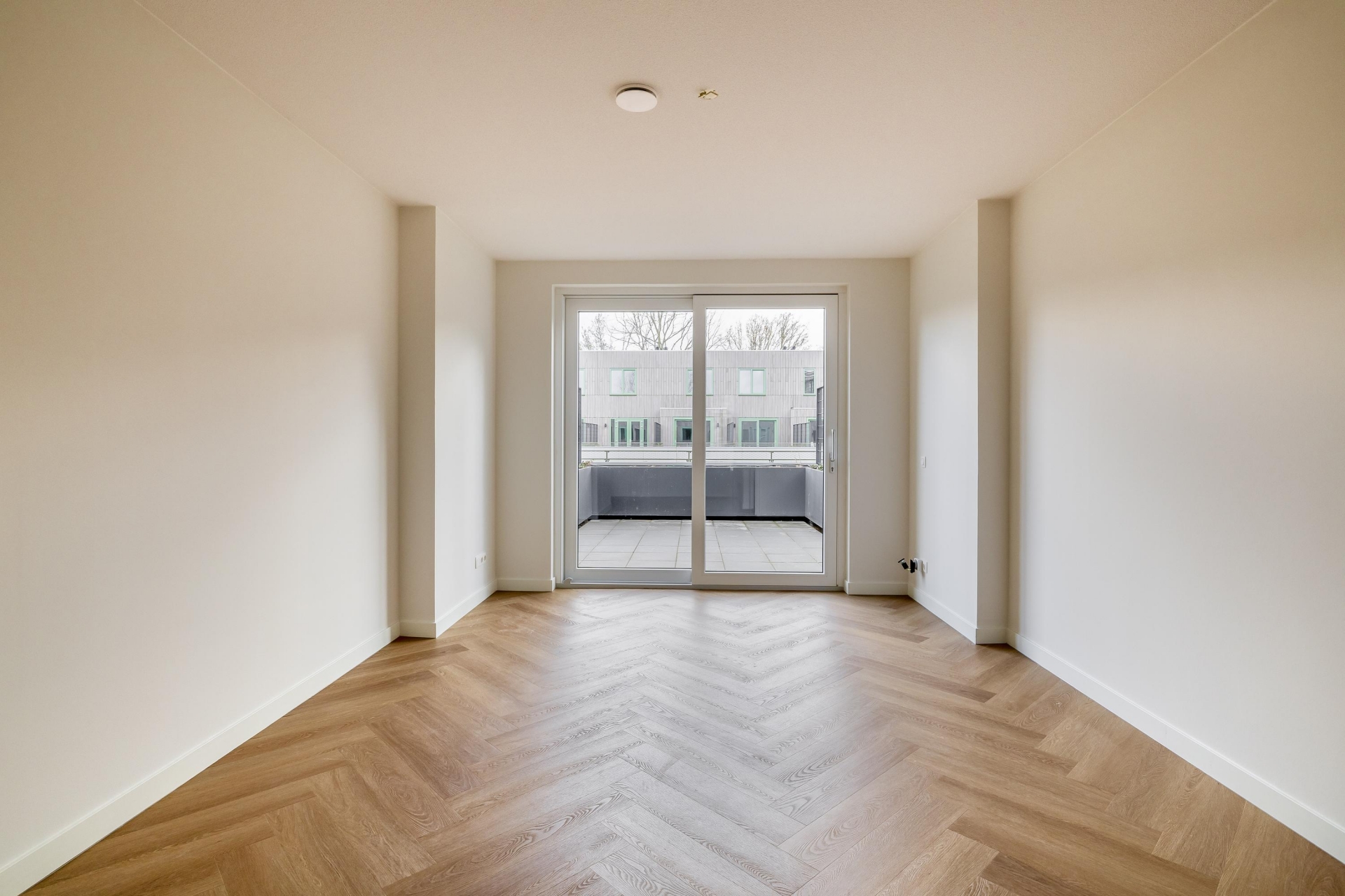 Op de eerste verdieping bevindt zich de woonkamer. Een fijne, lichte ruimte waar je eenvoudig een comfortabele zithoek en eethoek creëert. De visgraat pvc-vloer geeft deze verdieping een warme en luxe uitstraling. Dankzij de grote raampartijen is er veel daglicht en heb je een prettig contact met buiten. Via de woonkamer stap je zo het terras op. Dit terras ligt op het oosten, waardoor je hier in de ochtend en begin van de middag heerlijk van de zon geniet. Een ideale plek om de dag te starten met een kop koffie of rustig buiten te zitten.