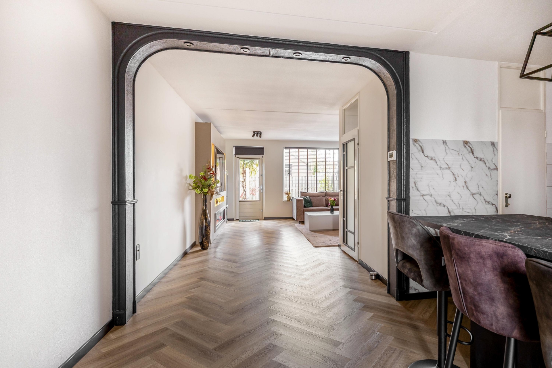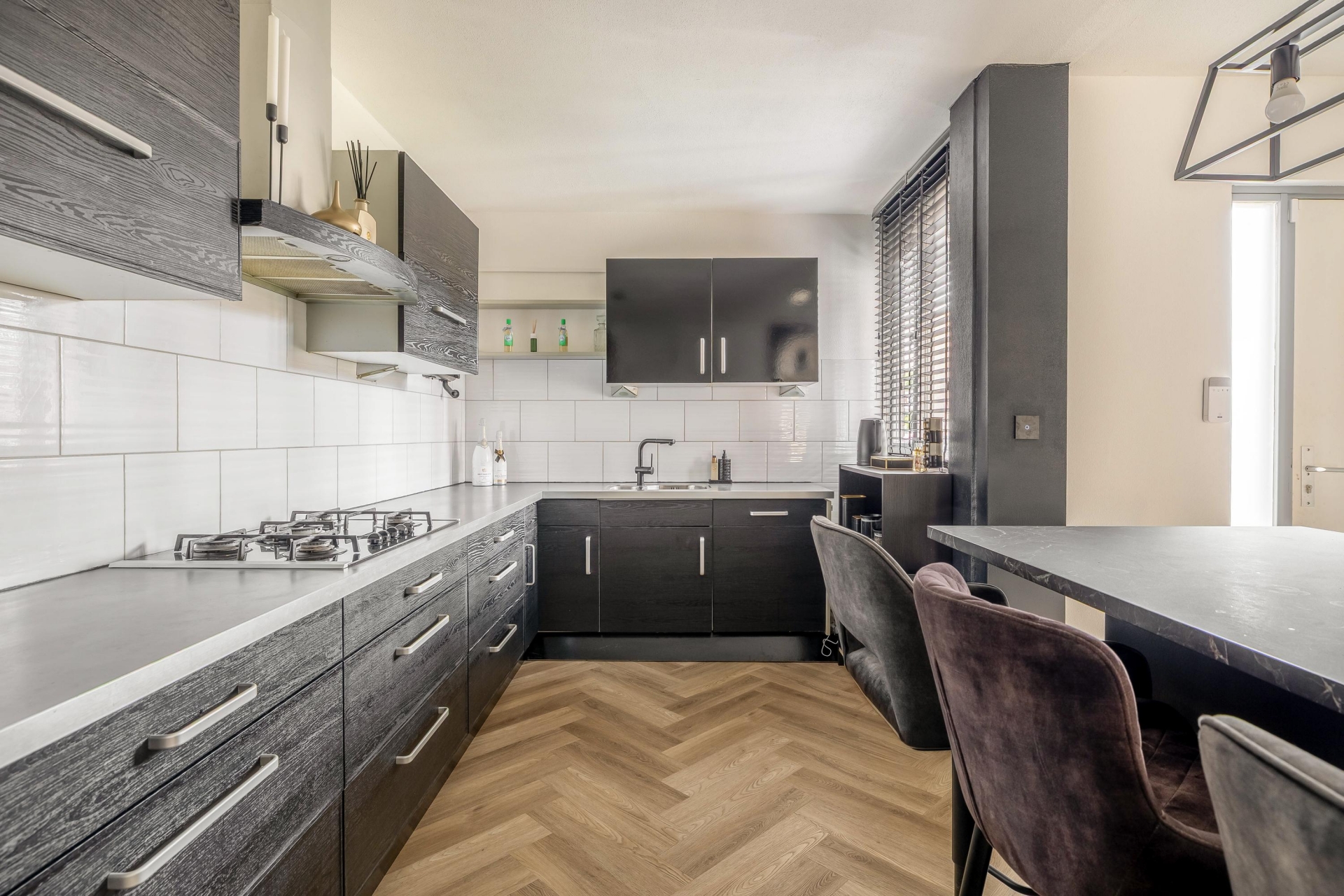 Bij binnenkomst valt het meteen op: dit huis is met zorg en smaak gemoderniseerd. De benedenverdieping is voorzien van een fraaie visgraatvloer met vloerverwarming, wat niet alleen comfortabel is, maar ook stijlvol oogt. De keuken is deels vernieuwd en deels gewrapt in een donkere look en het kookeiland met bar is een echte blikvanger! Een gezellige plek voor ontbijt of borrel. De woonkamer is licht, ruim en via de achterdeur stap je zó de tuin in. Ook het toilet op de begane grond is vernieuwd, net als de strak afgewerkte wanden.