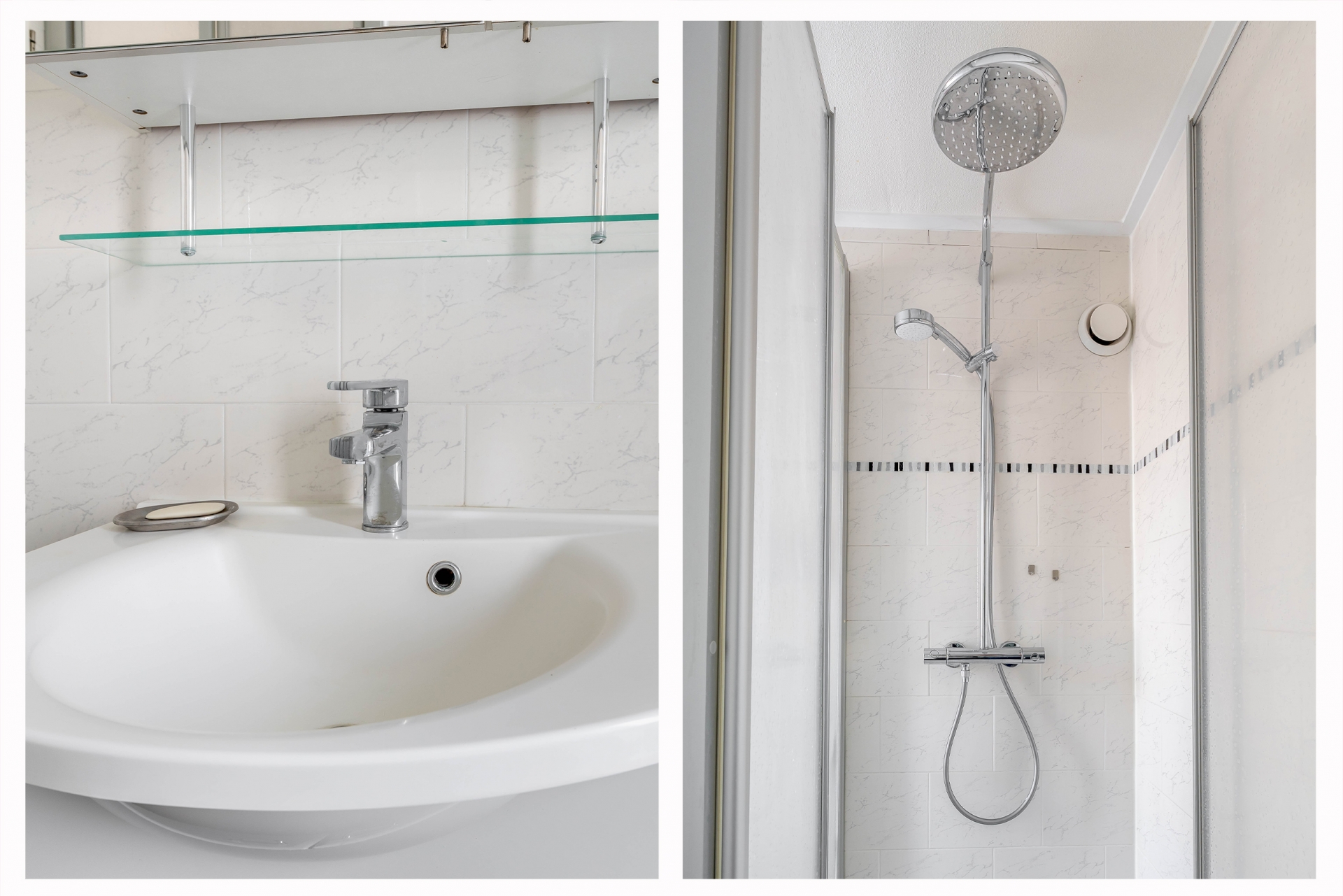 De badkamer is uitgerust met een inloopdouche, toilet, ligbad en wastafelmeubel.