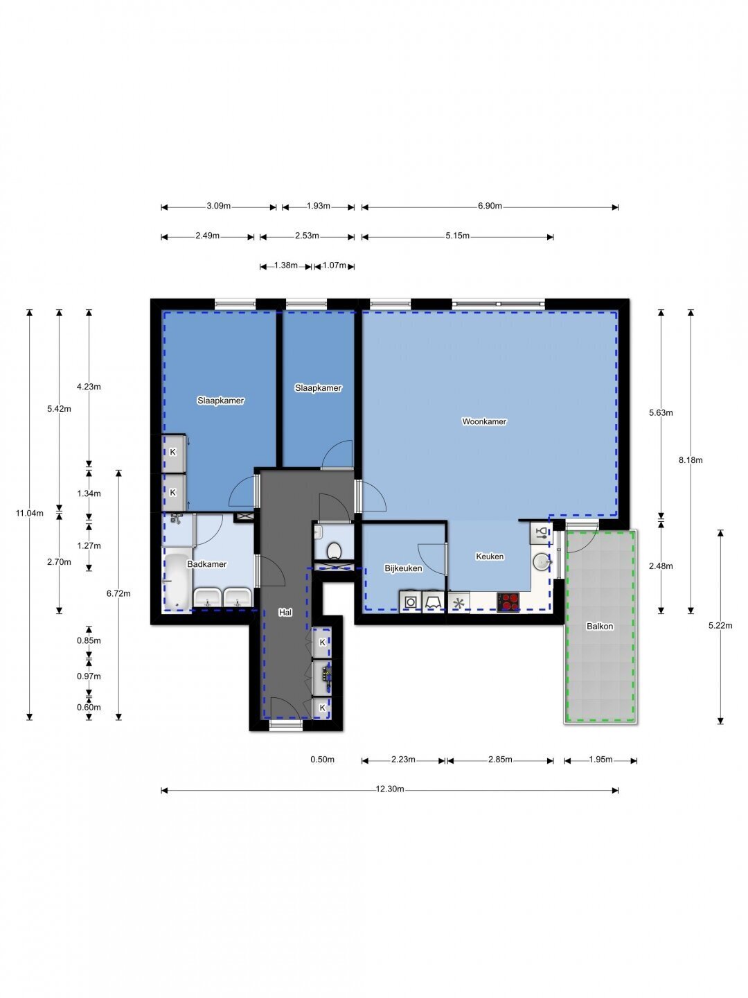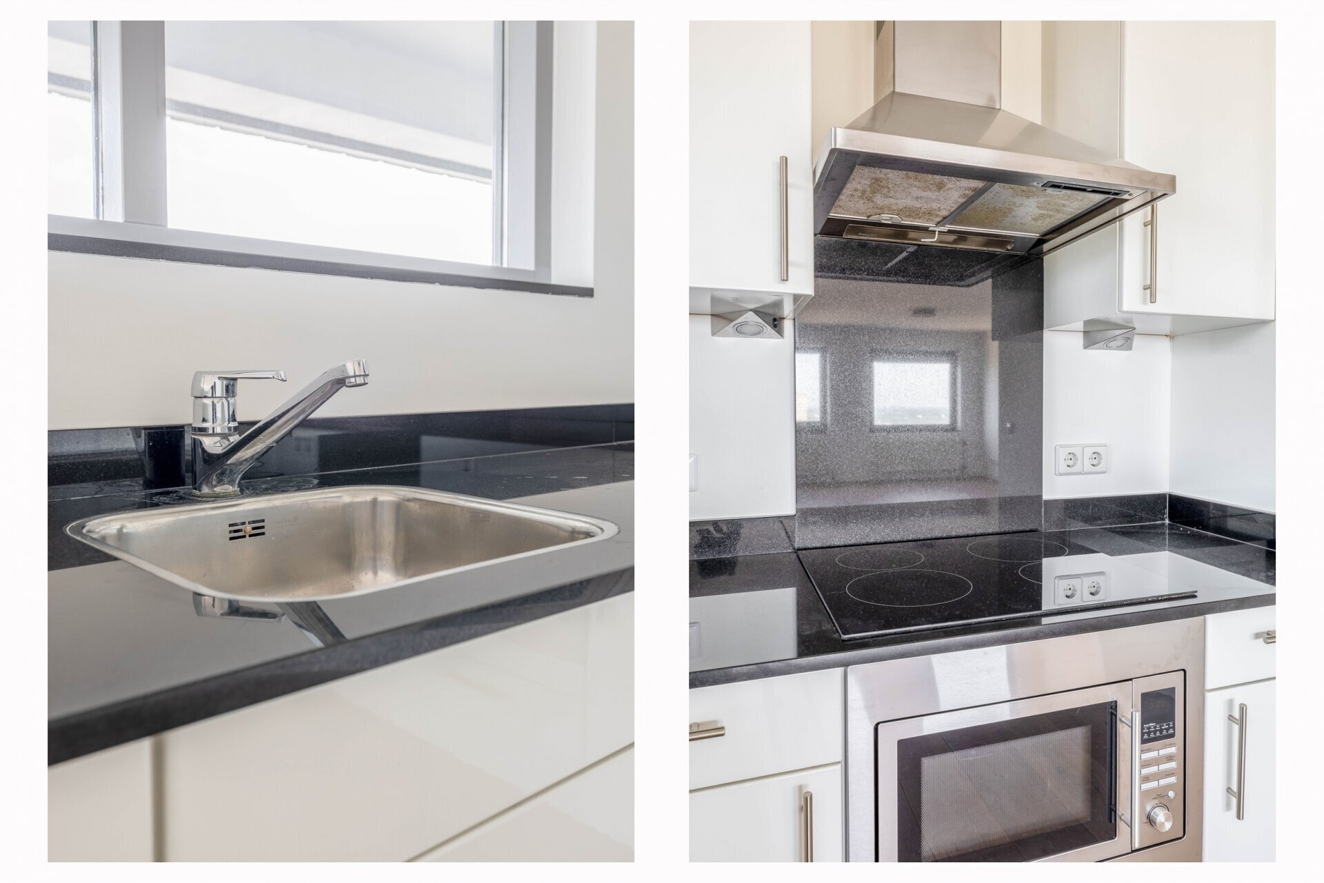 De woning is volledig voorzien van een houten vloer en beschikt over een moderne keuken met inbouwapparatuur. De ruime woonkamer en slaapkamers zijn licht en praktisch ingedeeld, terwijl de badkamer is uitgerust met ligbad, douche en dubbele wastafel. Dit maakt het appartement direct instapklaar en uiterst comfortabel.