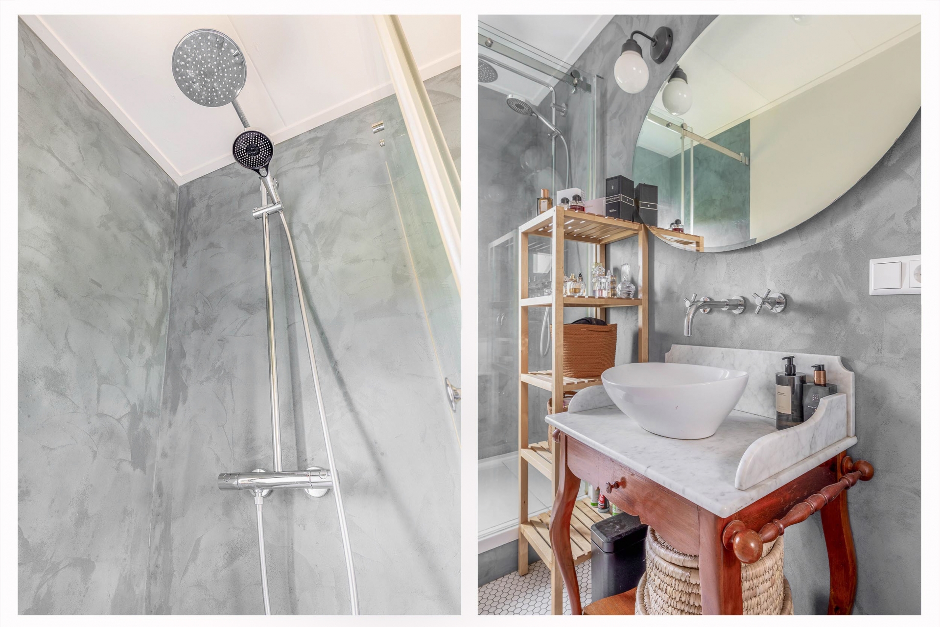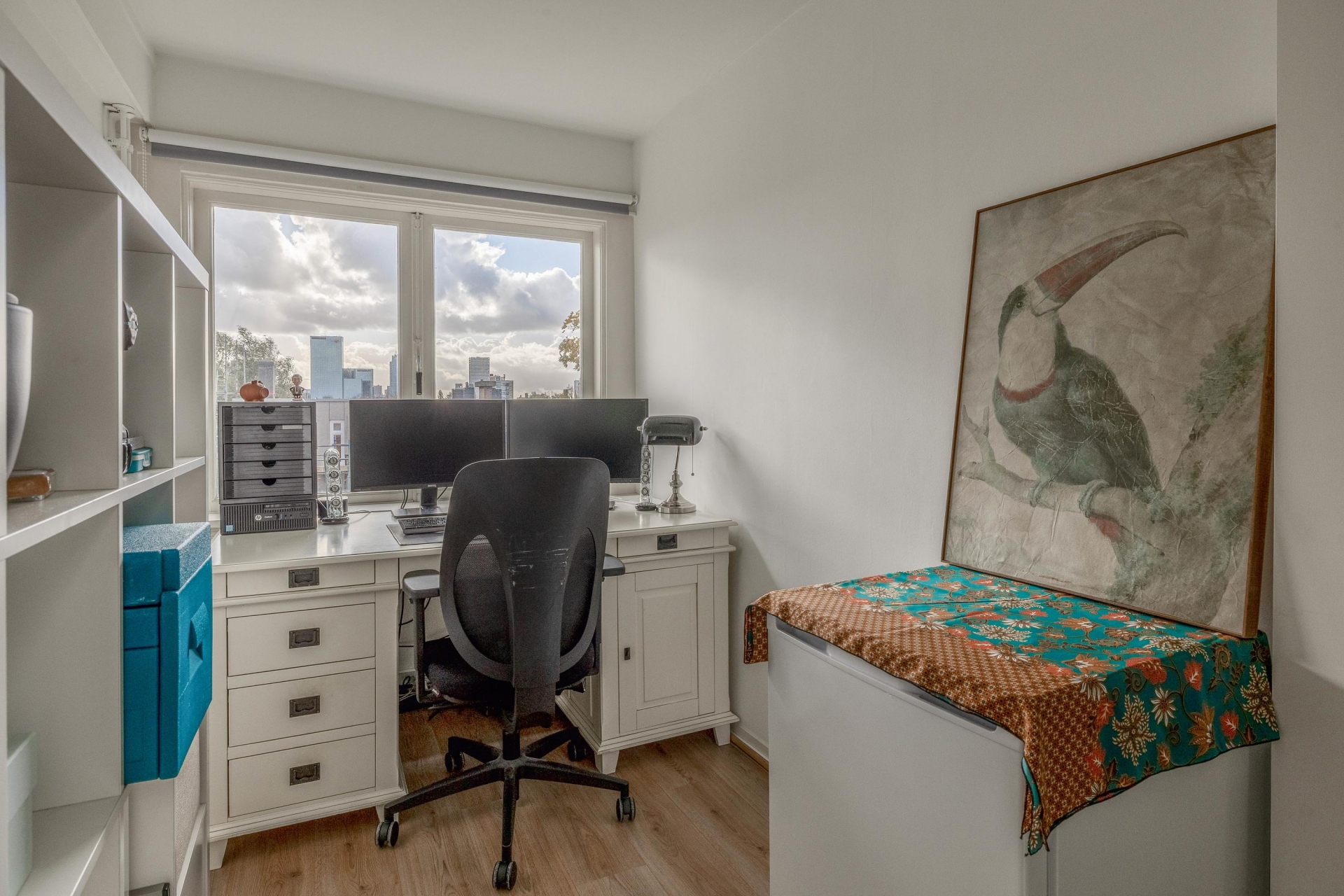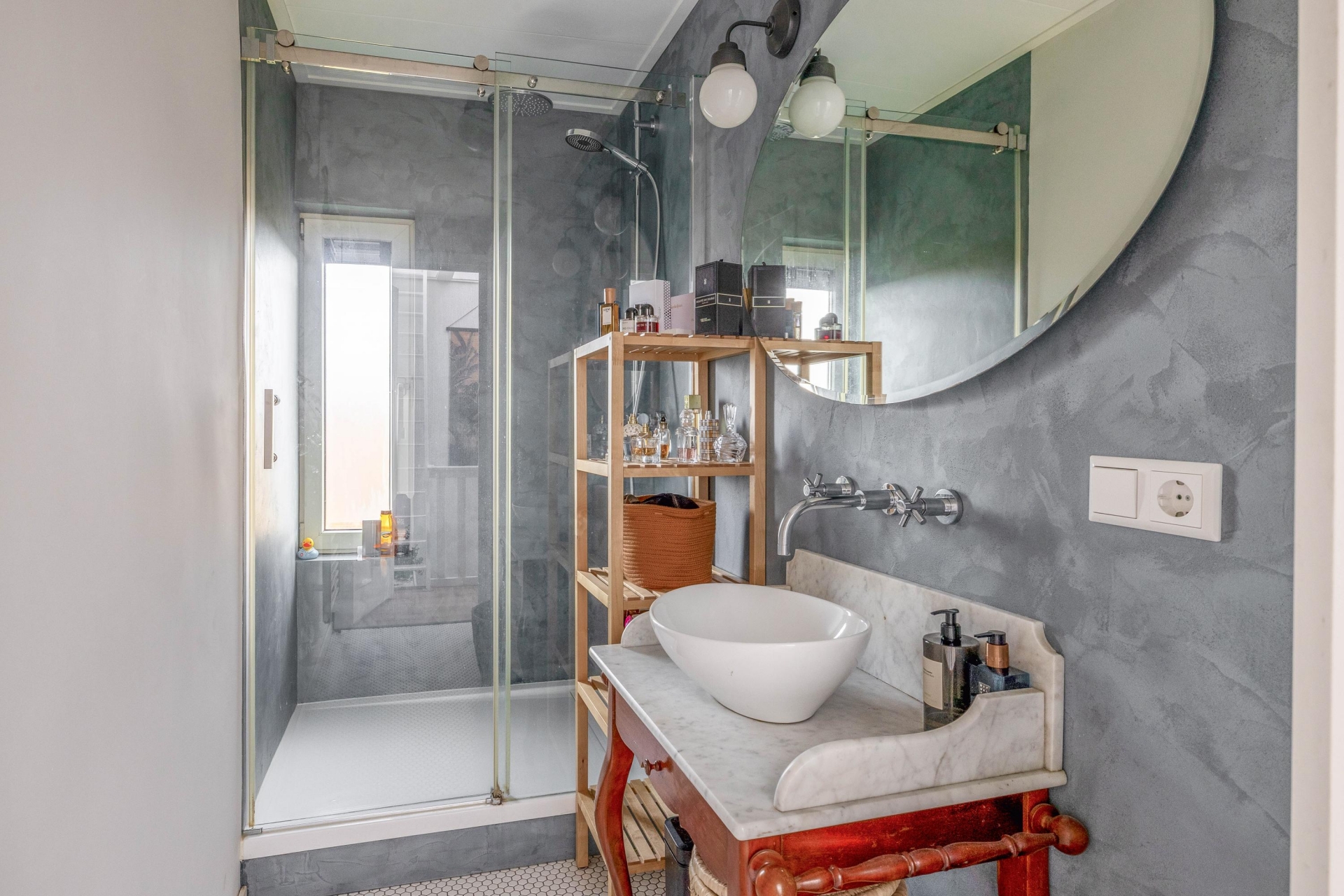 Op de vierde verdieping vind je twee goed bemeten slaapkamers, waaronder een ruime hoofdslaapkamer van ca. 15 m² en een tweede kamer die momenteel als werkkamer wordt gebruikt. De moderne badkamer heeft een ruime inloopdouche, een stijlvol meubel met waskom en ingebouwde kranen.