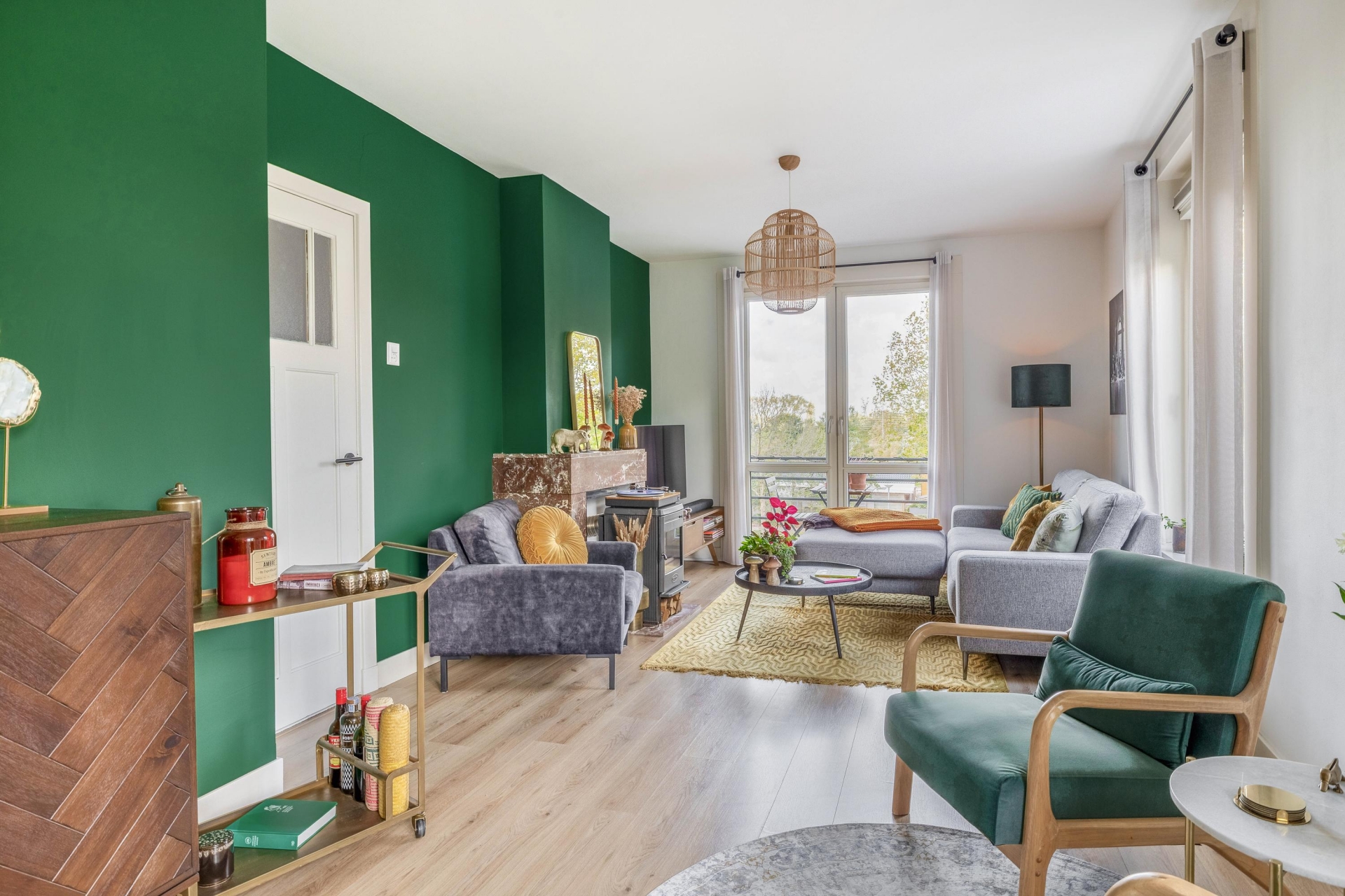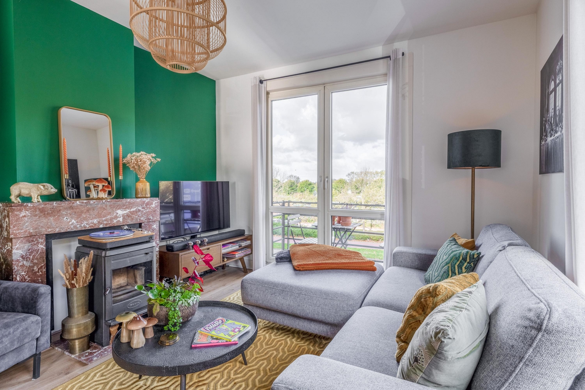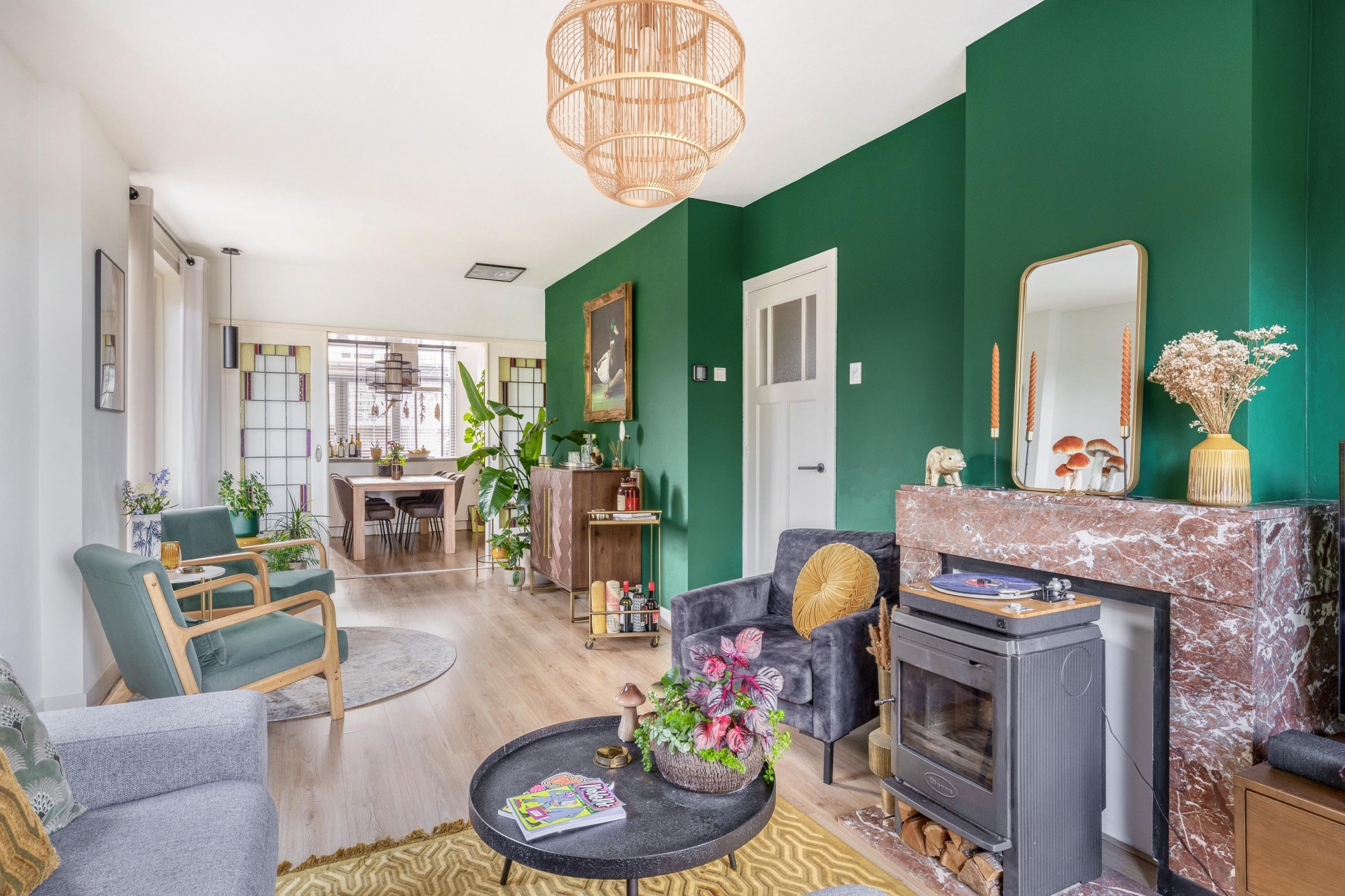 Zodra je de woonkamer binnenstapt, valt het daglicht van alle kanten binnen. De ramen rondom, de openslaande deuren naar twee balkons en de originele en-suite deuren met glas-in-lood geven de ruimte karakter. Voor de fraaie schouw zorgt de houtkachel voor een warme sfeer tijdens koelere dagen, de ideale plek voor gezellige avonden.