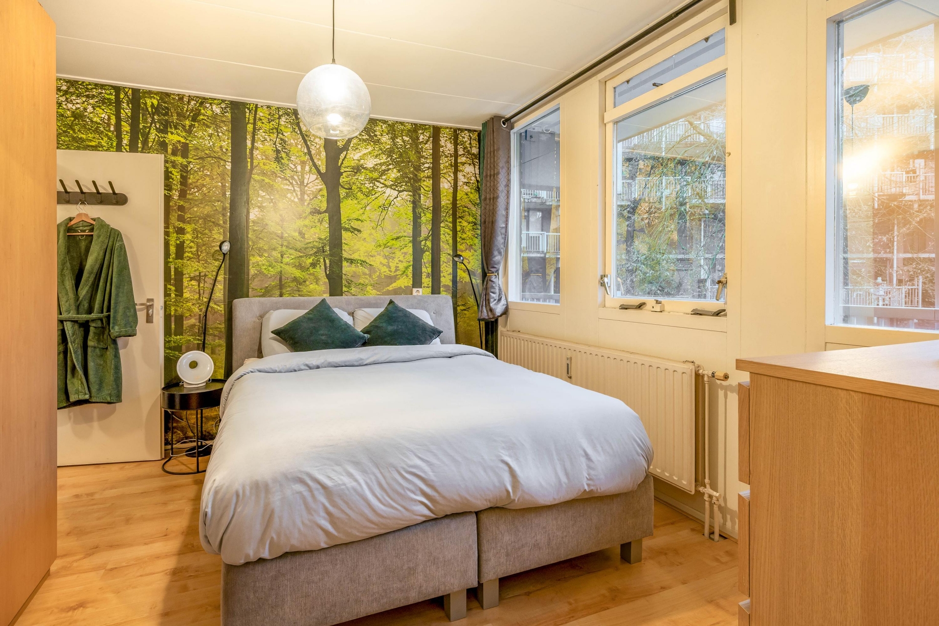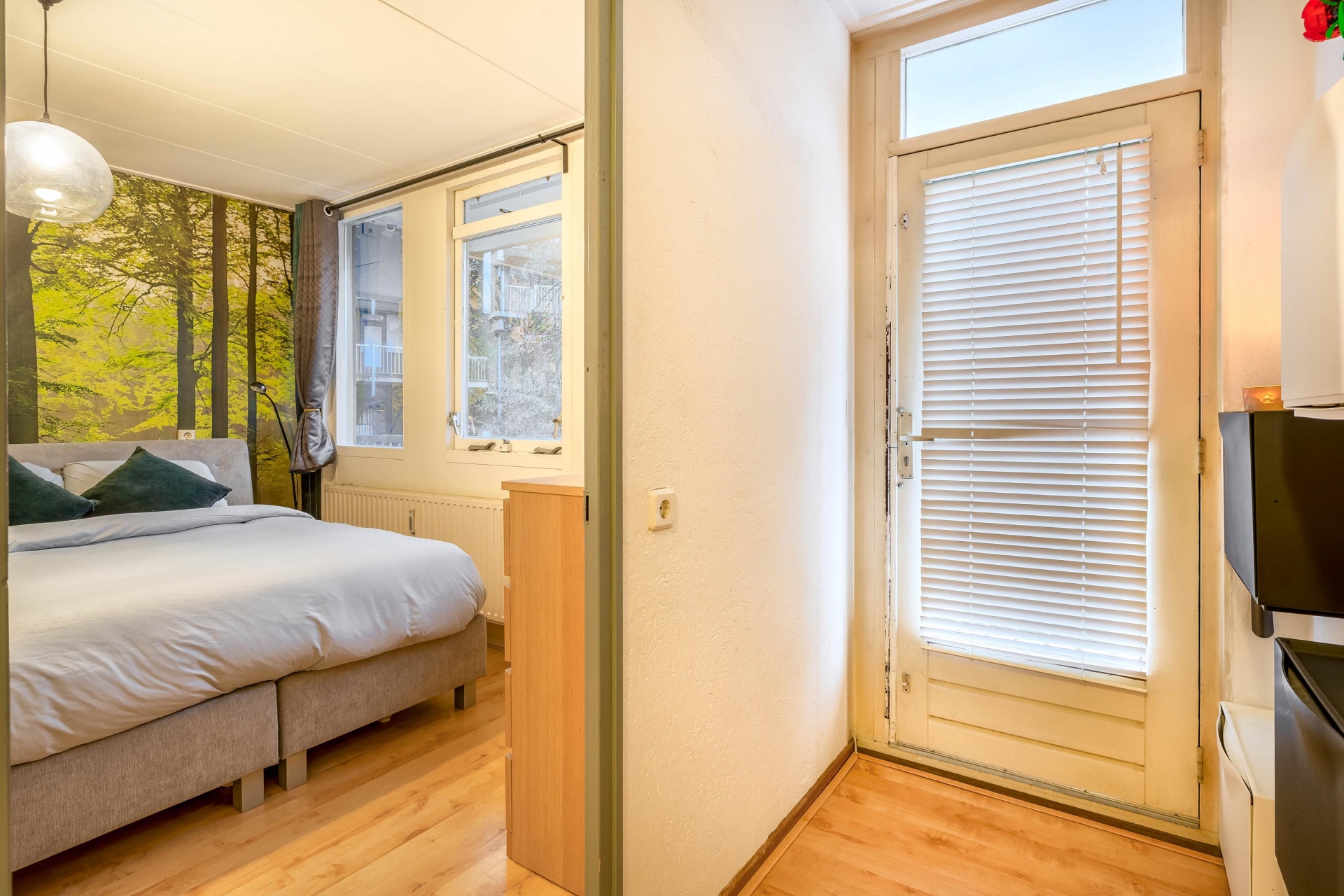 De slaapkamer ligt rustig aan de achterzijde en biedt toegang tot de volledig betegelde badkamer met ligbad/douche, wastafelmeubel, designradiator en wasmachineaansluiting. In de hal bevindt zich een separaat toilet met fonteintje.