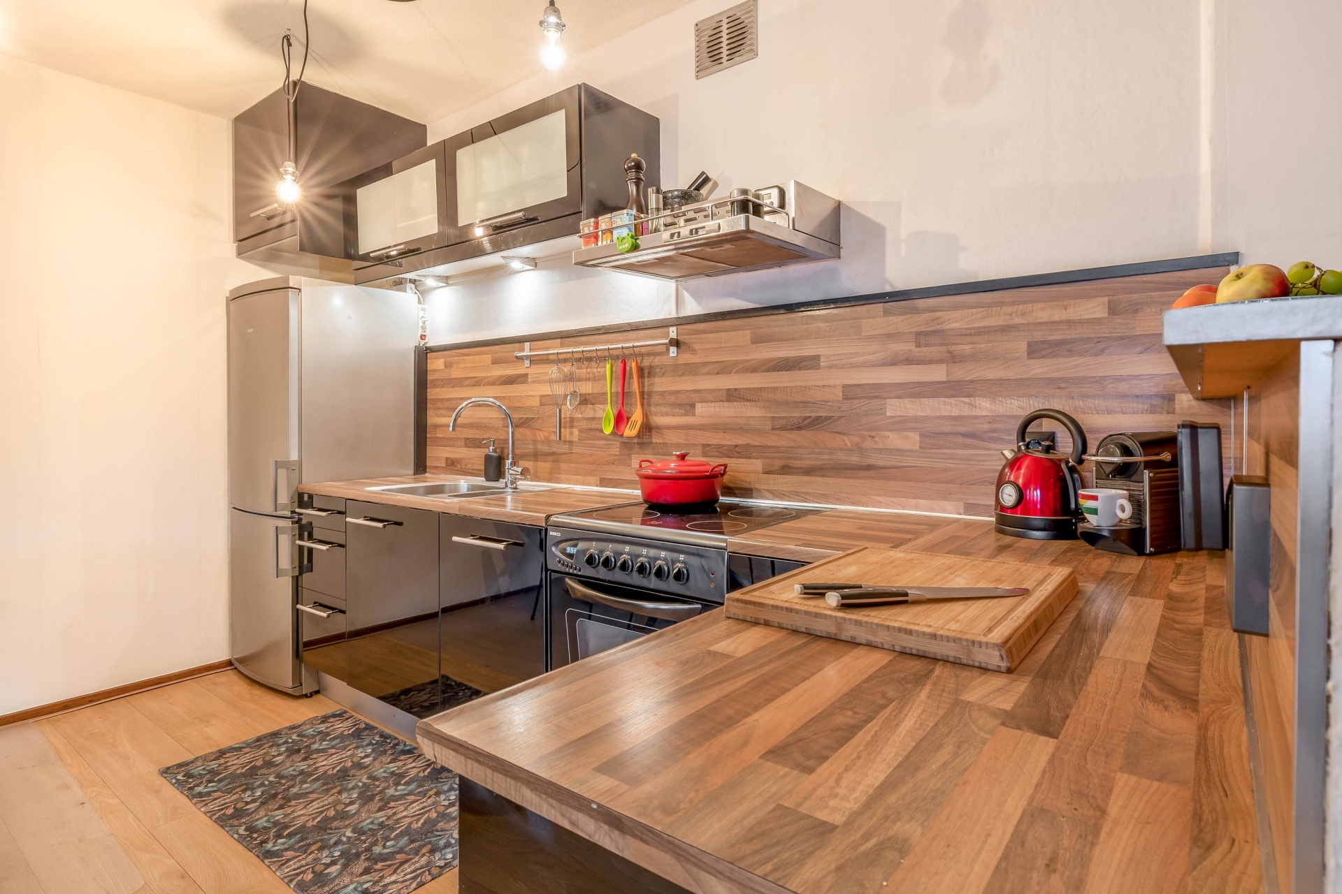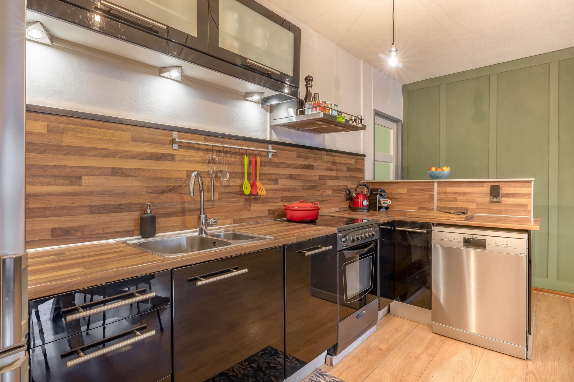 De open keuken is praktisch uitgevoerd in een L-opstelling en voorzien van een elektrische kookplaat, oven, RVS afzuigkap, 1,5 spoelbak en ruimte voor een losse koelkast en vaatwasser.