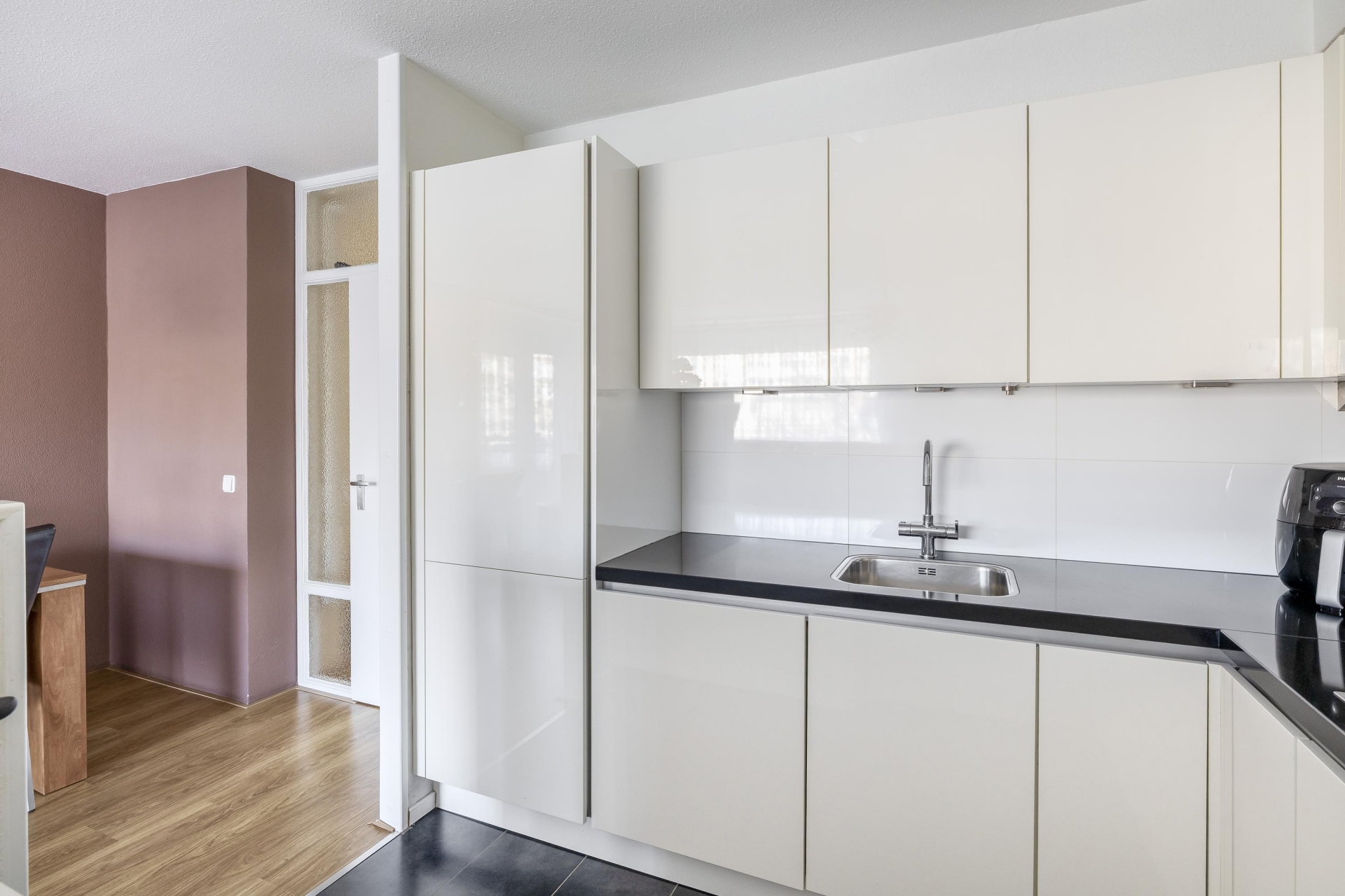 Deze living is opgedeeld in een open keuken en een woonkamer met deur naar het balkon.