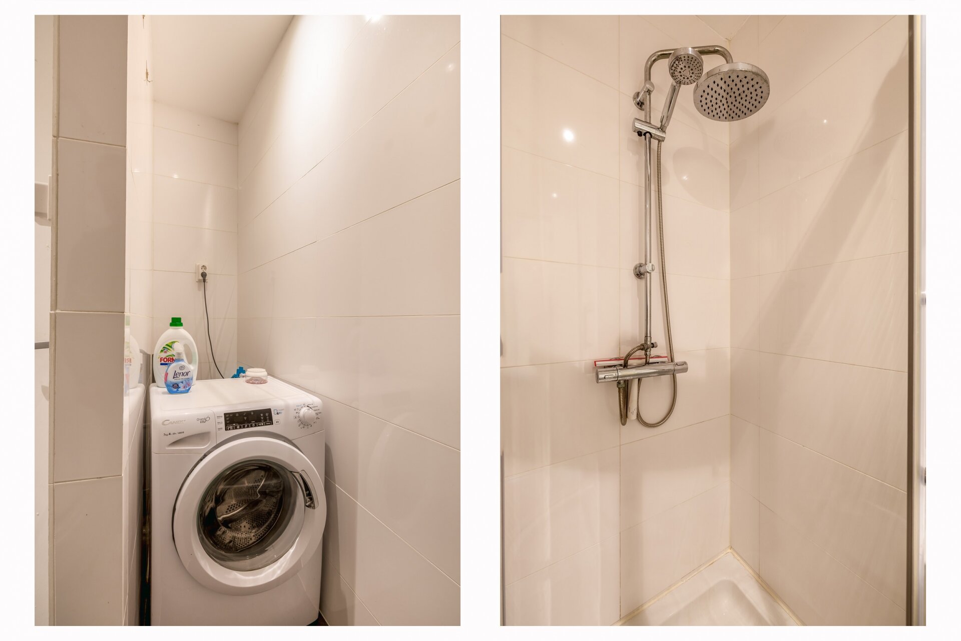 Aan de achterzijde ligt de ruime slaapkamer met plek voor een tweepersoonsbed en kastruimte. De moderne badkamer is betegeld en voorzien van een douche, wastafelmeubel en aansluiting voor de wasmachine. Vanuit de slaapkamer en keuken heb je toegang tot het balkon met uitzicht over de binnentuinen - een rustige plek om even buiten te zitten.
