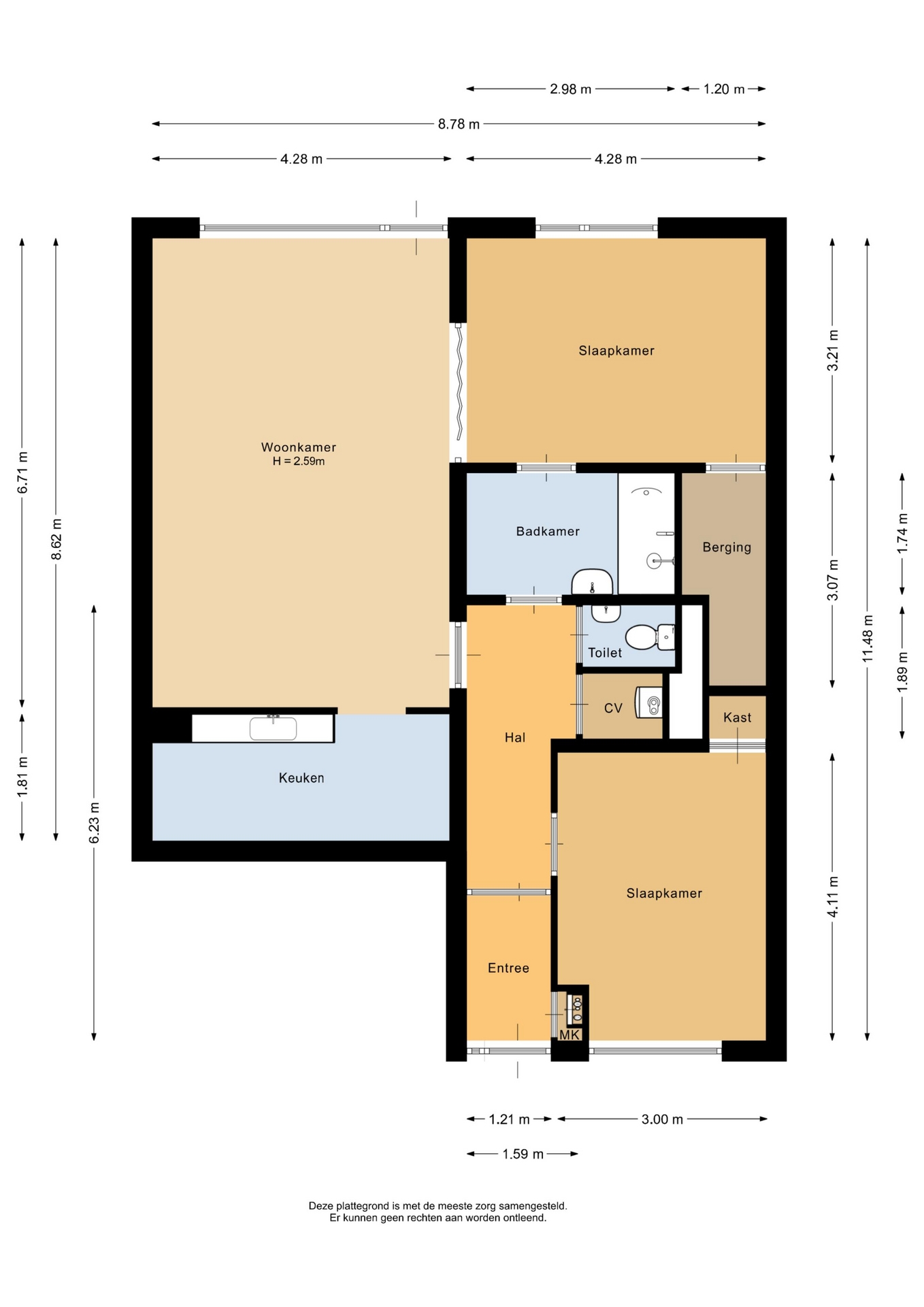 “Deze informatie is door ons met de nodige zorgvuldigheid samengesteld. Onzerzijds wordt echter geen enkele aansprakelijkheid aanvaard voor enige onvolledigheid, onjuistheid of anderszins, dan wel de gevolgen daarvan. Alle opgegeven maten en oppervlakten zijn indicatief.”