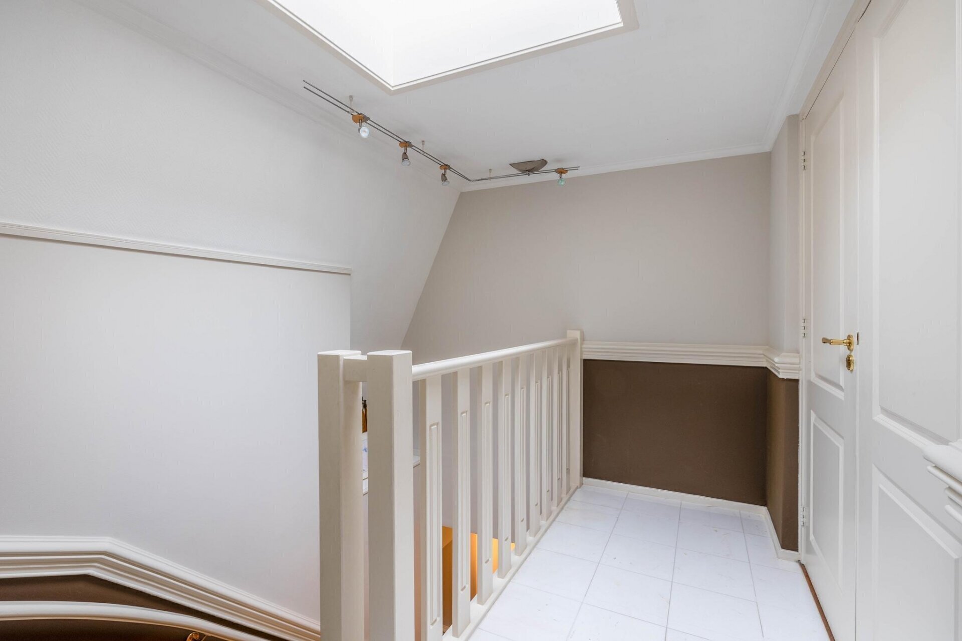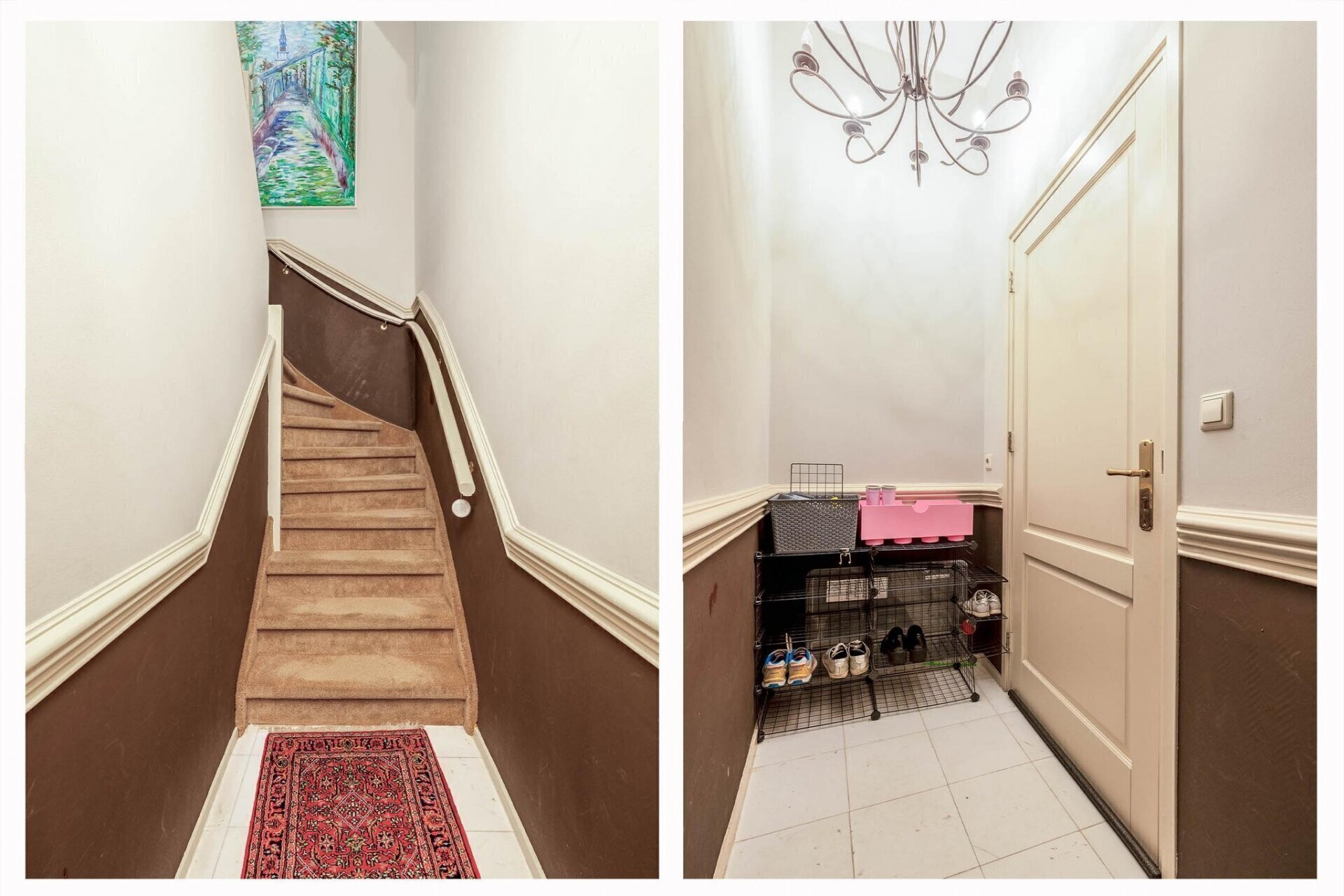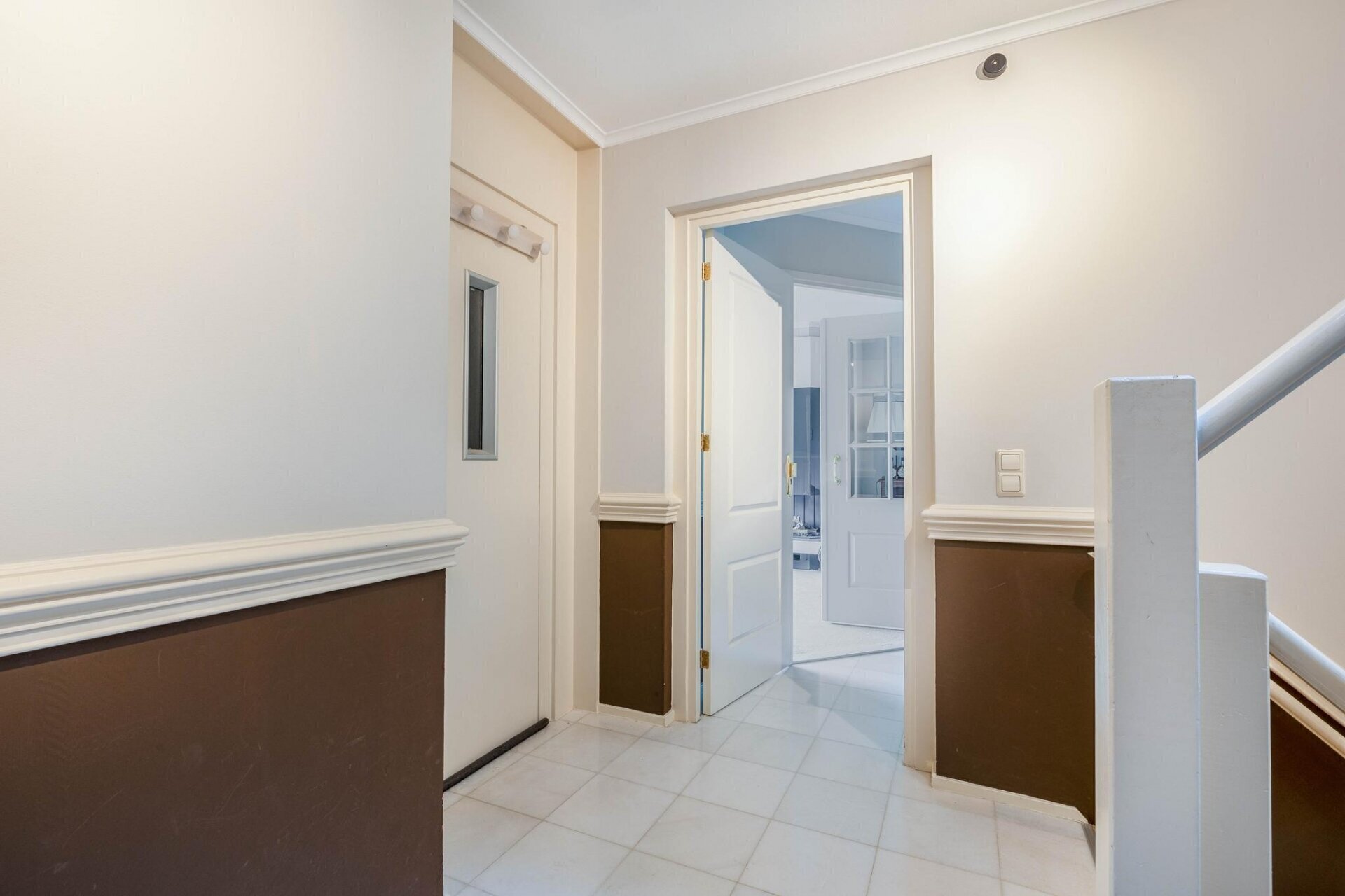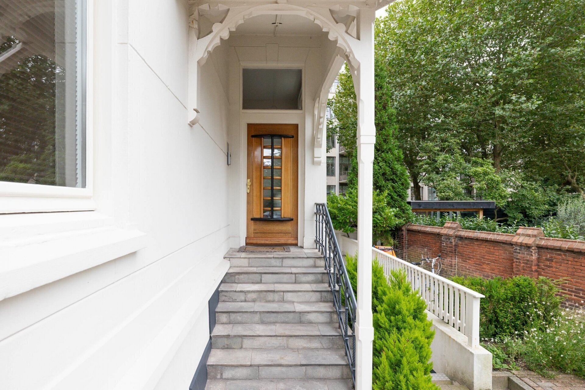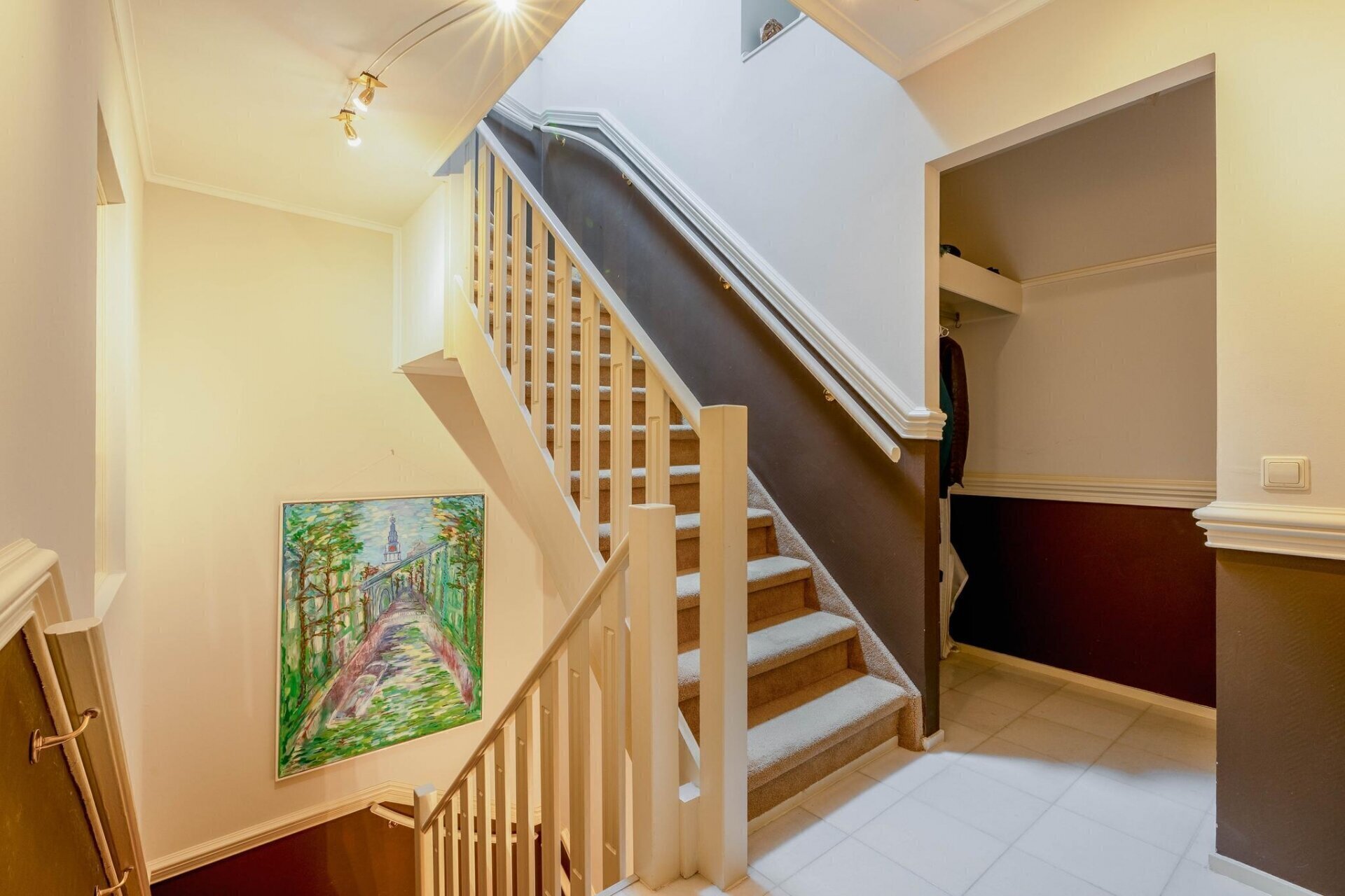Oprit met privé-parkeerplaats. Trap naar de centrale hal. Trap naar de derde verdieping.